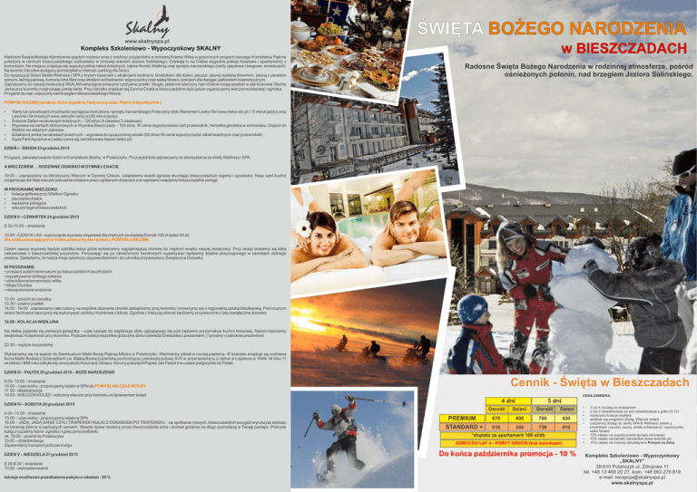 ŚWIĘTA BOŻEGO NARODZENIA Radosne Święta Bożego Narodzenia spędzić możesz wraz z rodziną i przyjaciółmi w zimowej Krainie Wilka w gościnnych progach naszego Kompleksu Pięknie położony w centrum bieszczadzkiego uzdrowiska w zimowej scenerii Jeziora Solińskiego. Czekają tu na Ciebie wygodne pokoje hotelowe i apartamenty z kominkiem. Na miejscu znajduje się wypożyczalnia rakiet śnieżnych, kijków Nordic Walking oraz sprzętu narciarskiego (narty zjazdowe i biegowe, snowboard). Na terenie Ośrodka dostępny jest bezpłatny internet i parking dla Gości. Do dyspozycji Gości Strefa Wellness i SPA z krytym basenem z atrakcjami wodnymi, brodzikiem dla dzieci, jacuzzi, sauną opalaną drewnem, sauną z panelem solnym, łaźnią parową, komorą Infra Red oraz strefami schładzania i wypoczynku oraz salką fitness, pokojem dla dwojga i gabinetem kosmetycznym. Zapraszamy do naszej restauracji SKALNA serwującej smaczne i pożywne posiłki. Długie, jesienne wieczory nasi Goście mogą spędzić w sali klubowej Głucha Jama przy kominku rozgrywając partię darta. Przy ośrodku znajduje się Dymna Chata w bieszczadzkim stylu gdzie organizujemy wieczorne biesiady i ogniska. Przyjedź do nas i odpocznij nad brzegiem Bieszczadzkiego Morza.. w BIESZCZADACH Radosne Święta Bożego Narodzenia w rodzinnej atmosferze, pośród ośnieżonych połonin, nad brzegiem Jeziora Solińskiego. POMYSŁ NA ZIMĘ (atrakcje, które wypełnią Twój wolny czas. Płatne indywidualnie ) ź ź ź ź ź Narty lub snowboard (możliwość wynajęcia instruktora i sprzętu narciarskiego) Polecamy stoki Weremień Lesko-Ski www.lesko-ski.pl ( 15 minut jazdy) oraz Laworta i Gromadzyń www.ustrzyki-narty.pl (30 minut jazdy) Śnieżne Safari na skuterach śnieżnych – 120 zł/os./h (skutery 2-osobowe) Wyprawa na nartach skitourowych w Wysokie Bieszczady – 100 zł/os. W cenie wypożyczenie nart,przewodnik, herbatka góralska w schronisku. Dojazd do Wetliny we własnym zakresie. Szlakiem Łemka na rakietach śnieżnych – wyprawa do opuszczonej wioski (50 zł/os) W cenie wypożyczenie rakiet śnieżnych oraz przewodnik) Aqua Park Aquarius w Lesku (cena wg cennika www.basen.lesko.pl) DZIEŃ I – ŚRODA 23 grudzień 2015 Przyjazd, zakwaterowanie Gości w Kompleksie Skalny w Polańczyku. Po przyjeździe zapraszamy do skorzystania ze strefy Wellness i SPA. A WIECZOREM … RODZINNE OGNISKO W DYMNEJ CHACIE 19.00 – zapraszamy na klimatyczny Wieczór w Dymnej Chacie. Usiądziemy wokół ogniska słuchając bieszczadzkich legend i opowieści. Nasz szef kuchni zorganizuje dla Was wieczór pieczenia chleba w piecu opalanym drewnem a w wędzarni uwędzimy bieszczadzkie pstrągi. W PROGRAMIE WIECZORU: kolacja grillowa przy Wielkim Ognisku pieczenie chleba wędzenie pstrągów wieczór legend bieszczadzkich ź ź ź ź DZIEŃ II – CZWARTEK 24 grudzień 2015 8.30-10.00 – śniadanie 10.00 –CZAS W LAS - rozpoczęcie wyprawy (wyprawa dla chętnych za dopłatą Dorośli 100 zł dzieci 50 zł) Dla osób pozostających w hotelu polecamy skorzystać z POMYSŁU NA ZIMĘ Celem naszej wyprawy będzie szkółka leśna gdzie wybierzemy najpiękniejszą choinkę do ciepłych wnętrz naszej restauracji. Przy okazji dowiemy się kilka ciekawostek o bieszczadzkiej przyrodzie. Poruszając się po ośnieżonych bezdrożach wypatrywać będziemy śladów przyczajonego w zaroślach dzikiego zwierza. Zakładamy, że nasza misja zakończy się powodzeniem i do ośrodka przywieziemy Świąteczne Drzewko. W PROGRAMIE: • przejazd autami terenowymi po bieszczadzkich bezdrożach • wypatrywanie dzikiego zwierza • słów kilka na temat misia i wilka • Misja Choinka • niezapomniane wrażenia 13.00 – powrót do ośrodka 13.30 – postny posiłek 14.00 - 16.00 - zapraszamy całe rodziny na wspólne ubieranie choinki zasiądziemy przy kominku i zmierzymy się z regionalną sztuką bibułkarską. Pod czujnym okiem fachowca nauczymy się wykonywać ozdoby choinkowe z bibuły. Zgodnie z tradycją ubierać będziemy przywiezione z lasu świąteczne drzewko. 18.00 - KOLACJA WIGILIJNA Na niebie pojawiła się pierwsza gwiazdka – czas zasiąść do wigilijnego stołu uginającego się pod ciężarem przysmaków kuchni kresowej. Razem będziemy świętować i kolędować przy kominku. Podczas kolacji wszystkie grzeczne dzieci odwiedzi Gwiazdka z prezentami. (*prosimy o zabranie prezentów) 23.30 – wyjście na pasterkę Wybierzemy się na spacer do Sanktuarium Matki Bożej Pięknej Miłości w Polańczyku. Weźmiemy udział w nocnej pasterce. W kościele znajduje się cudowna Ikona Matki Boskiej z Dzieciątkiem zw. Matką Boską Łopieńską pochodzącą z pierwszej połowy XVII w. przeniesioną tu z cerkwi w Łopience w 1949r. W dniu 11 września 1999 roku odbyła się uroczystość Koronacji Obrazu. Korony poświęcił Papież Jan Paweł II w czasie pielgrzymki do Polski. DZIEŃ III – PIĄTEK 25 grudzień 2015 – BOŻE NARODZENIE Cennik - Święta w Bieszczadach 9.00- 10.00 – śniadanie 10.00 – czas wolny - proponujemy relaks w SPA lub POMYSŁ NA CZAS WOLNY 17.00 - obiadokolacja 19.00 - WIECZÓR KOLĘD - rodzinny wieczór przy kominku ze śpiewaniem kolęd. CENA ZAWIERA: 4 dni DZIEN IV – SOBOTA 26 grudzień 2015 9.00- 10.00 – śniadanie 10.00 – czas wolny - proponujemy relaks w SPA 16.00 – JADĄ, JADĄ SANIE CZYLI TRAPERSKI KULIG Z OGNISKIEM PO TRAPERSKU - na spotkanie nowych, bieszczadzkich przygód wyruszysz siedząc na baraniej skórze w pędzących saniach. Wesoły śpiew niesiony przez bieszczadzkie echo i aromat grzańca na długo pozostaną w Twojej pamięci. Podczas kuligu rozpalimy leśne ognisko i upieczemy kiełbaski. ok. 19.00 – powrót do Polańczyka 19.00 – obiadokolacja Zapewniamy transport podczas kuligu. DZIEN V – NIEDZIELA 27 grudzień 2015 8.30-9.30 – śniadanie 10.00 – wykwaterowanie Istnieje możliwość przedłużenia pobytu z rabatem - 20 % PREMIUM STANDARD + 5 dni Dorośli Dzieci Dorośli