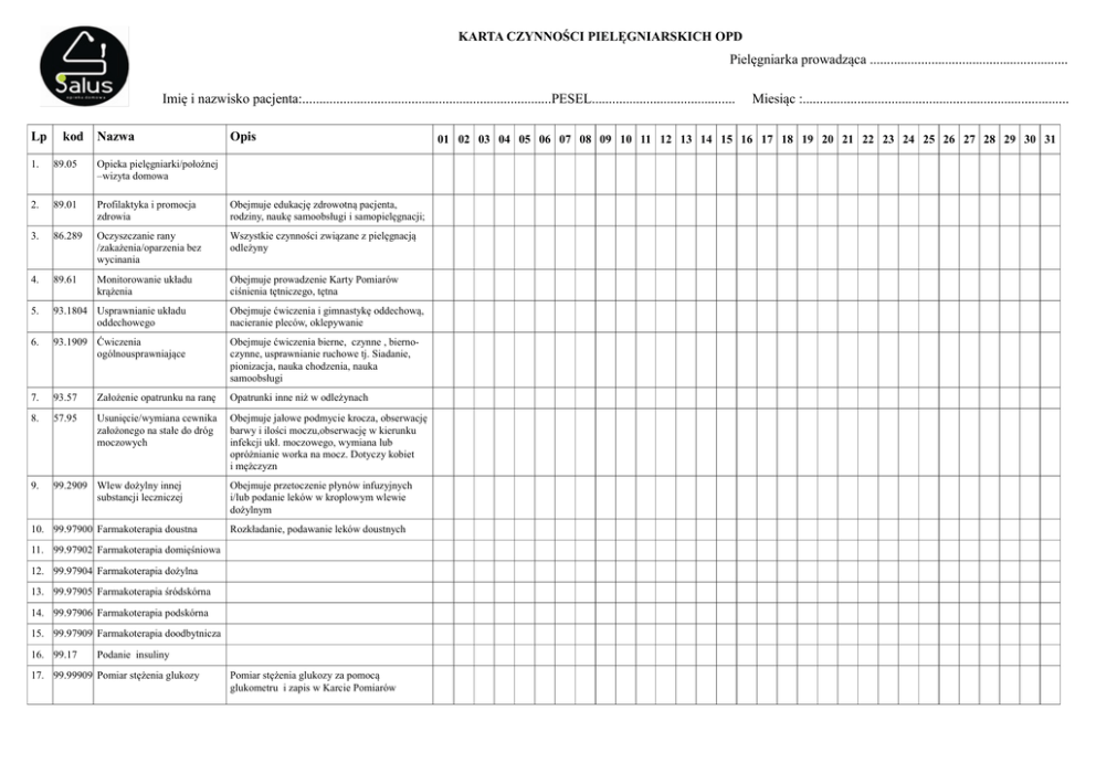 KARTA CZYNNOŚCI PIELĘGNIARSKICH OPD Pielęgniarka prowadząca .......................................................... Imię i nazwisko pacjenta:.........................................................................PESEL.......................................... Lp kod Nazwa Opis 1. 89.05 Opieka pielęgniarki/położnej –wizyta domowa 2. 89.01 Profilaktyka i promocja zdrowia Obejmuje edukację zdrowotną pacjenta, rodziny, naukę samoobsługi i samopielęgnacji; 3. 86.289 Oczyszczanie rany /zakażenia/oparzenia bez wycinania Wszystkie czynności związane z pielęgnacją odleżyny 4. 89.61 Monitorowanie układu krążenia Obejmuje prowadzenie Karty Pomiarów ciśnienia tętniczego, tętna 5. 93.1804 Usprawnianie układu oddechowego Obejmuje ćwiczenia i gimnastykę oddechową, nacieranie pleców, oklepywanie 6. 93.1909 Ćwiczenia ogólnousprawniające Obejmuje ćwiczenia bierne, czynne , biernoczynne, usprawnianie ruchowe tj. Siadanie, pionizacja, nauka chodzenia, nauka samoobsługi 7. 93.57 Założenie opatrunku na ranę Opatrunki inne niż w odleżynach 8. 57.95 Usunięcie/wymiana cewnika założonego na stałe do dróg moczowych Obejmuje jałowe podmycie krocza, obserwację barwy i ilości moczu,obserwację w kierunku infekcji ukł. moczowego, wymiana lub opróżnianie worka na mocz. Dotyczy kobiet i mężczyzn 9. 99.2909 Wlew dożylny innej substancji leczniczej 10. 99.97900 Farmakoterapia doustna Obejmuje przetoczenie płynów infuzyjnych i/lub podanie leków w kroplowym wlewie dożylnym Rozkładanie, podawanie leków doustnych 11. 99.97902 Farmakoterapia domięśniowa 12. 99.97904 Farmakoterapia dożylna 13. 99.97905 Farmakoterapia śródskórna 14. 99.97906 Farmakoterapia podskórna 15. 99.97909 Farmakoterapia doodbytnicza 16. 99.17 Podanie insuliny 17. 99.99909 Pomiar stężenia glukozy Pomiar stężenia glukozy za pomocą glukometru i zapis w Karcie Pomiarów Miesiąc :.............................................................................. 01 02 03 04 05 06 07 08 09 10 11 12 13 14 15 16 17 18 19 20 21 22 23 24 25 26 27 28 29 30 31 PROCEDURY DODATKOWE PESEL.......................................... Lp kod Nazwa 18. 93.1811 Drenaż ułożeniowy Opis Obejmuje zastosowanie pozycji ułożeniowy wg wewnętrznego algorytmu postępowania 19. 96.37 Wlewka doodbytnicza 20. 96.39 Wlew przezodbytowy (lewatywa) 21. 96.55 Toaleta dzrzewa oskrzelowego 22. 97.01 Wymiana sondy żołądkowej/ ezofagostomijnej 23. 96.35 Podawanie substancji odżywczych do żołądka Obejmuje założenie sondy, karmienie przez sondę, wymianę sondy żołądkowej/dwunastniczej 24. 99.87 Żywienie dojelitowe Obejmuje podawanie substancji odżywczych przez przetokę odżywczą lub zgłębnik wprowadzony do żołądka, dwunastnicy lub jelita cienkiego 25. 97.891 Usunięcie szwów 26. 99.99902 Badanie temperatury ciała 27. 99.999 Pozostałe procedury- inne Usuwanie (odsysanie) zalegającej wydzieliny mechanicznie z jamy ustnej , rurki tracheostomijnej za pomocą ssaka elektrycznego 01 02 03 04 05 06 07 08 09 10 11 12 13 14 15 16 17 18 19 20 21 22 23 24 25 26 27 28 29 30 31