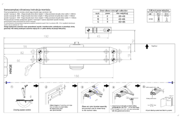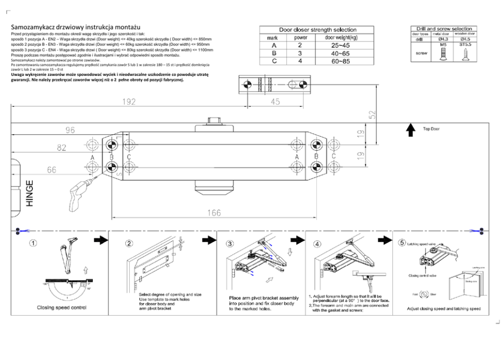 Samozamykacz drzwiowy instrukcja montażu Przed przystąpieniem do montażu określ wagę skrzydła i jego szerokość i tak: sposób 1 pozycja A - EN2 – Waga skrzydła drzwi (Door weight) <= 40kg szerokość skrzydła ( Door width) <= 850mm sposób 2 pozycja B - EN3 - Waga skrzydła drzwi (Door weight) <= 60kg szerokość skrzydła (Door width) <= 950mm sposób 3 pozycja C - EN4 - Waga skrzydła drzwi ( Door weight) <= 80kg szerokość skrzydła (Door width) <= 1100mm Proszę podczas montażu postępować zgodnie i ilustracjami i wybrać odpowiedni sposób montażu. Samozamykacz należy zamontować po stronie zawiasów. Po zamontowaniu samozamykacza regulujemy prędkość zamykania zawór S lub 1 w zakresie 180 – 15 st i prędkość domknięcia zawór L lub 2 w zakresie 15 – 0 st Uwaga wykręcenie zaworów może spowodować wyciek i nieodwracalne uszkodzenie co powoduje utratę gwarancji. Nie należy przekręcać zaworów więcej niż o 2 pełne obroty od pozycji fabrycznej.