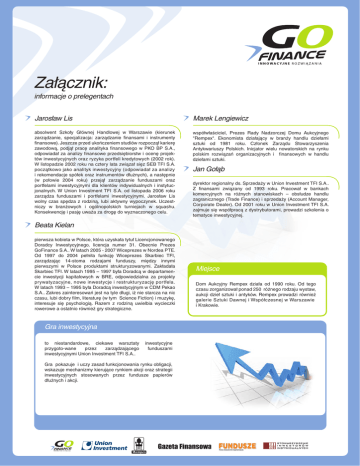Załącznik: informacje o prelegentach Jarosław Lis Marek Lengiewicz absolwent Szkoły Głównej Handlowej w Warszawie (kierunek zarządzanie, specjalizacja: zarządzanie finansami i instrumenty finansowe). Jeszcze przed ukończeniem studiów rozpoczął karierę zawodową, podjął pracę analityka finansowego w PKO BP S.A., odpowiadał za analizy finansowe przedsiębiorstw i ocenę projektów inwestycyjnych oraz ryzyka portfeli kredytowych (2002 rok). W listopadzie 2002 roku na cztery lata związał sięz SEB TFI S.A. początkowo jako analityk inwestycyjny (odpowiadał za analizy i rekomendacje spółek oraz instrumentów dłużnych), a następnie (w połowie 2004 roku) przejął zarządzanie funduszami oraz portfelami inwestycyjnymi dla klientów indywidualnych i instytucjonalnych. W Union Investment TFI S.A. od listopada 2006 roku zarządza funduszami i portfelami inwestycyjnymi. Jarosław Lis wolny czas spędza z rodziną, lubi aktywny wypoczynek. Uczestniczy w branżowych i ogólnopolskich turniejach w squashu. Konsekwencję i pasję uważa za drogę do wyznaczonego celu. współwłaściciel, Prezes Rady Nadzorczej Domu Aukcyjnego "Rempex". Ekonomista działający w branży handlu dziełami sztuki od 1981 roku. Członek Zarządu Stowarzyszenia Antykwariuszy Polskich. Inicjator wielu nowatorskich na rynku polskim rozwiązań organizacyjnych i finansowych w handlu dziełami sztuki. Jan Gołąb dyrektor regionalny ds. Sprzedaży w Union Investment TFI S.A.. Z finansami związany od 1993 roku. Pracował w bankach komercyjnych na różnych stanowiskach – obsłudze handlu zagranicznego (Trade Finance) i sprzedaży (Account Manager, Corporate Dealer). Od 2001 roku w Union Investment TFI S.A. zajmuje się współpracą z dystrybutorami, prowadzi szkolenia o tematyce inwestycyjnej. Beata Kielan pierwsza kobieta w Polsce, która uzyskała tytuł Licencjonowanego Doradcy Inwestycyjnego, licencja numer 31. Obecnie Prezes GoFinance S.A.. W latach 2005 - 2007 Wiceprezes w Nordea PTE. Od 1997 do 2004 pełniła funkcję Wiceprezes Skarbiec TFI, zarządzając 14-stoma rodzajami funduszy, między innymi pierwszymi w Polsce produktami strukturyzowanymi. Zakładała Skarbiec TFI. W latach 1995 – 1997 była Doradcą w departamencie inwestycji kapitałowych w BRE, odpowiedzialna za projekty prywatyzacyjne, nowe inwestycje i restrukturyzację portfela. W latach 1993 – 1995 była Doradcą inwestycyjnym w CDM Pekao S.A.. Zakres zainteresowań jest na tyle długi, iż nie starcza na nic czasu, lubi dobry film, literaturę (w tym Science Fiction) i muzykę, interesuje się psychologią. Razem z rodziną uwielbia wycieczki rowerowe a ostatnio również gry strategiczne. Gra inwestycyjna to niestandardowe, ciekawe warsztaty przygoto-wane przez zarządzającego inwestycyjnymi Union Investment TFI S.A.. inwestycyjne funduszami Gra pokazuje i uczy zasad funkcjonowania rynku obligacji, wskazuje mechanizmy kierujące rynkiem akcji oraz strategii inwestycyjnych stosowanych przez fundusze papierów dłużnych i akcji. Miejsce Dom Aukcyjny Rempex działa od 1990 roku. Od tego czasu zorganizował ponad 250 różnego rodzaju wystaw, aukcji dzieł sztuki i antyków. Rempex prowadzi również galerie Sztuki Dawnej i Współczesnej w Warszawie i Krakowie.
