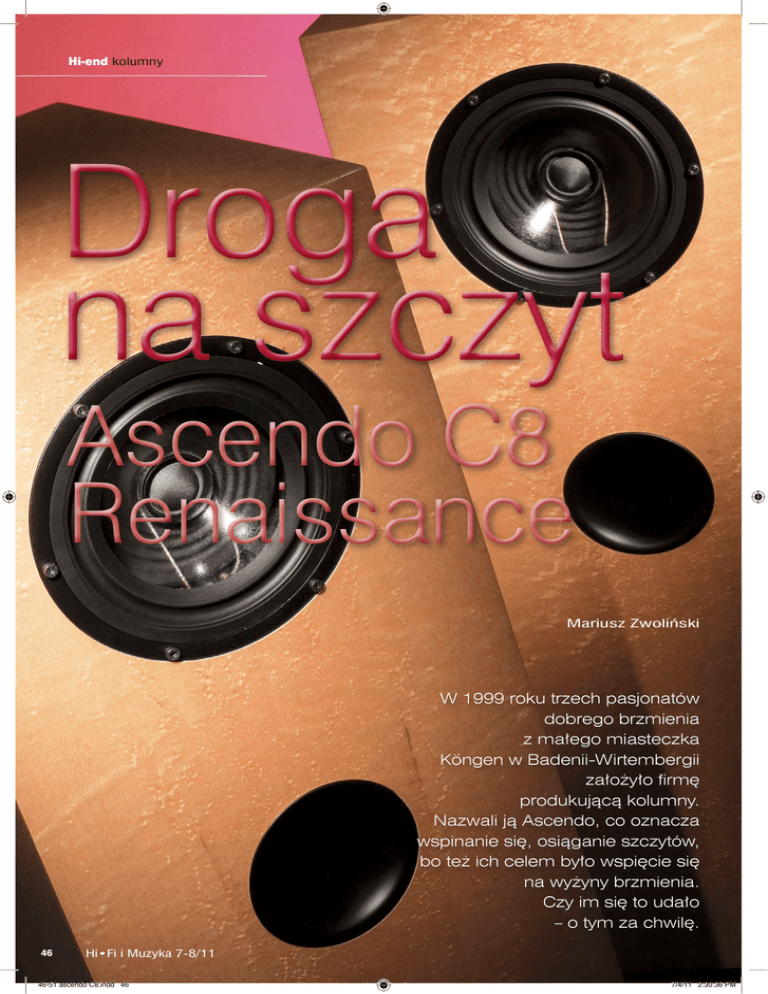 Hi-end Droga na szczyt Ascendo C8 Renaissance W 1999 roku trzech pasjonatów dobrego brzmienia Köngen w Badenii-Wirtembergii 46 46-51 ascendo C8.indd 46 7/4/11 2:30:36 PM Hi-end ktualna oferta Ascendo liczy niespełna tuzin kolumn, wśród których przeważają podłogówki. Wbrew pozorom nie są to tylko starannie wykonane audiofilskie cacka, adresowane do majętnych snobów, lecz kryją w sobie zaawansowane technologie nieczęsto spotykane nawet wśród high-endowych wynalazków. Poza produkcją kolumn firma zajmuje się aktywną korekcją akustyki pomieszczeń, co lokuje ją w ekskluzywnym klubie wysokiej klasy fachowców. Testowany dziś model C8 Renaissance jest produkowany od pięciu lat. Jak na standardy obowiązujące w świecie hi-fi – z daleka zalatuje naftaliną. Projektanci Ascendo wychodzą jednak z założenia, że dobrze zaprojektowany sprzęt starzeje się powoli i najwyraźniej mają rację. Podobne podejście prezentują choćby Magnepan, Thiel czy Vandersteen. Budowa Już pierwszy kontakt z Renaissance zapowiada niespodzianki. Choć to tylko para dużych monitorów, do rozpakowania mamy cztery pokaźne kartony. Dwa z nich mieszczą podstawki, pozostałe dwa – skrzynie z głośnikami. Przed rozpoczęciem instalacji warto poprosić o pomoc drugą osobę. Jako że audiofilia jest najczęściej męskim schorzeniem samotniczym, tzw. single będą mieli okazję do zadzierzgnięcia dobrosąsiedzkich stosunków z przedstawicielkami płci przeciwnej. Kiedyś chodziło się pożyczyć szklankę mąki, ale dziś każdy pretekst jest dobry. Później wspólne odsłuchy, dyskusje o muzyce i a nuż coś się z tego wykluje? To jednak pieśń przyszłości; na razie trzeba się skupić na poprawnym złożeniu kolumn. Trudność polega na tym, że pomiędzy obudową a cokołem należy umieścić pięć ciężkich krążków z twardej gumy, pełniących rolę absorberów. Z pozoru to nie problem, ponieważ na górnej powierzchni cokołów i w dnach obudów wyfrezowano wgłębienia, jednak w czasie ustawiania skrzyń martwe kawałki gumy zaczynają żyć własnym życiem. W dodatku w czasie unoszenia obudów należy uważać na głośniki, gdyż każdy nieostrożny ruch może się źle skończyć. Na szczęście normalny użytkownik przeprowadzi tę operację najwyżej kilka razy w życiu. W cokoły wkręcono masywne stożki z zaokrąglonymi czubkami. Nie radzę się tym sugerować, bowiem C8 Renaissance ważą 46 kg, więc nacisk na centymetr kwadratowy pokona każdy parkiet. Pod względem jakości wykonania obudowy niemieckich kolumn nie ustępują najbardziej renomowanym stolarniom w tej części Drogi Mlecznej. Całość sprawia wrażenie monolitycznego kloca. Wszystkie łączenia wykonano wyjątkowo dokładnie, a zestawienie lakieru fortepianowego ze szlachetnym drewnem wygląda obłędnie. Obudowy sklejono z płyt MDF o grubości 22 mm i obficie wytłumiono płatami watoliny. Do wykończenia użyto forniru z klonu „ptasie oko”, który pociągnięto kilkoma warstwami lakieru. Testowana para kosztuje 25,5 kzł, ale ostateczna cena będzie zależała od wykończenia (do wyboru mamy kilka gatunków naturalnych oklein oraz czarny lakier fortepianowy). Wprawdzie głośników nie chronią maskownice, ale obudowy zapakowano w mocne workowate pokrowce z białej fizeliny. Nałożone na kolumny nie szpecą ich, a ponadto cenne przetworniki są odporne na zakusy ciekawskich kotów. Sprawdziłem w praktyce. Z odległości kilku kroków Ascendo wyglądają intrygująco, nawet jak na high-endowe standardy. Niecodzienne proporcje pomiędzy podstawkami a skrzyniami zdecydowanie wyróżniają je na tle konkurencji, a oliwy do ognia dolewa tylko jeden głośnik widoczny na froncie. Czyżby (tfu!) szerokopasmowy? Jednak nie. Bliższe oględziny wykazują zastosowanie koncentrycznego średnio-wysokotonowego przetwornika Seas Prestige. Spośród podobnych konstrukcji wyróżnia go średniotonowa membrana z kompozytu XP, której nadano kształt szerokiej tuby. Powinna poprawić rozpraszanie wysokich tonów generowanych przez centralnie osadzoną kopułkę. Oba magnesy są ekranowane. Kosze mocuje się do ścianek za pomocą śrub wpuszczanych w nagwintowane tuleje, co zapobiega deformacji otworów przy okazji wykręcania przetworników. 47 46-51 ascendo C8.indd 47 7/4/11 2:30:38 PM Hi-end Koncentryczny Seas pracuje w komorze zamkniętej, skąd więc u licha wziął się na froncie wylot rury bas-refleksu? Rzut oka do materiałów producenta zdradza tajemnicę. Dolną część obudowy rozdzielono na dwie części. To specjalność zakładu, czyli obudowa pasmowo-przepustowa. Pracuje w niej 21-cm woofer z membraną kewlarową. Górna komora jest wentylowana rzeczoną rurą. Z tyłu ukryto jeszcze jeden głośnik – wstęgę amerykańskiej firmy Swans. Jest to swoisty wysokotonowy „dopalacz”, ak- tywowany małym pstryczkiem na tablicy z gniazdami. Jak należy się domyślać, rola dodatkowego tweetera, nazwanego przez Ascendo TOS, polega na generowaniu obszernej sceny stereofonicznej rozciągniętej za linią kolumn. Ortodoksyjni audiofile zapałają w tym miejscu oburzeniem i właśnie dla nich przygotowano wyłącznik. Po dezaktywacji TOS-a C8 Renaissance zmieniają się w normalne monitory. Kolumny Ascendo to konstrukcja cztero- albo trójdrożna, w zależności od tego, czy wstęga jest włączona, czy nie. Nie spodziewałem się zatem minimalistycznej zwrotnicy, ale to, co zobaczyłem po odkręcenia dna obudowy, bardziej przypominało szpiegowską radiostację z czasów zimnej wojny niż element zespołu głośnikowego. Zresztą, spójrzcie na zdjęcie. C8 Renaissance dysponują skutecznością 88 dB i nie powinny być wyma- gające wobec wzmacniaczy. Taki wniosek można wysnuć po pobieżnej analizie tabeli danych technicznych, co tylko potwierdza audiofilską zasadę mówiącą, że o zakupie powinny decydować odsłuchy. Okazuje się bowiem, że podłączanie do nich średniej klasy p