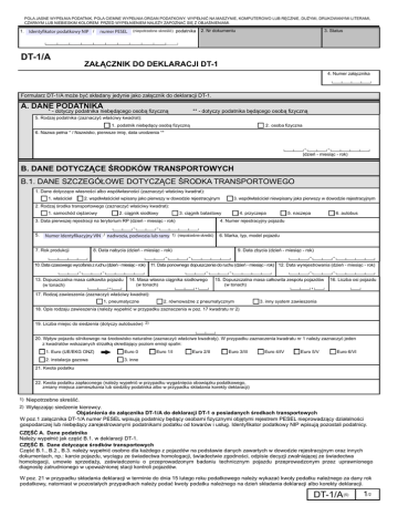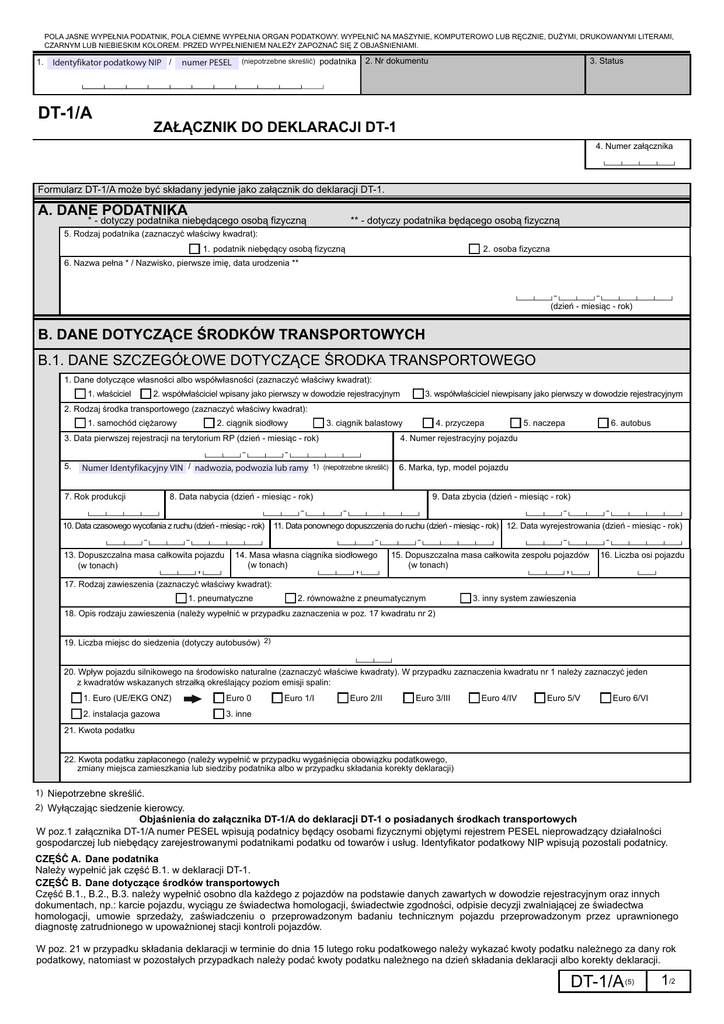 POLA JASNE WYPEŁNIA PODATNIK, POLA CIEMNE WYPEŁNIA ORGAN PODATKOWY. WYPEŁNIĆ NA MASZYNIE, KOMPUTEROWO LUB RĘCZNIE, DUŻYMI, DRUKOWANYMI LITERAMI, CZARNYM LUB NIEBIESKIM KOLOREM. PRZED WYPEŁNIENIEM NALEŻY ZAPOZNAĆ SIĘ Z OBJAŚNIENIAMI. 1. Identyfikator podatkowy NIP / numer PESEL (niepotrzebne skreślić) podatnika 2. Nr dokumentu 3. Status └────┴────┴────┴────┴────┴────┴────┴────┴────┴────┴────┘ └────┴────┴────┴────┴────┴────┴────┴────┴────┴────┘ DT1/A ZAŁĄCZNIK DO DEKLARACJI DT1 4. Numer załącznika └───┴───┴───┴───┘ Formularz DT1/A może być składany jedynie jako załącznik do deklaracji DT1. A. DANE PODATNIKA * dotyczy podatnika niebędącego osobą fizyczną ** dotyczy podatnika będącego osobą fizyczną 5. Rodzaj podatnika (zaznaczyć właściwy kwadrat): 1. podatnik niebędący osobą fizyczną 2. osoba fizyczna 6. Nazwa pełna * / Nazwisko, pierwsze imię, data urodzenia ** _ _ └───┴───┘ └───┴───┘ └───┴───┴───┴───┘ (dzień miesiąc rok) B. DANE DOTYCZĄCE ŚRODKÓW TRANSPORTOWYCH B.1. DANE SZCZEGÓŁOWE DOTYCZĄCE ŚRODKA TRANSPORTOWEGO 1. Dane dotyczące własności albo współwłasności (zaznaczyć właściwy kwadrat): 1. właściciel 2. współwłaściciel wpisany jako pierwszy w dowodzie rejestracyjnym 3. współwłaściciel niewpisany jako pierwszy w dowodzie rejestracyjnym 2. Rodzaj środka transportowego (zaznaczyć właściwy kwadrat): 1. samochód ciężarowy 2. ciągnik siodłowy 3. ciągnik balastowy 3. Data pierwszej rejestracji na terytorium RP (dzień miesiąc rok) _ 4. przyczepa 5. naczepa 6. autobus 4. Numer rejestracyjny pojazdu _ └───┴───┘ └───┴───┘ └───┴───┴───┴───┘ 5. Numer Identyfikacyjny VIN / nadwozia, podwozia lub ramy 1) (niepotrzebne skreślić) 7. Rok produkcji 6. Marka, typ, model pojazdu 8. Data nabycia (dzień miesiąc rok) _ └───┴───┴───┴───┘ _ └───┴───┘ └───┴───┘ └───┴───┴───┴───┘ 10. Data czasowego wycofania z ruchu (dzień miesiąc rok) _ 9. Data zbycia (dzień miesiąc rok) _ 11. Data ponownego dopuszczenia do ruchu (dzień miesiąc rok) 12. Data wyrejestrowania (dzień miesiąc rok) _ _ └───┴───┘ └───┴───┘ └───┴───┴───┴───┘ 13. Dopuszczalna masa całkowita pojazdu (w tonach) , _ └───┴───┘ └───┴───┘ └───┴───┴───┴───┘ _ _ └───┴───┘ └───┴───┘ └───┴───┴───┴───┘ 14. Masa własna ciągnika siodłowego (w tonach) , └───┴───┘ └───┘ └───┴───┘ └───┘ _ └───┴───┘ └───┴───┘ └───┴───┴───┴───┘ 15. Dopuszczalna masa całkowita zespołu pojazdów (w tonach) 16. Liczba osi pojazdu , └───┴───┘ └───┘ └───┘ 17. Rodzaj zawieszenia (zaznaczyć właściwy kwadrat): 1. pneumatyczne 2. równoważne z pneumatycznym 3. inny system zawieszenia 18. Opis rodzaju zawieszenia (należy wypełnić w przypadku zaznaczenia w poz. 17 kwadratu nr 2) 19. Liczba miejsc do siedzenia (dotyczy autobusów) 2) └───┴───┘ 20. Wpływ pojazdu silnikowego na środowisko naturalne (zaznaczyć właściwe kwadraty). W przypadku zaznaczenia kwadratu nr 1 należy zaznaczyć jeden z kwadratów wskazanych strzałką określający poziom emisji spalin: 1. Euro (UE/EKG ONZ) Euro 0 2. instalacja gazowa 3. inne Euro 1/I Euro 2/II Euro 3/III Euro 4/IV Euro 5/V Euro 6/VI 21. Kwota podatku 22. Kwota podatku zapłaconego (należy wypełnić w przypadku wygaśnięcia obowiązku podatkowego, zmiany miejsca zamieszkania lub siedziby podatnika albo w przypadku składania korekty deklaracji) 1) Niepotrzebne skreślić. 2) Wyłączając siedzenie kierowcy. Objaśnienia do załącznika DT1/A do deklaracji DT1 o posiadanych środkach transportowych W poz.1 załącznika DT1/A numer PESEL wpisują podatnicy będący osobami fizycznymi objętymi rejestrem PESEL nieprowadzący działalności gospodarczej lub niebędący zarejestrowanymi podatnikami podatku od towarów i usług. Identyfikator podatkowy NIP wpisują pozostali podatnicy. CZĘŚĆ A. Dane podatnika Należy wypełnić jak część B.1. w deklaracji DT1. CZĘŚĆ B. Dane dotyczące środków transportowych Część B.1., B.2., B.3. należy wypełnić osobno dla każdego z pojazdów na podstawie danych zawartych w dowodzie rejestracyjnym oraz innych dokumentach, np.: karcie pojazdu, wyciągu ze świadectwa homologacji, świadectwie zgodności, odpisie decyzji zwalniającej ze świadectwa homologacji, umowie sprzedaży, zaświadczeniu o przeprowadzonym badaniu technicznym pojazdu przeprowadzonym przez uprawnionego diagnostę zatrudnionego w upoważnionej stacji kontroli pojazdów. W poz. 21 w przypadku składania deklaracji w terminie do dnia 15 lutego roku podatkowego należy wykazać kwoty podatku należnego za dany rok podatkowy, natomiast w pozostałych przypadkach należy podać kwoty podatku należnego na dzień składania deklaracji albo korekty deklaracji. DT1/A (5) 1/2 POLA JASNE WYPEŁNIA PODATNIK, POLA CIEMNE WYPEŁNIA ORGAN PODATKOWY. WYPEŁNIĆ NA MASZYNIE, KOMPUTEROWO LUB RĘCZNIE, DUŻYMI, DRUKOWANYMI LITERAMI, CZARNYM LUB NIEBIESKIM KOLOREM. PRZED WYPEŁNIENIEM NALEŻY ZAPOZNAĆ SIĘ Z OBJAŚNIENIAMI. B.2. DANE SZCZEGÓŁOWE DOTYCZĄCE ŚRODKA TRANSPORTOWEGO 1. Dane dotyczące własności albo współwłasności (zaznaczyć właściwy kwadrat): 1. właściciel 2