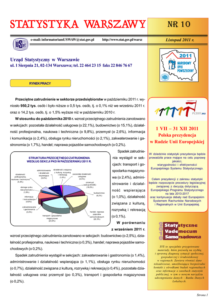 STATYSTYKA WARSZAWY e-mail: [email protected] http://www.stat.gov.pl/warsz NR 10 Listopad 2011 r. Urz d Statystyczny w Warszawie ul. 1 Sierpnia 21, 02-134 Warszawa; tel. 22 464 23 15 faks 22 846 76 67 RYNEK PRACY Przeci tne zatrudnienie w sektorze przedsi biorstw w pa dzierniku 2011 r. wynios o 950,2 tys. osób i by o ni sze o 0,5 tys. osób, tj. o 0,1% ni we wrze niu 2011 r. oraz o 14,2 tys. osób, tj. o 1,5% wy sze ni w pa dzierniku 2010 r. W stosunku do pa dziernika 2010 r. wzrost przeci tnego zatrudnienia zanotowano w sekcjach: pozosta a dzia alno no us ugowa (o 22,1%), budownictwo (o 15,1%), dzia al- profesjonalna, naukowa i techniczna (o 9,8%), przemys (o 2,6%), informacja i komunikacja (o 2,4%), obs uga rynku nieruchomo ci (o 2,1%), zakwaterowanie i gastronomia (o 1,7%), handel; naprawa pojazdów samochodowych (o 0,2%). Spadek zatrudnienia wyst pi w sek- STRUKTURA PRZECI TNEGO ZATRUDNIENIA WED UG SEKCJI PKD W PA DZIERNIKU 2011 R. dzia alno profesjonalna, naukowa i techniczna (5,9%) administrowanie i dz ia alno ws pieraj ca (9,0%) cjach: transport i go- dz ia alno z wi zana z kultur , rozrywk pozos ta a dzia al no i rekreacj us ugowa (1,6%) (0,5%) spodarka magazynowa (o 2,4%), admini- przem ys (sek cje BCDE) (16,0% ) obs uga rynku nieruchomo c i (1,8%) strowanie i dzia alno budowni ctwo (6,2%) informacja i kom unikacja (9,8%) wspieraj ca (o 1,0%), dzia alno zwi zana z kultur , z akwaterowanie i gas tronom ia (3,0%) transport i gospodarka magazynowa (23,9%) handel; naprawa pojazdów samochodowych (22,3%) 1 VII – 31 XII 2011 Polska prezydencja w Radzie Unii Europejskiej W dziedzinie statystyki prezydencja b dzie prowadzi a prace maj ce na celu popraw jako ci, wiarygodno ci i efektywno ci Europejskiego Systemu Statystycznego. Celem prezydencji z zakresu statystyki dzie rozpocz cie procedury legislacyjnej zwi zanej z decyzj dotycz Europejskiego Programu Statystycznego na lata 2013-2017 oraz kontynuacja debaty nad Europejskim Systemem Rachunków Narodowych i Regionalnych w Unii Europejskiej. rozrywk i rekreacj (o 0,1%). W porównaniu z wrze niem 2011 r. wzrost przeci tnego zatrudnienia zanotowano w sekcjach: budownictwo (o 2,5%), dziaalno profesjonalna, naukowa i techniczna (o 0,3%), handel; naprawa pojazdów samo- chodowych (o 0,2%). Spadek zatrudnienia wyst pi w sekcjach: zakwaterowanie i gastronomia (o 1,4%), administrowanie i dzia alno (o 0,7%), dzia alno alno wspieraj ca (o 1,1%), obs uga rynku nieruchomo ci zwi zana z kultur , rozrywk i rekreacj (o 0,4%), pozosta a dzia- us ugowa oraz przemys (po 0,3%), transport i gospodarka magazynowa (o 0,2%). SVS to specjalnie przygotowane materia y, które pozwol na szybk i sprawn diagnoz sytuacji spo ecznej, gospodarczej i rodowiskowej w regionach. Zawiera równie dane teleadresowe, umo liwiaj ce bezpo redni kontakt z o rodkami bada regionalnych oraz informacje o zasobach statystyki publicznej, w tym o nowym narz dziu udost pniania danych - Banku Danych Lokalnych. Strona 1 RYNEK PRACY (dok.) Podstawowe dane o m.st. Warszawie W ko cu pa dziernika 2011 r. liczba zarejestrowanych bezrobotnych wynios a 40142 osoby i by a o 327 osób, tj. o 0,8% mniejsza ni w ko cu wrze nia 2011 r. i o 2357 osób, tj. o 6,2% wi ksza ni w analogicznym okresie 2010 r. Przeci tne zatrudnienie w sektorze Liczba zarejestrowanych bezrobotnych kobiet wynios a 19657, co stanowi o 49,0% przedsi biorstw w pa dzierniku 2011 r. wynios o 950,2 tys. osób i by o o 1,5% ogó u bezrobotnych (przed miesi cem 48,8%, a przed rokiem 47,8%) i 16,5% bezrobotnych kobiet w województwie mazowieckim. W stosunku do wrze nia 2011 r. liczba wy sze ni przed rokiem. bezrobotnych kobiet zmniejszy a si o 108 osób, tj. o 0,5%, a w stosunku do pa dzierW ko cu pa dziernika 2011 r. liczba zarejestrowanych bezrobotny ch nika 2010 r. zwi kszy a si o 1585 osób, tj. o 8,8%. Stopa bezrobocia rejestrowanego wynosi a 3,6% (we wrze niu 2011 r. wynosi a 3,7%, wynios a 40142 osób i by a o 6,2% a w pa dzierniku 2010 r. 3,3%), rednia w województwie mazowieckim kszta towa a si wi ksza ni na poziomie 9,5% (we wrze niu 2011 r. wynosi a 9,5%, a w pa dzierniku 2010 r. 8,9%), przed rokiem, a stopa bezrobocia ukszta towa a si na poziomie 3,6%. natomiast w kraju na poziomie 11,8% (przed miesi cem 11,8%, a przed rokiem 11,5%). W pa dzierniku 2011 r. zarejestrowano w urz dach pracy 4639 osób bezrobot- Prz eci tne miesi czne wynagro- nych (4957 we wrze niu 2011 r., a 4613 w pa dzierniku 2010 r.). Bezrobotni zarejestro- dzenie brutto w sektorze przedsi - wani stanowili 19,3% ogó u zarejestrowanych bezrobotnych w województwie. biorstw w pa dzierniku 2011 r. wynioo 4897,20 z i by o o 5,6% wy sze ni w pa dzierniku 2010 r. Liczba osób rejestruj cych si po raz pierwszy wynios a 1688 (przed miesi cem 1861), co stanowi o 36,4% ogó u nowo zarejestrowanych bezrobotnych oraz 27,0% zarejestrowanych po raz pierwszy w województwie. Udzia osób zwolnionych z przyczyn dotycz cych zak adu pracy w ród bezrobotnych zarejestrowanych w pa dzierni- Produkcja sprzedana przemys u (w cenach sta ych) w pa dzierniku 2011 r. by a o 5,6% wi ksza ni przed rokiem. ku 2011 r. wyniós 5,6% (w województwie mazowieckim 3,2%), przed miesi cem 5,1%, a przed rokiem 4,6%. W pa dzierniku 2011 r. wyrejestrowano z ewidencji bezrobotnych 4966 osób (4945 we wrze niu 2011 r., a 4837 w pa dzierniku 2010 r.), co stanowi o 20,0% wyrejestrowanych z ewidencji bezrobotnych w województwie mazowieckim. Spo ród wyrejestrowa- Produkcja budowlano-monta owa (w cenach bie cych) w pa dzierniku 2011 r. by a o 3,1% mniejsza ni przed nych bezrobotnych 1772 osoby podj y prac . Ponadto 1844 osoby utraci y status bezrobotnego w wyniku niepotwierdzenia gotowo ci do podj cia pracy. Przyczyn skrelenia z ewidencji by o równie dobrowolne zrezygnowanie ze statusu bezrobotnego, rokiem. rozpocz cie szkolenia lub sta u, nabycie uprawnie do zasi ku lub wiadczenia przedSprzeda detaliczna (w cenach bie- emerytalnego, nabycie praw emerytalnych lub rentowych i inne. cych) zrealizo