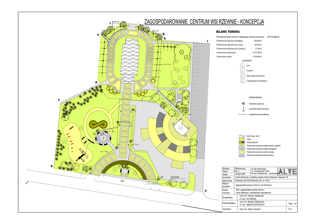 ZAGOSPODAROWANIE CENTRUM WSI RZEWNIE - KONCEPCJA f BILANS TERENU: g e Powierzchnia terernu objętego opracowaniem - 8718,58m2 h i Powierzchnia zabudowy istniejącej - 304,80m2 Powierzchnia zabudowy proj. sceny - 65,34m2 Powierzchnia zabudowy proj. fontanny - 11,00m2 Powierzchnia utwardzona - 4177,50m2 Powierzchnia zieleni - 4159,94m2 LEGENDA: d 1 - Scena 2 - Fontanna 3 - Miejsce utwardzone pod WC przenośne 4 - Cokół pod figurę (do odbudowy) 3 OZNACZENIA c - Oświetlenie ogrodowe - uziemienie słupów końcowych - projektowane linie kablowe 1 - Budynek istniejący - Kościół 2 - Zieleń - Klomby kwiatowe - Powierzchnia utwardzona (kostka brukowa "cegiełka") - Powierzchnia utwardzona (kostka zaokrąglona) - Powierzchnia utwardzona (kamień otoczak) - Powierzchnia utwardzona (kamień łupany) b 4 BranŜa: Faza: Data: Inwestor: STUDNIA CHŁONNA a Elektryczna: P.B. sierpień 2008 07-400 OSTROŁĘKA ul. Gorbatowa 3/18 Firma Projektowo - Budowlana Gmina Rzewnie z siedzibą Urzędu Gminy Rzewnie, Rzewnie 19 Adres bud. Nazwa projektu Rzewnie, 06-225 Rzewnie dz. nr 15/2 Nazwa rysunku Plan zagospodarowania terenu Linie kablowe i oświetlenie zewnętrzne Zagospodarowanie centrum wsi Rzewnie Projektant: Sprawdzający: Asystent: mgr inŜ. Roman Sadłowski nr upr. Os-365/83 mgr inŜ. Bartosz Sadłowski nr upr. MAZ/0152/POOE/07 mgr inŜ. Adam Gryczon Rys. nr E-1