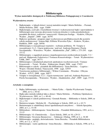 Biblioterapia Wykaz materiałów dostępnych w Publicznej Bibliotece Pedagogicznej w Czarnkowie Wydawnictwa zwarte: 1. Bajkoterapia : o lękach dzieci i nowej metodzie terapii / Maria Molicka . - Poznań, Media Rodzina, 2002 sygn. 33680 2. Bajkoterapia, czyli jak z Guziolkiem tworzyć i wykorzystywać bajki i opowiadania w biblioterapii oraz rozwoju aktywności twórczej dziecka w wieku przedszkolnym : poradnik dla dzieci, rodziców i nauczycieli / Katarzyna Szeliga . - Kraków, Oficyna Wydaw. „Impuls”, 2008 sygn. 36791 3. Bajkowe spotkania : program zajęć wychowawczo-profilaktycznych dla uczniów szkoły podstawowej / Joanna Bąk, Elżbieta Wiewióra-Pyka . - Kraków, Wydaw.. Rubikon, 2009 sygn. 36936 4. Biblioterapia w resocjalizacji więźniów - wybrane problemy. W: Terapia w resocjalizacji. Cz.2 ; Ujęcie praktyczne / pod red. Andrzeja Rejznera i Pawła Szczepaniaka. - Warszawa : Wydaw.. Akademickie „Żak”, 2009, s. 275-295. sygn. 37172 5. Biblioterapia: z zagadnień pomocy niepełnosprawnym użytkownikom książki. T.2 / pod red. Małgorzaty Fedorowicz i Tomasza Kruszewskiego. - Toruń : Wydawnictwo UMK, 2007 sygn. 36771 6. Biblioterapia w działaniach placówek opiekuńczo-wychowawczych / Tomasz Kruszewski . - Toruń : Wydaw.. Edukacyjne Akapit, 2006 sygn. 37453 7. Biblioterapia w szkole : poradnik dla bibliotekarzy / Irena Borecka . - Legnica : Wojew. Ośrodek Doskon. Nauczycieli, 1998 sygn. 32919 8. Teoretyczne podstawy biblioterapii. / Wiktor Czernianin. - Wrocław : Oficyna Wydaw.. ATUT, 2008 sygn. 36877 9. Terapia w resocjalizacji. Cz.1 ; Ujęcie teoretyczne / pod red. Andrzeja Rejznera i Pawła Szczepaniaka. - Warszawa : Wydaw.. Akademickie „Żak”, 2009 sygn. 37172 Artykuły z czasopism: 1. Bajka, biblioterapia, wychowanie… / Marta Pytka . - Opieka Wychowanie Terapia, 2002, nr 4, s. 38-42 1. Bajka jako metoda redukcji lęku u dzieci / Maria Molicka . - Problemy OpiekuńczoWychowawcze, 2001, nr 1, s. 40-44 2. Bajkoterapia w szkole podstawowej / Gromek Renata . - Biblioteka w Szkole, 2009, nr 12, s. 5-6 3. Baśniowa terapia / Molicka M. – Psychologia w Szkole, 2005, nr 4, s. 63-71 4. Baśnioterapia w rehabilitacji dzieci upośledzonych umysłowo . – Szkoła Specjalna, 2005, nr 1, s. 53-58 5. Bibliotekarz - biblioterapeuta / Irena Borecka. - Poradnik Bibliotekarza, 1991, nr 6, s. 13-15 6. Biblioterapia / O. Chmielewska . – Życie Szkoły, 2005, nr 10, s.29-31 7. Biblioterapia / Krystyna Baranowicz . - Edukacja i Dialog, 1999, nr 2, s. 34-40 8. Biblioterapia - poglądy, doświadczenia / Irena Borecka. - Poradnik Bibliotekarza 1991, nr 1-2, s. 10-12 9. Biblioterapia - warto spróbować / Irena Borecka . - Biblioteka w Szkole, 1998, nr 9, s. 11 10. Biblioterapia : bibliografia zalecająca (wybór) / Genowefa Sarniak . - Poradnik Bibliotekarza, 1999, nr 7/8, s. 18 11. Biblioterapia dzieci niepełnosprawnych / Ewa Drawnem . - Poradnik Bibliotekarza 1998, nr 7/8, s. 38-40 12. Biblioterapia jako metoda pedagogiki specjalnej : podsumowanie programu z lat 1989-1996 / Ewa Tomasik . - Szkoła Specjalna, 1998, nr 1, s. 16-20 13. Biblioterapia może pomóc : zestawienie bibliograficzne w wyborze / Ewa Sachalińska . - Biblioteka w Szkole, 2002, nr 2, s. 27 14. Biblioterapia pedagogiczna / Justyna Ewelina Konieczna . - Opieka Wychowanie Terapia, 2003, nr 1, s. 30-33 15. Biblioterapia w podmiotowym podejściu do osób niepełnosprawnych / Agnieszka Andrzejewska . - Opieka Wychowanie Terapia, 2001, nr 1, s. 29-31 16. Biblioterapia w pracy z grupą / K. Chojnacka. - Problemy OpiekuńczoWychowawcze, 2005, nr 2, s. 23 – 26 17. Biblioterapia w szkole czyli o doskonaleniu nauczycieli bibliotekarzy / Irena Borecka . - Biblioteka w Szkole, 2000, nr 9, s. 22-23 18. Biblioterapia z Internetu / Wita Szulc . - Poradnik Bibliotekarza, 2000, nr 11, s. 11-13 19. Czytelnictwo a biblioterapia / Czerwińska M. – Edukacja i Dialog, 2006, nr 8, s. 70-72 20. Edukacja czytelnicza a biblioterapia / Aneta Blaszczyk-Smolec . - Biblioteka w Szkole, 2002, nr 6, s. 4-5 21. Elementy biblioterapii w domach dziecka / Irena Borecka . - Problemy OpiekuńczoWychowawcze, 1995, nr 9, s. 25-27 22. Kiedy boję się szkoły? Metody oddziaływań biblioterapeutycznych minimalizujących lęk i agresję wśród dzieci i młodzieży / Matras-Mastalerz Wanda . - Poradnik Bibliotekarza, 2009, nr 6, s.36-39 23. Kiedy muszę nauczyć się żyć - biblioterapia dzieci niepełnosprawnych intelektualnie / Ippoldt Lidia . - Poradnik Bibliotekarza, 2009, nr 3, s.33-35 24. Książka jako narzędzie terapeutyczne / Tomasz Kruszewski .- Wychowanie Na Co Dzień, 1999, nr 1-2, s.12-13 25. Książka leczy - biblioterapeutyczne działanie książki / Agnieszka Zych, Renata Tuk . Poradnik Bibliotekarza, 2003, nr 6, s. 25-26 26. Książka to drogowskaz na krętych ścieżkach życia, czyli parę słów o biblioterapii / Alicja Leśniak . - Poradnik Bibliotekarza , 2003, nr 6, s. 10-11 27. Leczenie książką / Ellewart B. – Przegląd Oświatowy, 2004, nr 7, s. 13-14 28. Łapanie za słowa, czyli o biblioterapii w pracy z pacjentami psychiatrycznymi. Cz.1 / Agnieszka Pilch . - Arteterapia, 2009, nr 1, s.24-25 29. Łapanie za słowa, czyli o biblioterapii w pracy z pacjentami psychiatrycznymi. Cz.2 / Agnieszka Pilch . - Arteterapia, 2009, nr 2, s.11-15 30. O biblioterapii reminiscencyjnej / Małgorzata Dudzikowska, Ewa Tomasik . - Szkoła Specjalna, 1998, nr 4, s. 279-284 31. Poezjoterapia wzbogaca duchowo / Krzyska S.M. – Edukacja i Dialog, 2004, nr 9, s. 66-69 32. Terapeutyczne aspekty poezji / Krzyska S.M. – Edukacja i Dialog, 2006, nr 8, s. 61-68 33. Terapeutyczny charakter materiałów czytelniczych / Tomasz Kruszewski . - Opieka Wychowanie Terapia, 2000, nr 1 , s. 45-47 34. W świecie bajki : Kotka Fietka w ogrodzie / Justyna Weronko . - Arteterapia, 2008, nr 1, s.4-7 35. W świecie bajki. Kiedy dziecko boi się psa / Justyna Weronko . - Arteterapia, 2008, nr 2, s.9-11 36. Warsztat biblioterapeuty / M. Wiedrowska. - 
