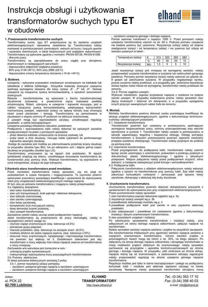 Instrukcja obsługi i użytkowania transformatorów suchych typu ET w obudowie 1. Przeznaczenie transformatorów suchych. Transformatory suche, typu ET przeznaczone są do zasilania urządzeń elektroenergetycznych, sterowania, oświetlenia itp. Transformatory należy montować w pomieszczeniach zamkniętych, wolnych od kurzu i żrących oparów i wyziewów chemicznych, a także bezpiecznych pod względem wybuchowym. Transformatory są wykonane zgodnie z normami: PN-EN 60726, PN-EN 61558. - Warunki pracy. Transformatory są zaprojektowane do pracy ciągłej przy obciążeniu znamionowym w następujących warunkach: - dopuszczalna wilgotność względna powietrza: 80% przy 313K (40°C), 95% przy 298K (25°C) - dopuszczalne zmiany temperatury otoczenia (-10 do +40°C). 2. Budowa. Uzwojenia - wykonane przewodem miedzianym emaliowanym na karkasie lub szkielecie z włókna szklanego.. Wszystkie materiały izolacyjne uzwojenia spełniają wymagania stawiane dla klasy izolacji „E”, „F" lub „H”. Gotowe uzwojenia są nasączone żywicą termoutwardzalną, o wysokich parametrach izolacyjnych. Rdzenie - transformatorów, są wykonane z blachy transformatorowej obustronnie izolowanej, a powierzchnie cięcia malowane powłoką antykorozyjną. Rdzeń, uzbrojony w uzwojenia i kątowniki mocujące, jest w całości nasączony żywicą termoutwardzalną, zwiększającą wytrzymałość mechaniczną uzwojeń, odporność izolacji na wpływy klimatu oraz chroniącą rdzeń przed starzeniem i korozją. Transformatory są zamontowane w obudowach o stopniu ochrony IP podanym na tabliczce znamionowej. Z uzwojeń mogą być wyprowadzone zaczepy, umożliwiające regulację przekładni w stanie beznapięciowym. Uzwojenia posiadają chłodzenie naturalne, powietrzem. Podłączenia i wyprowadzenia kabli należy dokonać do opisanych zacisków przyłączeniowych na jeden z poniższych sposobów: - przez dławnice kablowe umieszczone na ściance czołowej, lub - przez otwór w dnie obudowy, mocując kable cybantami do perforowanego kątownika wewnątrz obudowy. Dostęp do zacisków jest możliwy po zdemontowaniu przedniej ściany obudowy (w przypadku obudów typu BG), lub po odkręceniu uch i zdjęciu górnej części obudowy (w przypadku obudów typu LG). Transformatory umocowane są na łapach (lub podstawie). W łapach (podstawie) znajdują się otwory, umożliwiające mocowanie transformatora do fundamentów przy pomocy śrub. Większe transformatory, są wyposażone w ucha transportowe, służące do jego transportu. 3. Kontrola stanu transformatora przed montażem. Przed montażem transformatora należy sprawdzić, czy nie uległ on uszkodzeniom w czasie transportu i magazynowania. Te czynności powinni wykonywać pracownicy posiadający kwalifikacje i uprawnienia do wykonywania robót przy urządzeniach elektroenergetycznych niskiego napięcia. W tym celu po pobraniu transformatora z magazynu należy przeprowadzić: 3.a. Oględziny zewnętrzne; - stan osłon transformatora, - stan uch transportowych, brak pęknięć i właściwe dokręcenie, - stan tabliczki znamionowej, - stan zacisku uziemiającego, - stan listwy zaciskowej, - kompletność śrub mocujących osłony, - łatwy demontaż ścianki przedniej, - stan uzwojeń transformatora, Zauważone usterki należy usunąć przed podłączeniem napięcia. Jeżeli transformatory są przeznaczone do pracy równoległej, należy w szczególności zwrócić uwagę na: - równość napięć znamionowych (dop. tolerancja ±0,5%) - jednakowe grupy połączeń, - równość przekładni, (dop. tolerancja na zaczepie znam. ±0,5%) - możliwie zbliżone do siebie napięcia zwarcia, (dop. tolerancja ±10%) - stosunek mocy znamionowych, największego i najmniejszego transformatora nie powinien być większy od 3. Dodatkowym zaleceniem jest aby transformator o mocy większej miał niższe napięcie zwarcia od transformatora o mocy mniejszej. Zachowanie w/w warunków jest konieczne w celu : - uniknięcia prądów wyrównawczych, - maksymalnego wykorzystania mocy poszczególnych transformatorów 3.b. Pomiary elektryczne. W skład pomiarów elektrycznych wchodzą 2 próby: 3.b.1. pomiar rezystancji izolacji pomiędzy; - zaciskiem uzwojenia górnego napięcia a zaciskiem uziemiającym - zaciskiem uzwojenia dolnego napięcia a zaciskiem uziemiającym Adres: ul. PCK 22 42-700 Lubliniec - zaciskami uzwojenia górnego i dolnego napięcia Pomiar wykonać induktorem o napięciu 1000 V. Przed pomiarem należy uzwojenia transformatora uziemić na ok. 60 s. Podczas pomiaru uzwojenia nie badane powinny być uziemione. Rezystancja izolacji zależy od stopnia zawilgocenia izolacji i od temperatury izolacji i nie powinna być niższa od wartości podanych w tabeli : Temperatura izolacji Rezystancja izolacji K °C MW 313 40 1,5 303 30 3 293 20 5 283 10 10 Jeżeli rezystancja izolacji jest mniejsza od wymaganej wartości, należy przeprowadzić suszenie transformatora w suszarce lub nadmuchem gorącego powietrza. Ponowny pomiar rezystancji izolacji należy wykonać po upływie ok. 8 godzin od zakończenia suszenia. W przypadku negatywnego wyniku, proces suszenia należy powtórzyć, a w przypadku gdy zmierzona rezystancja izolacji będzie nadal niższa od wymaganej, transformator należy przekazać do remontu. 3.b.2. Pomiar ciągłości uzwojeń ; Wykonać induktorem, poprzez przyłożenie napięcia z induktora na kolejne zaciski uzwojeń. W przypadku stwierdzenia przerw, należy sprawdzić stan złączy śrubowych i dokonać ich dokręcenia, a w przypadku wystąpienia innych przyczyn wewnętrznych oddać trafo do remontu. 4. Montaż. Montażu transformatora powinna dokonać osoba posiadająca kwalifikacje do obsługi urządzeń elektroenergetycznych, zgodnie z dokumentacja technicznoruchową i obowiązującymi przepisami. 4.1. Ustawienie transformatora. Transformator powinien być ustawiony w pomieszczeniu spełniającym wymagania bezpieczeństwa pracy, ochrony przeciwpożarowej or