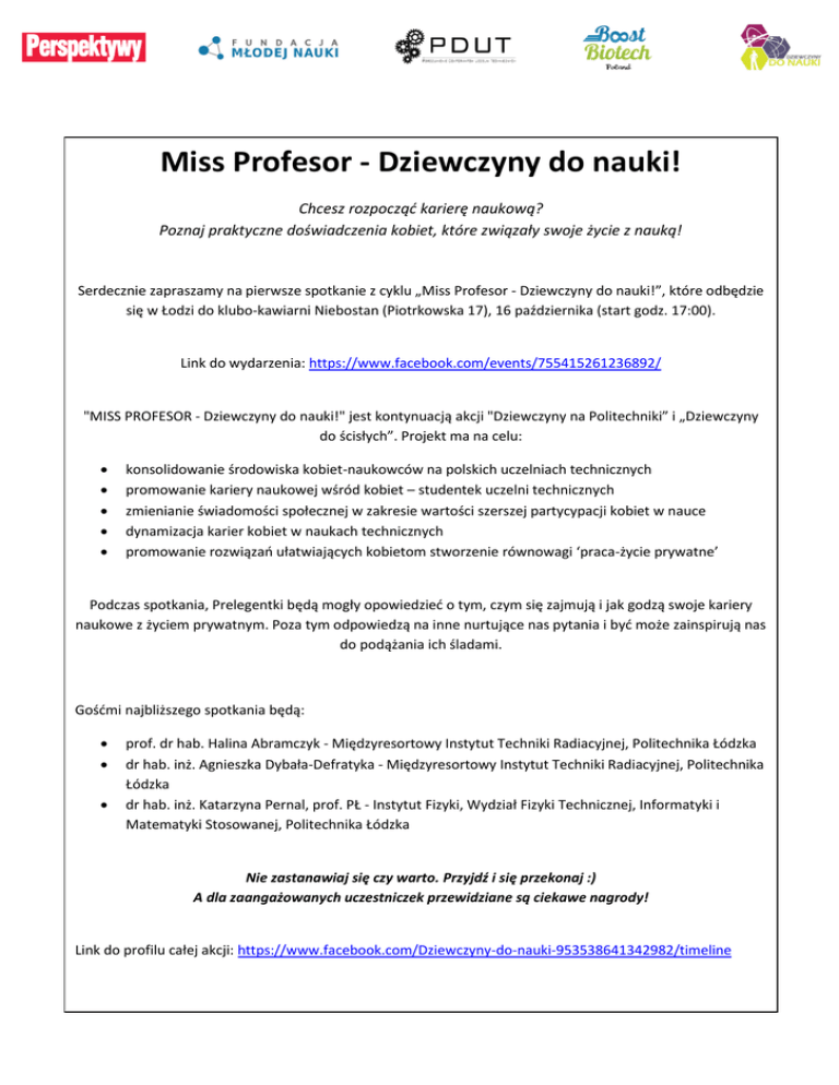 Miss Profesor - Dziewczyny do nauki! Chcesz rozpocząć karierę naukową? Poznaj praktyczne doświadczenia kobiet, które związały swoje życie z nauką! Serdecznie zapraszamy na pierwsze spotkanie z cyklu „Miss Profesor - Dziewczyny do nauki!”, które odbędzie się w Łodzi do klubo-kawiarni Niebostan (Piotrkowska 17), 16 października (start godz. 17:00). Link do wydarzenia: https://www.facebook.com/events/755415261236892/ "MISS PROFESOR - Dziewczyny do nauki!" jest kontynuacją akcji "Dziewczyny na Politechniki” i „Dziewczyny do ścisłych”. Projekt ma na celu: konsolidowanie środowiska kobiet-naukowców na polskich uczelniach technicznych promowanie kariery naukowej wśród kobiet – studentek uczelni technicznych zmienianie świadomości społecznej w zakresie wartości szerszej partycypacji kobiet w nauce dynamizacja karier kobiet w naukach technicznych promowanie rozwiązań ułatwiających kobietom stworzenie równowagi ‘praca-życie prywatne’ Podczas spotkania, Prelegentki będą mogły opowiedzieć o tym, czym się zajmują i jak godzą swoje kariery naukowe z życiem prywatnym. Poza tym odpowiedzą na inne nurtujące nas pytania i być może zainspirują nas do podążania ich śladami. Gośćmi najbliższego spotkania będą: prof. dr hab. Halina Abramczyk - Międzyresortowy Instytut Techniki Radiacyjnej, Politechnika Łódzka dr hab. inż. Agnieszka Dybała-Defratyka - Międzyresortowy Instytut Techniki Radiacyjnej, Politechnika Łódzka dr hab. inż. Katarzyna Pernal, prof. PŁ - Instytut Fizyki, Wydział Fizyki Technicznej, Informatyki i Matematyki Stosowanej, Politechnika Łódzka Nie zastanawiaj się czy warto. Przyjdź i się przekonaj :) A dla zaangażowanych uczestniczek przewidziane są ciekawe nagrody! Link do profilu całej akcji: https://www.facebook.com/Dziewczyny-do-nauki-953538641342982/timeline