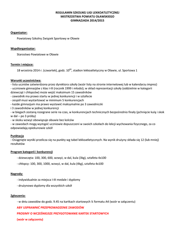 REGULAMIN SZKOLNEJ LIGI LEKKOATLETYCZNEJ MISTRZOSTWA POWIATU OŁAWSKIEGO GIMNAZJADA 2014/2015 Organizator: Powiatowy Szkolny Związek Sportowy w Oławie Współorganizator: Starostwo Powiatowe w Oławie Termin i miejsce: 18 września 2014 r. (czwartek), godz. 1000, stadion lekkoatletyczny w Oławie, ul. Sportowa 1 Warunki uczestnictwa: - lista uczniów zatwierdzona przez dyrektora szkoły (wzór listy na stronie internetowej lub w kalendarzu imprez) - uczniowie gimnazjów z klas I-III (rocznik 1999 i młodsi); w skład reprezentacji szkoły (oddzielnie w kategorii dziewcząt i chłopców) może wejść maksimum 15 zawodników - zawodnik ma prawo startu w jednej konkurencji i w sztafecie - zespół musi wystartować w minimum 5 konkurencjach - każde gimnazjum ma prawo wystawić maksymalnie po 3 zawodniczki i 3 zawodników w jednej konkurencji - w biegach zostaną rozegrane serie na czas, w konkurencjach technicznych bezpośrednio finały (pchnięcie kulą i skok w dal – po 3 próby) - w skoku wzwyż obowiązuje obuwie bez kolców - w zawodach mogą wystąpić uczniowie dopuszczeni w swoich szkołach do lekcji wychowania fizycznego, za co odpowiadają opiekunowie szkół Punktacja - Osiągnięte wyniki przelicza się na punkty wg tabel lekkoatletycznych. Na wynik drużyny składa się 12 (lub mniej) rezultatów Program kategorii i konkurencji - dziewczęta: 100, 300, 600, wzwyż, w dal, kula (3kg), sztafeta 4x100 - chłopcy: 100, 300, 1000, wzwyż, w dal, kula (4kg), sztafeta 4x100 Nagrody: - indywidualnie za miejsca I-III medale i dyplomy - drużynowo dyplomy dla wszystkich szkół Zgłoszenia: - w dniu zawodów do godz. 9.45 na kartkach startowych ¼ formatu A4 (wzór w załączeniu) ABY USPRAWNIĆ PRZEPROWADZENIE ZAWODÓW PROSIMY O WCZEŚNIEJSZE PRZYGOTOWANIE KARTEK STARTOWYCH (wzór w załączeniu) Uwagi techniczne: - zawodnicy i opiekunowie szkół przebywają ze swoimi uczniami na trybunach - na stadionie mogą przebywać wyłącznie zawodnicy aktualnie startujący (organizator zastrzega sobie prawo dyskwalifikacji zawodników utrudniających przeprowadzanie zawodów, w skrajnych przypadkach dyskwalifikacja może dotyczyć całej szkoły) - opiekunów szkół uprasza się o dopilnowanie przestrzegania przez uczniów powyższych zasad - organizator nie zapewnia szatni i nie ponosi odpowiedzialności za straty materialne uczniów - interpretacja niniejszego regulaminu należy do organizatora PROGRAM MINUTOWY 945 - zakończenie zgłaszania zawodników 1000 - 100 K w dal M kula K wzwyż M w dal K kula M wzwyż K 1020 - 100 M 1040 - 300 K 1100 - 300 M 1120 - 600 K 1140 - 1000 M 1200 - sztafeta 4 x 100 K 4 x 100 M UWAGA!!! W trakcie zawodów program minutowy może ulec zmianie. …………………………………………… ……………… Nazwisko i imię zawodnika …………………………………………… Rok urodzenia Szkoła ………………………………………………………….. ……………… Nazwisko i imię zawodnika Szkoła ………………………………………………………….. Wynik I: ……………………….. Miejsce: ………… …………………………… Konkurencja Wynik I: ……………………….. Miejsce: ………… Wynik II: ………………………. Wynik II: ………………………. Wynik III: ……………………… Wynik III: ……………………… Wynik IV: ……………………… Wynik IV: ……………………… Punkty: ...………………………. …………………………… Konkurencja Płeć …………………………………………… ……………… Nazwisko i imię zawodnika Punkty: ...………………………. Płeć …………………………………………… Rok urodzenia Szkoła ………………………………………………………….. Miejsce: ………… ……………… Nazwisko i imię zawodnika Rok urodzenia Szkoła ………………………………………………………….. Wynik I: ……………………….. …………………………… Konkurencja Rok urodzenia Wynik I: ……………………….. Miejsce: ………… Wynik II: ………………………. Wynik II: ………………………. Wynik III: ……………………… Wynik III: ……………………… Wynik IV: ……………………… Wynik IV: ……………………… Punkty: ...………………………. Płeć …………………………… Konkurencja Punkty: ...………………………. Płeć
