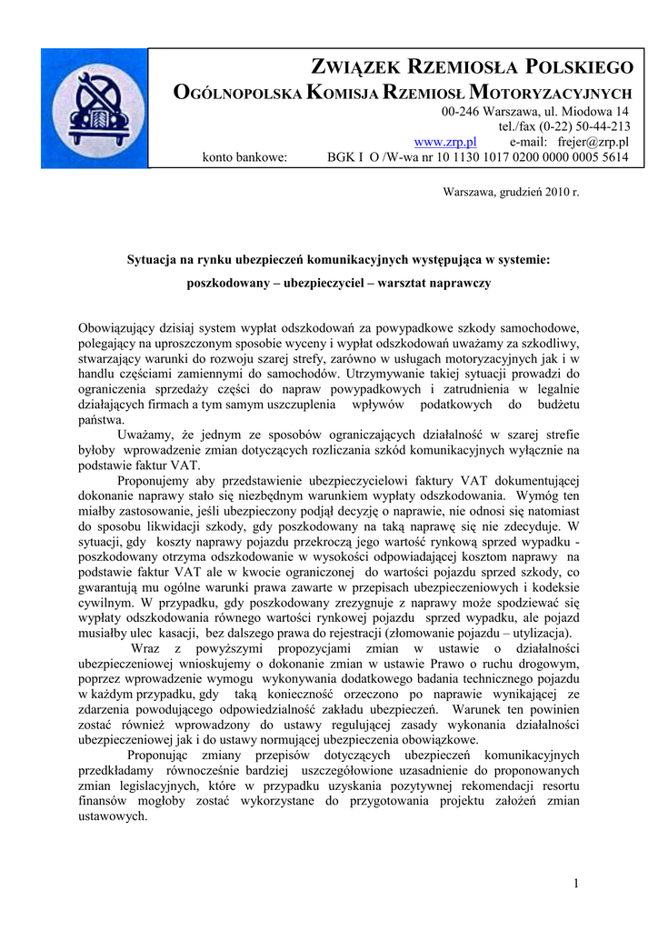 ZWIĄZEK RZEMIOSŁA POLSKIEGO OGÓLNOPOLSKA KOMISJA RZEMIOSŁ MOTORYZACYJNYCH konto bankowe: 00-246 Warszawa, ul. Miodowa 14 tel./fax (0-22) 50-44-213 www.zrp.pl e-mail: [email protected] BGK I O /W-wa nr 10 1130 1017 0200 0000 0005 5614 Warszawa, grudzień 2010 r. Sytuacja na rynku ubezpieczeń komunikacyjnych występująca w systemie: poszkodowany – ubezpieczyciel – warsztat naprawczy Obowiązujący dzisiaj system wypłat odszkodowań za powypadkowe szkody samochodowe, polegający na uproszczonym sposobie wyceny i wypłat odszkodowań uwaŜamy za szkodliwy, stwarzający warunki do rozwoju szarej strefy, zarówno w usługach motoryzacyjnych jak i w handlu częściami zamiennymi do samochodów. Utrzymywanie takiej sytuacji prowadzi do ograniczenia sprzedaŜy części do napraw powypadkowych i zatrudnienia w legalnie działających firmach a tym samym uszczuplenia wpływów podatkowych do budŜetu państwa. UwaŜamy, Ŝe jednym ze sposobów ograniczających działalność w szarej strefie byłoby wprowadzenie zmian dotyczących rozliczania szkód komunikacyjnych wyłącznie na podstawie faktur VAT. Proponujemy aby przedstawienie ubezpieczycielowi faktury VAT dokumentującej dokonanie naprawy stało się niezbędnym warunkiem wypłaty odszkodowania. Wymóg ten miałby zastosowanie, jeśli ubezpieczony podjął decyzję o naprawie, nie odnosi się natomiast do sposobu likwidacji szkody, gdy poszkodowany na taką naprawę się nie zdecyduje. W sytuacji, gdy koszty naprawy pojazdu przekroczą jego wartość rynkową sprzed wypadku poszkodowany otrzyma odszkodowanie w wysokości odpowiadającej kosztom naprawy na podstawie faktur VAT ale w kwocie ograniczonej do wartości pojazdu sprzed szkody, co gwarantują mu ogólne warunki prawa zawarte w przepisach ubezpieczeniowych i kodeksie cywilnym. W przypadku, gdy poszkodowany zrezygnuje z naprawy moŜe spodziewać się wypłaty odszkodowania równego wartości rynkowej pojazdu sprzed wypadku, ale pojazd musiałby ulec kasacji, bez dalszego prawa do rejestracji (złomowanie pojazdu – utylizacja). Wraz z powyŜszymi propozycjami zmian w ustawie o działalności ubezpieczeniowej wnioskujemy o dokonanie zmian w ustawie Prawo o ruchu drogowym, poprzez wprowadzenie wymogu wykonywania dodatkowego badania technicznego pojazdu w kaŜdym przypadku, gdy taką konieczność orzeczono po naprawie wynikającej ze zdarzenia powodującego odpowiedzialność zakładu ubezpieczeń. Warunek ten powinien zostać równieŜ wprowadzony do ustawy regulującej zasady wykonania działalności ubezpieczeniowej jak i do ustawy normującej ubezpieczenia obowiązkowe. Proponując zmiany przepisów dotyczących ubezpieczeń komunikacyjnych przedkładamy równocześnie bardziej uszczegółowione uzasadnienie do proponowanych zmian legislacyjnych, które w przypadku uzyskania pozytywnej rekomendacji resortu finansów mogłoby zostać wykorzystane do przygotowania projektu załoŜeń zmian ustawowych. 1 Wyjaśnienie celu ustawy Projektowane zmiany przepisów mają na celu ochronę prawa konsumenta (poszkodowanego) do rzetelnej naprawy uszkodzonego pojazdu, przyznania mu pełnej rekompensaty za szkodę komunikacyjną. Wprowadzenie tych zmian zmniejszy takŜe zagroŜenia dla ruchu drogowego spowodowane niewłaściwą naprawą pojazdów powypadkowych wykonywaną przez nielegalnie działające warsztaty. Jednym z waŜniejszych skutków nowelizacji będzie ograniczenie szarej strefy w branŜy usług motoryzacyjnych oraz w związku z tym znaczące zwiększenie wpływów podatkowych (oraz składek ubezpieczeniowych) do budŜetu państwa i samorządów terytorialnych. Szacuje się, Ŝe dodatkowe wpływy dla budŜetu państwa i budŜetów lokalnych a takŜe funduszu ubezpieczeń społecznych wyniosą ok. 3-5 mld zł. Przedstawienie stanu obecnego Firmy ubezpieczeniowe działają na podstawie ustawy z dnia 22.05.2003 roku o działalności ubezpieczeniowej i ustawy z dn. 22.05.2003 roku o ubezpieczeniach obowiązkowych, Ubezpieczeniowym Funduszu Gwarancyjnym i Polskim Biurze Ubezpieczycieli Komunikacyjnych. Szkody komunikacyjne rozliczane są w dwóch systemach. Pierwszy polega na tym, Ŝe firmy ubezpieczeniowe rozliczają szkodę komunikacyjną w oparciu o przedstawione faktury VAT dokumentujące naprawę pojazdu. Drugi sposób, to wycena wartości naprawy przez firmę ubezpieczeniową i wypłacenie naleŜności poszkodowanemu - tzw. „wypłata na kosztorys”, bez potrzeby dokumentowania kosztów naprawy. Wypłacone w ten sposób odszkodowanie często jest zaniŜone, nawet do 50% rynkowej wartości usługi naprawczej. Klient otrzymując odszkodowanie po wycenie firmy ubezpieczeniowej poszukuje warsztatu w szarej strefie, posiadającego moŜliwości naprawy pojazdu po zaniŜonych kosztach w oparciu o kwotę odszkodowania wypłaconego przez firmę ubezpieczeniową. Legalnie działające zakłady napraw samochodowych, opłacające podatki oraz składki ubezpieczeniowe od wynagrodzeń zatrudnionych pracowników nie mają moŜliwości podjęcia się naprawy pojazdu za zaniŜone kosztorysowe odszkodowanie wypłacone przez firmę ubezpieczeniową. Sytuacja ta sprzyja rozwojowi szarej strefy, znaczącej w usługach napraw pojazdów. Równocześnie poszkodowani najczęściej nie są świadomi, Ŝe są poddawani manipulacyjnym procedurom zakładów ubezpieczeń. Pracownicy zakładów ubezpieczeń, przekonują ich, Ŝe nie muszą dokumentować kosztów naprawy a na wypłaconym odszkodowaniu jeszcze uzyskają nadwyŜkę, jeśli znajdą firmę, która wykona naprawę za kwotę wypłaconą przez ubezpieczyciela. W tej sytuacji poszkodowany moŜe jedynie naprawić pojazd w strefie poza legalnie działającymi zakładami. W opisanym systemie rozliczeń kosztorysowych, stanowiących ponad 50% wszystkich szkód komunikacyjnych (dane z firm ubezpieczeniowych) - traci klient (poszkodowany) oraz Skarb Państwa i samorząd terytorialny a zyskuje szara strefa. Taki stan rzeczy zagraŜa takŜe zdrowiu i 