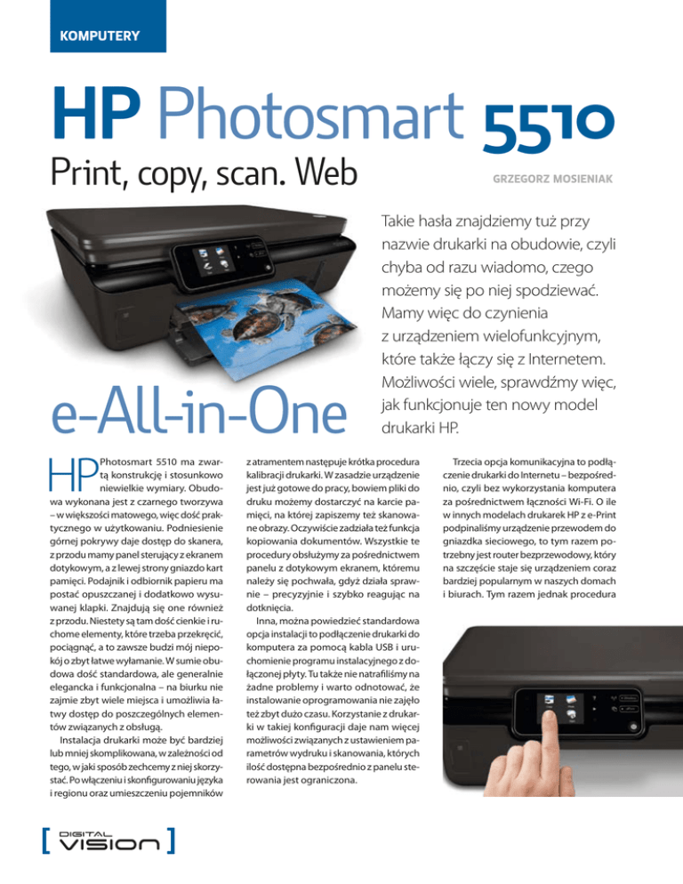KOMPUTERY HP Photosmart 5510 Print, copy, scan. Web e-All-in-One HP Photosmart 5510 ma zwartą konstrukcję i stosunkowo niewielkie wymiary. Obudowa wykonana jest z czarnego tworzywa – w większości matowego, więc dość praktycznego w użytkowaniu. Podniesienie górnej pokrywy daje dostęp do skanera, z przodu mamy panel sterujący z ekranem dotykowym, a z lewej strony gniazdo kart pamięci. Podajnik i odbiornik papieru ma postać opuszczanej i dodatkowo wysuwanej klapki. Znajdują się one również z przodu. Niestety są tam dość cienkie i ruchome elementy, które trzeba przekręcić, pociągnąć, a to zawsze budzi mój niepokój o zbyt łatwe wyłamanie. W sumie obudowa dość standardowa, ale generalnie elegancka i funkcjonalna – na biurku nie zajmie zbyt wiele miejsca i umożliwia łatwy dostęp do poszczególnych elementów związanych z obsługą. Instalacja drukarki może być bardziej lub mniej skomplikowana, w zależności od tego, w jaki sposób zechcemy z niej skorzystać. Po włączeniu i skonfigurowaniu języka i regionu oraz umieszczeniu pojemników Grzegorz Mosieniak Takie hasła znajdziemy tuż przy nazwie drukarki na obudowie, czyli chyba od razu wiadomo, czego możemy się po niej spodziewać. Mamy więc do czynienia z urządzeniem wielofunkcyjnym, które także łączy się z Internetem. Możliwości wiele, sprawdźmy więc, jak funkcjonuje ten nowy model drukarki HP. z atramentem następuje krótka procedura kalibracji drukarki. W zasadzie urządzenie jest już gotowe do pracy, bowiem pliki do druku możemy dostarczyć na karcie pamięci, na której zapiszemy też skanowane obrazy. Oczywiście zadziała też funkcja kopiowania dokumentów. Wszystkie te procedury obsłużymy za pośrednictwem panelu z dotykowym ekranem, któremu należy się pochwała, gdyż działa sprawnie – precyzyjnie i szybko reagując na dotknięcia. Inna, można powiedzieć standardowa opcja instalacji to podłączenie drukarki do komputera za pomocą kabla USB i uruchomienie programu instalacyjnego z dołączonej płyty. Tu także nie natrafiliśmy na żadne problemy i warto odnotować, że instalowanie oprogramowania nie zajęło też zbyt dużo czasu. Korzystanie z drukarki w takiej konfiguracji daje nam więcej możliwości związanych z ustawieniem parametrów wydruku i skanowania, których ilość dostępna bezpośrednio z panelu sterowania jest ograniczona. Trzecia opcja komunikacyjna to podłączenie drukarki do Internetu – bezpośrednio, czyli bez wykorzystania komputera za pośrednictwem łączności Wi-Fi. O ile w innych modelach drukarek HP z e-Print podpinaliśmy urządzenie przewodem do gniazdka sieciowego, to tym razem potrzebny jest router bezprzewodowy, który na szczęście staje się urządzeniem coraz bardziej popularnym w naszych domach i biurach. Tym razem jednak procedura 12/13 instalacji wymaga trochę więcej zabiegów, których kolejność wyznaczają komunikaty wyświetlane na ekranie drukarki. Podłączenie do sieci na ogół wymaga podania klucza, którego wpisanie umożliwia wyświetlana klawiatura. Tu szczególnie sprawdziła się precyzja ekranu dotykowego. Niemiłym zaskoczeniem był jednak brak możliwości zapamiętania wpisanego klucza i konieczność powtórzenia żmudnej procedury „wklepywania” długiego ciągu liter i cyfr, gdy uruchomiłem drukarkę na drugi dzień. Aby dokończyć konfigurowanie trzeba jeszcze (ale to już przy użyciu komputera) połączyć się z witryną ePrintCenter, gdzie utworzymy nasze konto i ustalimy adres e-mail naszej drukarki. Po zalogowaniu się uzyskujemy dostęp do kilku podstawowych opcji. Możemy ustalić akceptowanych nadawców, od których przesyłki będą drukowane, ustawić zasadnicze parametry druku i włączyć lub nie usługę drukowania w chmurze firmy Google. Działa ona z usługą HP ePrintCenter i umożliwia drukowanie dokumentów z serwisu Google Docs i Gmail bezpośrednio na drukarce. Warto w tym miejscu wspomnieć, jaki jest zasadniczy pożytek z drukarki HP będącej internetową końcówką. Przede wszystkim drukarka nie musi być podłączona do komputera, po drugie – nie musimy instalować żadnego sterownika, po trzecie – wysłać do druku możemy dokumenty z dowolnego urządzenia obsługującego pocztę elektroniczną – iPoda, iPhone`a lub innego telefonu typu smartfon, komputera stacjonarnego, laptopa czy netbooka. Działa to w ten sposób, że pod unikalny adres e-mail przypisany drukarce wysyłane są dokumenty jako załączniki do listów elektronicznych. Drukowane mogą być także same e-maile. Dzięki temu możemy drukować służbowe dokumenty będąc z dala od siedziby firmy. Wysyłane maile i dokumenty przetwarzane są przez specjalne serwery HP, które dalej przesyłają (również drogą mailową) plik, przekształcony już do postaci czytelnej tylko dla drukarki. Drukarka podłączona do Internetu to także możliwość bezpośredniego drukowania treści sieciowych z aplikacji Print Apps, wyświetlanych bezpośrednio na ekranie dotykowym drukarki. Znajdziemy tam formularze, kalendarze, Druk zdjęć w formacie pocztówkowym na papierze Premium Plus Photo (glossy) i Advanced Glossy Photo Paper daje znakomite efekty w większości sytuacji. Żywe kolory, wysoka rozdzielczość. Tylko zbyt duże bardzo ciemne powierzchnie tracą szczegóły i oddają głębokiej czerni. KOMPUTERY Serwis ePrintCenter pozwala w pewnym stopniu zarządzać naszą drukarką, przeglądać i dodawać internetowe aplikacje, które dostępne będą bezpośrednio z pan wycinanki czy kolorowanki dla dzieci oraz rozmaite informacje z różnych dziedzin, które złożyć możemy we własną gazetę, za pomocą aplikacji Tabbloid. Umożliwia ona wydrukowanie aktualnych artykułów z blogów. Do wyboru są już gotowe blogi, możemy też dodać własne. Udostępnione aplikacje zostały stworzone – jak zapewnia producent – z myślą o oszczędności czasu i ułatwieniu wykonywania codziennych czy
