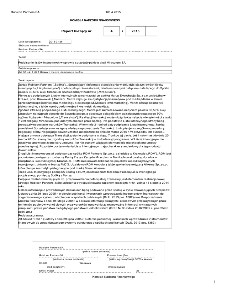 Rubicon Partners SA RB 4 2015 KOMISJA NADZORU FINANSOWEGO Raport bieżący nr 4 / 2015 2015-01-26 Data sporządzenia: Skróc ona nazwa emitenta Rubic on Partners SA Temat Podpisanie listów intencyjnych w sprawie sprzedaży pakietu akcji Miraculum SA. Podstawa prawna Art. 56 ust. 1 pkt 1 Ustawy o oferc ie - informac je poufne Treść raportu: Zarząd Rubicon Partners („Spółka”; „ Sprzedający”) informuje o podpisaniu w dniu dzisiejszym dwóch listów intencyjnych („Listy Intencyjne”) z potencjalnymi inwestorami, zainteresowanymi nabyciem należącego do Spółki pakietu 30,59% akcji Miraculum SA z siedzibą w Krakowie („Miraculum”). Pierwszy z podpisanych Listów Intencyjnych zawarty został ze spółką Mariza Dystrybucja Sp. z o.o. z siedzibą w Rząsce, pow. Krakowski („Mariza”). Mariza zajmuje się dystrybucją kosmetyków pod marką Mariza w formie sprzedaży bezpośredniej oraz marketingu sieciowego MLM (multi level marketing). Mariza oferuje kosmetyki pielęgnacyjne, a także wyroby perfumeryjne i kosmetyki do makijażu. Zgodnie z treścią podpisanego Listu Intencyjnego, Mariza jest zainteresowana nabyciem pakietu 30,59% akcji Miraculum należących obecnie do Sprzedającego, a docelowo osiągnięciem udziału przekraczającego 50% ogólnej liczby akcji Miraculum („Transakcja”). Realizacji transakcji może służyć także nabycie wierzytelności z tytułu 7 729 obligacji Miraculum, posiadanych obecnie przez Spółkę. Na podstawie Listu Intencyjnego strony będą prowadziły negocjacje warunków Transakcji. W terminie 21 dni od daty podpisania Listu Intencyjnego, Mariza przedstawi Sprzedającemu wstępną ofertę przeprowadzenia Transakcji. List opisuje szczegółowo procedurę negocjacji oferty. Negocjacje powinny zostać zakończone do dnia 20 marca 2015 r. W przypadku ich sukcesu, wiążąca umowa dotycząca Transakcji zostanie podpisana w ciągu 7 dni po tej dacie. Jeśli natomiast do dnia 20 marca 2015 r. strony nie uzgodnią warunków Transakcji – List Intencyjny wygaśnie. W Liście intencyjnym nie zostały ustanowione żadne kary umowne, list nie stanowi wiążącej oferty ani nie ma charakteru umowy przedwstępnej. Pozostałe postanowienia Listu Intencyjnego mają charakter standardowy dla tego rodzaju dokumentów. Drugi List Intencyjny został podpisany ze spółką RDM Partners Sp. z o.o. z siedzibą w Krakowie („RDM”). RDM jest podmiotem powiązanym z obecną Panią Prezes Zarządu Miraculum – Moniką Nowakowską, doradza w zarządzaniu i restrukturyzacji Miraculum. RDM zrealizowała kilkanaście projektów restrukturyzacyjnych i rozwojowych, głównie w branży FMCG. Udziałowcy RDM kontrolują także spółkę kosmetyczną Allverne Sp. z o.o., która oferuje kosmetyki pielęgnacyjne pod marką Vitea i Allverne. Treść Listu Intencyjnego pomiędzy Spółką a RDM jest zasadniczo tożsama z treścią Listu Intencyjnego podpisanego pomiędzy Spółką z Marizą. Podjęcie działań zmierzających do przeprowadzenia potencjalnej Transakcji jest elementem realizacji nowej strategii Rubicon Partners, której założenia były opublikowane raportem bieżącym nr 64 z dnia 18 sierpnia 2014 roku. Dalsze informacje o prowadzonych działaniach będą podawane przez Spółkę w trybie obowiązujących przepisów Ustawy z dnia 29 lipca 2005 r. o ofercie publicznej i warunkach wprowadzania instrumentów finansowych do zorganizowanego systemu obrotu oraz o spółkach publicznych (Dz.U. 2013 poz. 1382) oraz Rozporządzenia Ministra Finansów z dnia 19 lutego 2009 r. w sprawie informacji bieżących i okresowych przekazywanych przez emitentów papierów wartościowych oraz warunków uznawania za równoważne informacji wymaganych przepisami prawa państwa niebędącego państwem członkowskim (Dz.U. Nr 33 z dnia 28.02.2009 r., poz. 259 z późn. zm.) Podstawa prawna: Art. 56 ust. 1 pkt. 1) ustawy z dnia 29 lipca 2005 r. o ofercie publicznej i warunkach wprowadzania instrumentów finansowych do zorganizowanego systemu obrotu oraz o spółkach publicznych (Dz.U. 2013 poz. 1382). Rubic on Partners SA (pełna nazwa emitenta) Rubic on Partners SA Finanse inne (fin) (skróc ona nazwa emitenta) 00-688 (kod poc ztowy) (sektor wg. klasyfikac ji GPW w W-wie) Warszawa (miejscowość) Emilii Plater 28 Komisja Nadzoru Finansowego 1 Rubicon Partners SA RB 4 2015 (ulica) (numer) 22 209 98 00 22 209 98 01 (telefon) (fax) [email protected] www.rubiconpartners.pl (e-mail) (www) 5251347519 010952945 (NIP) (REGON) PODPISY OSÓB REPREZENTUJĄCYCH SPÓŁKĘ Data Imię i Nazwisko Stanowisko/Funkc ja 2015-01-26 Grzegorz Golec Piotr Karmelita Członek Zarządu Członek Zarządu Podpis Komisja Nadzoru Finansowego 2