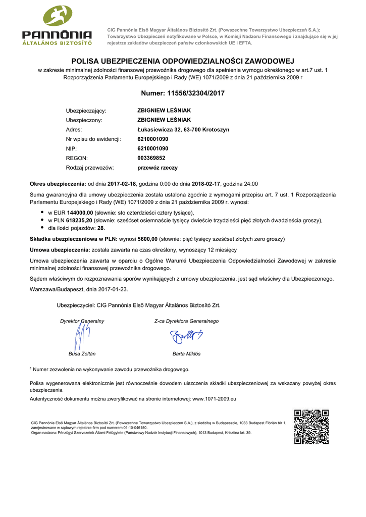CIG Pannónia Első Magyar Általános Biztosító Zrt. (Powszechne Towarzystwo Ubezpieczeń S.A.); Towarzystwo Ubezpieczeń notyfikowane w Polsce, w Komisji Nadzoru Finansowego i znajdujące się w jej rejestrze zakładów ubezpieczeń państw członkowskich UE i EFTA. POLISA UBEZPIECZENIA ODPOWIEDZIALNOŚCI ZAWODOWEJ w zakresie minimalnej zdolności finansowej przewoźnika drogowego dla spełnienia wymogu określonego w art.7 ust. 1 Rozporządzenia Parlamentu Europejskiego i Rady (WE) 1071/2009 z dnia 21 października 2009 r Numer: 11556/32304/2017 Ubezpieczający: ZBIGNIEW LEŚNIAK Ubezpieczony: ZBIGNIEW LEŚNIAK Adres: Łukasiewicza 32, 63-700 Krotoszyn Nr wpisu do ewidencji: 6210001090 NIP: 6210001090 REGON: 003369852 Rodzaj przewozów: przewóz rzeczy Okres ubezpieczenia: od dnia 2017-02-18, godzina 0:00 do dnia 2018-02-17, godzina 24:00 Suma gwarancyjna dla umowy ubezpieczenia została ustalona zgodnie z wymogami przepisu art. 7 ust. 1 Rozporządzenia Parlamentu Europejskiego i Rady (WE) 1071/2009 z dnia 21 października 2009 r. wynosi: w EUR 144000,00 (słownie: sto czterdzieści cztery tysiące), w PLN 618235,20 (słownie: sześćset osiemnaście tysięcy dwieście trzydzieści pięć złotych dwadzieścia groszy), dla ilości pojazdów: 28. Składka ubezpieczeniowa w PLN: wynosi 5600,00 (słownie: pięć tysięcy sześćset złotych zero groszy) Umowa ubezpieczenia: została zawarta na czas określony, wynoszący 12 miesięcy Umowa ubezpieczenia zawarta w oparciu o Ogólne Warunki Ubezpieczenia Odpowiedzialności Zawodowej w zakresie minimalnej zdolności finansowej przewoźnika drogowego. Sądem właściwym do rozpoznawania sporów wynikających z umowy ubezpieczenia, jest sąd właściwy dla Ubezpieczonego. Warszawa/Budapeszt, dnia 2017-01-23. Ubezpieczyciel: CIG Pannónia Első Magyar Általános Biztosító Zrt. 1 Dyrektor Generalny Z-ca Dyrektora Generalnego Busa Zoltán Barta Miklós Numer zezwolenia na wykonywanie zawodu przewoźnika drogowego. Polisa wygenerowana elektronicznie jest równocześnie dowodem uiszczenia składki ubezpieczeniowej za wskazany powyżej okres ubezpieczenia. Autentyczność dokumentu można zweryfikować na stronie internetowej: www.1071-2009.eu CIG Pannónia Első Magyar Általános Biztosító Zrt. (Powszechne Towarzystwo Ubezpieczeń S.A.), z siedzibą w Budapeszcie, 1033 Budapest Flórián tér 1, zarejestrowane w sądowym rejestrze firm pod numerem 01-10-046150. Organ nadzoru: Pénzügyi Szervezetek Állami Felügylete (Państwowy Nadzór Instytucji Finansowych), 1013 Budapest, Krisztina krt. 39.