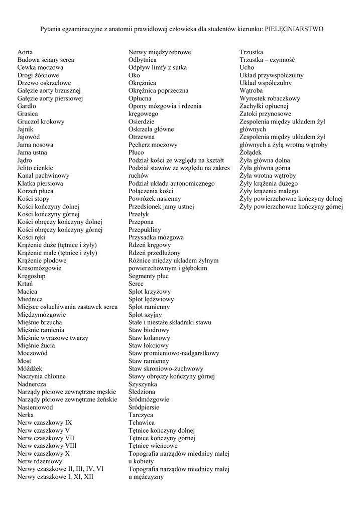 Pytania egzaminacyjne z anatomii prawidłowej człowieka dla studentów kierunku: PIELĘGNIARSTWO Aorta Budowa ściany serca Cewka moczowa Drogi żółciowe Drzewo oskrzelowe Gałęzie aorty brzusznej Gałęzie aorty piersiowej Gardło Grasica Gruczoł krokowy Jajnik Jajowód Jama nosowa Jama ustna Jądro Jelito cienkie Kanał pachwinowy Klatka piersiowa Korzeń płuca Kości stopy Kości kończyny dolnej Kości kończyny górnej Kości obręczy kończyny dolnej Kości obręczy kończyny górnej Kości ręki Krążenie duże (tętnice i żyły) Krążenie małe (tętnice i żyły) Krążenie płodowe Kresomózgowie Kręgosłup Krtań Macica Miednica Miejsce osłuchiwania zastawek serca Międzymózgowie Mięśnie brzucha Mięśnie ramienia Mięśnie wyrazowe twarzy Mięśnie żucia Moczowód Most Móżdżek Naczynia chłonne Nadnercza Narządy płciowe zewnętrzne męskie Narządy płciowe zewnętrzne żeńskie Nasieniowód Nerka Nerw czaszkowy IX Nerw czaszkowy V Nerw czaszkowy VII Nerw czaszkowy VIII Nerw czaszkowy X Nerw rdzeniowy Nerwy czaszkowe II, III, IV, VI Nerwy czaszkowe I, XI, XII Nerwy międzyżebrowe Odbytnica Odpływ limfy z sutka Oko Okrężnica Okrężnica poprzeczna Opłucna Opony mózgowia i rdzenia kręgowego Osierdzie Oskrzela główne Otrzewna Pęcherz moczowy Płuco Podział kości ze względu na kształt Podział stawów ze względu na zakres ruchów Podział układu autonomicznego Połączenia kości Powrózek nasienny Przedsionek jamy ustnej Przełyk Przepona Przepukliny Przysadka mózgowa Rdzeń kręgowy Rdzeń przedłużony Różnice między układem żylnym powierzchownym i głębokim Segmenty płuc Serce Splot krzyżowy Splot lędźwiowy Splot ramienny Splot szyjny Stałe i niestałe składniki stawu Staw biodrowy Staw kolanowy Staw łokciowy Staw promieniowo-nadgarstkowy Staw ramienny Staw skroniowo-żuchwowy Stawy obręczy kończyny górnej Szyszynka Śledziona Śródmózgowie Śródpiersie Tarczyca Tchawica Tętnice kończyny dolnej Tętnice kończyny górnej Tętnice wieńcowe Topografia narządów miednicy małej u kobiety Topografia narządów miednicy małej u mężczyzny Trzustka Trzustka – czynność Ucho Układ przywspółczulny Układ współczulny Wątroba Wyrostek robaczkowy Zachyłki opłucnej Zatoki przynosowe Zespolenia między układem żył głównych Zespolenia między układem żył głównych a żyłą wrotną wątroby Żołądek Żyła główna dolna Żyła główna górna Żyła wrotna wątroby Żyły krążenia dużego Żyły krążenia małego Żyły powierzchowne kończyny dolnej Żyły powierzchowne kończyny górnej