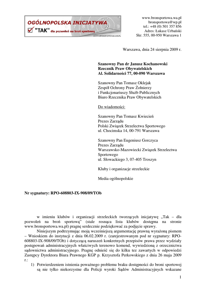 www.bronsportowa.wa.pl [email protected] tel.: +48 (0) 501 357 856 Adres: Łukasz Urbański Skr. 555, 00-950 Warszawa 1 Warszawa, dnia 24 sierpnia 2009 r. Szanowny Pan dr Janusz Kochanowski Rzecznik Praw Obywatelskich Al. Solidarności 77, 00-090 Warszawa Szanowny Pan Tomasz Oklejak Zespół Ochrony Praw Żołnierzy i Funkcjonariuszy Służb Publicznych Biuro Rzecznika Praw Obywatelskich Do wiadomości: Szanowny Pan Tomasz Kwiecień Prezes Zarządu Polski Związek Strzelectwa Sportowego ul. Chocimska 14, 00-791 Warszawa Szanowny Pan Eugeniusz Gorczyca Prezes Zarządu Warszawsko-Mazowiecki Związek Strzelectwa Sportowego ul. Słowackiego 3, 07-405 Troszyn Kluby i organizacje strzeleckie Media ogólnopolskie Nr sygnatury: RPO-608803-IX-908/09/TOb w imieniu klubów i organizacji strzeleckich tworzących inicjatywę „Tak – dla pozwoleń na broń sportową” (stale rosnąca lista klubów dostępna na stronie www.bronsportowa.wa.pl) pragnę serdecznie podziękować za podjęcie sprawy. Niniejszym podtrzymując moją wcześniejszą argumentację prawną wyrażoną pismem – Wnioskiem do instytucji z dnia 06.02.2009 r. (zarejestrowanym pod nr sygnatury: RPO608803-IX-908/09/TOb) i dotyczącą naruszeń konkretnych przepisów prawa przez wydziały postępowań administracyjnych właściwych terenowo komend, wywiedzioną z orzecznictwa sądownictwa administracyjnego. Pragnę odnieść się do kilku tez zawartych w odpowiedzi Zastępcy Dyrektora Biura Prawnego KGP p. Krzysztofa Perkowskiego z dnia 26 maja 2009 r.: 1) Potwierdzeniem istnienia poważnego problemu braku dostępności do broni sportowej są nie tylko niekorzystne dla Policji wyroki Sądów Administracyjnych wskazane 1 wcześniej we Wniosku inicjatywy z dnia 06.02.2009 r., ale też sui generis statystyka powołana przez p. K. Perkowskiego. Wynika z niej, że w ciągu ostatnich 5. lat, tj., w latach 2004 – 2009 (styczeń i luty) wydano łączną ilość, zaledwie 1943 sztuk pozwoleń na broń. Natomiast statystykę zawyżają lata 2004 (709 pozwoleń) oraz 2005 (535 pozwoleń). Od 2006 roku następuje lawinowy spadek wydawanych pozwoleń. W 2006 r. (320 pozwoleń), 2007 r. (174 pozwolenia), 2008 r. (175 pozwoleń), 2009 r. styczeń i luty (30 pozwoleń). Zatem w 2008 r., w porównaniu do 2004 r., wydano o 76 % procent mniej pozwoleń na broń sportową (sic!). Wartość ta dobitnie dowodzi trafności tez inicjatywy „Tak – dla pozwoleń na broń sportową” oraz niepokojących sygnałów napływających z różnych klubów strzeleckich z całej Polski. W tym zakresie próba odwracania uwagi od roli i odpowiedzialności KGP za zaistniałą sytuację zdaje się być przykładem argumentacji sofistycznej. 2) W odpowiedzi p. K. Perkowskiego zawarta jest też treść: „Nieprawdziwa jest tez teza, iż organy Policji w ogóle nie wydają pozwoleń na broń palną w celu sportowym”. We wniosku przesłanym do Rzecznika Praw Obywatelskich przez inicjatywę, nie ma bowiem zdania, które uzasadniałoby taki komentarz KGP. Są zaś określenia: „W chwili obecnej w większości województw, jest praktycznie niemożliwym uzyskanie indywidualnego pozwolenia na bron sportową” oraz zdanie „[...]a od około czterech lat w zasadzie całkowitego nie wydawania pozwoleń na bron sportową”. Chodzi tu o nie wydawanie nowych pozwoleń, a nie tzw. rozszerzenia starych decyzji. Kluczowe dla analizy są też dwa wyrażenia użyte we wniosku tj. słowa „praktycznie” oraz „w zasadzie”. Takie ujęcie wynika stąd, że sama Policja podaje sprzeczne dane statystyczne dotyczące dostępności broni sportowej. Z audycji Polskiego Radia Pr. I z dnia 16.06.2009 r., (program o inicjatywie i problemach strzelectwa) wynika, że w Warszawie w renomowanym i jednym z największych sklepów z bronią palną w Polsce w pierwszym półroczu 2009 r. nie sprzedano ani jednej jednostki krótkiej broni palnej sportowej. W tej samej audycji, wypowiada się też funkcjonariuszka Wydziału Prasowego KGP, p. asp. Małgorzata Gołaszewska, która na pytanie dziennikarki „Ile rocznie pozwoleń na broń sportową wydaje Policja?”, odpowiada: „W 2008 r., dla osób fizycznych było wydanych ponad 14.000 pozwoleń na broń sportową” (dowód: załącznik nr 1, audycja Polskiego Radia Pr. I z dnia 16.06.2009 r.). W świetle powyższego powstaje pytanie kto mija się z prawdą? Pan Dyrektor K. Perkowski, czy p. asp. M. Gołaszewska? Środowisko strzeleckie nie uzyskało do dziś odpowiedzi na pytanie czy podczas wypowiedzi radiowej zmanipulowano dane statystyczne, po to aby wprowadzić w błąd słuchaczy ogólnopolskiej i opiniotwórczej rozgłośni, czy też mieliśmy do czynienia z ignorancją urzędnika nie potrafiącego właściwie przedstawić danych statystycznych. Być może za pośrednictwem RPO, uda się uzyskać ostateczne stanowisko w tej kwestii gdyż najprawdopodobniej jest tak, że liczba 14.000 obrazuje wszystkie wydane i pozostające w mocy pozwolenia na broń sportową wg stanu na 2008 r., a nie nowo wydane pozwolenia w samym 2008 r., gdyż tych jak twierdzi w swoim piśmie p. K. Perkowski, w 2008 r., miało być wydanych w skali kraju zaledwie 157 (słownie: sto pięćdziesiąt siedem) pozwoleń na broń sportową. Tu nasuwa się kluczowe pytanie czy liczba 157 oraz poprzednie, podane za lata 2004 r. – 2009 r., obejmują też pozytywnie rozpatrzone wnioski o tzw. „rozszerzenia” decyzji o posiadaniu broni palnej sportowej – decyzji wydanych wcześniej. Jeśli tak, to w jakich proporcjach? Odpowiedź twierdząca w tym zakresie byłaby przykładem posługiwania się przez organ nieuczciwą argumentacją w celu udowodnienia fałszywej tezy, że nowe pozwolenia na broń są wydawane w racjonalnej ilości. 2 Dla zobrazowania problemu warto wskazać, iż zgodnie z analizą Biura Analiz Sejmowych BAS z dnia 19.03.2009 r., wg stanu na 2007 r., było posiadanych w Polsce pozwoleń: na broń myśliwską ok. 121.000, sportową zaś 15.000 (sic!