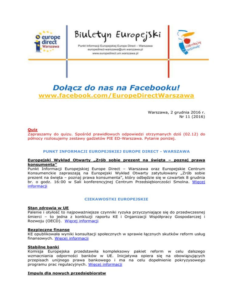 Dołącz do nas na Facebooku! www.facebook.com/EuropeDirectWarszawa Warszawa, 2 grudnia 2016 r. Nr 11 (2016) Quiz Zapraszamy do quizu. Spośród prawidłowych odpowiedzi otrzymanych dziś (02.12) do północy rozlosujemy zestawy gadżetów PIE ED-Warszawa. Pytanie poniżej. PUNKT INFORMACJI EUROPEJSKIEJ EUROPE DIRECT - WARSZAWA Europejski Wykład Otwarty „Zrób sobie prezent na święta – poznaj prawa konsumenta” Punkt Informacji Europejskiej Europe Direct – Warszawa oraz Europejskie Centrum Konsumenckie zapraszają na Europejski Wykład Otwarty zatytułowany „Zrób sobie prezent na święta – poznaj prawa konsumenta”, który odbędzie się w czwartek 8 grudnia br. o godz. 16:00 w Sali konferencyjnej Centrum Przedsiębiorczości Smolna. Więcej informacji CIEKAWOSTKI EUROPEJSKIE Stan zdrowia w UE Palenie i otyłość to najpoważniejsze czynniki ryzyka przyczyniające się do przedwczesnej śmierci – to jedna z konkluzji raportu KE i Organizacji Współpracy Gospodarczej i Rozwoju (OECD). Więcej informacji Bezpieczne finanse KE opublikowała wyniki konsultacji społecznych w sprawie łącznych skutków reform usług finansowych. Więcej informacji Stabilne banki Komisja Europejska przedstawiła kompleksowy pakiet reform w celu dalszego wzmacniania odporności banków w UE. Inicjatywa opiera się na obowiązujących przepisach unijnego prawa bankowego i ma na celu dopełnienie pokryzysowego programu prac regulacyjnych. Więcej informacji Impuls dla nowych przedsiębiorstw Poprawa dostępu do finansowania, druga szansa dla przedsiębiorców, którym się nie powiodło oraz uproszczone zgłoszenia podatkowe – to pakiet inicjatyw legislacyjnych KE, które mają pomóc nowo powstającym firmom oraz takim, które rozszerzają swoją działalność. Więcej informacji Pomoc na zamknięcie kopalń Plany Polski dotyczące udzielenia 7,95 mld złotych wsparcia na złagodzenie społecznych i środowiskowych skutków likwidacji niekonkurencyjnych kopalń węgla do 2018 r. za zgodne z unijnymi zasadami pomocy państwa – uznała Komisja Europejska. Więcej informacji Zgoda na budżet Pobudzenie wzrostu gospodarczego, zatrudnienia i konkurencyjności oraz bezpieczeństwo Europy – to priorytety przyszłorocznego budżetu UE, na które przeznaczonych zostanie najwięcej środków. Więcej informacji Wzrost pod nadzorem KE określa priorytety gospodarcze i społeczne UE na nadchodzący rok, potwierdza potrzebę przejścia na bardziej pozytywny kurs polityki budżetowej dla strefy euro i kończy ocenę projektów planów budżetowych państw członkowskich. Więcej informacji Unia nie może być bezbronna Najwyższy czas, aby zakończyć aktualizację dyrektywy w sprawie broni palnej oraz wyeliminować z szerszego obiegu broń automatyczną typu kałasznikow – apelował komisarz Julian King prezentując drugie miesięczne sprawozdanie z postępów w realizacji skutecznej i trwałej unii bezpieczeństwa. Więcej informacji Globalne partnerstwo KE zatwierdziła 8 projektów w ramach Instrumentu Partnerstwa – łączna kwota to ponad 32 mln euro. Działania przyczynią się do realizacji celów strategicznych UE w stosunkach zewnętrznych poprzez umocnienie partnerstwa z krajami trzecimi na całym świecie. Więcej informacji Przejrzyste podatki Komisja Europejska ogłosiła konsultacje społeczne, aby zebrać opinie na temat przyszłych zasad ograniczających działalność firm oferujących usługi agresywnego planowania podatkowego. Więcej informacji Pakiet „Rozszerzenie” 2016 Sytuacja Bałkanów Zachodnich i Turcji pod względem wdrażania najważniejszych reform polityczno-gospodarczych oraz sposoby rozwiązywania istniejących problemów - to główne elementy najnowszego pakietu "Rozszerzenie". Więcej informacji TAK dla CETA! Umowa handlowa między Unią Europejską i Kanadą (Comprehensive Economic and Trade Agreement between the EU and Canada CETA) została podpisana. Więcej informacji INFORMACJE O AKTUALNIE TRWAJĄCYCH KONKURSACH RPO WM 3.2.2 Modele biznesowe, RPO Mazowieckiego W ramach konkursu o dofinansowanie projektów mogą ubiegać się mikro-, małe, średnie przedsiębiorstwa. Więcej informacji RPO WM 3.3 Innowacje w MŚP - Typ projektów: Wprowadzanie na rynek nowych lub ulepszonych produktów lub usług (poprzez wdrożenie wyników prac B+R) Interwencja w ramach konkursu ukierunkowana będzie na wsparcie aktywności inwestycyjnej istniejących mikro, małych i średnich przedsiębiorstw, poprzez wdrażanie innowacji, co przełoży się na poprawę pozycji konkurencyjnej tych firm, w tym prowadzące do zwiększenia zatrudnienia. Więcej informacji „Gotówka na start” Krajowe Stowarzyszenie Wspierania Przedsiębiorczości prowadzi nabór wniosków do projektu „Gotówka na start”, w ramach którego osoby fizyczne mogą skorzystać z pożyczki na preferencyjnych warunkach. Więcej informacji WARSZTATY, KONKURSY, SZKOLENIA Europejskie Wykłady Otwarte Punkt Informacji Europejskiej Europe Direct – Warszawa ma przyjemność zaprosić Państwa do udziału w bezpłatnych Europejskich Wykładach Otwartych dotyczących tematyki europejskiej. Wykłady otwarte mają na celu zwiększenie wiedzy Warszawiaków na temat procesu integracji Polski z Unią Europejską, w tym pozyskiwania środków z jej budżetu. Spotkania odbywają się regularnie o godz. 16.00 w sali konferencyjnej Centrum Przedsiębiorczości Smolna przy ul. Smolnej 4. Jednocześnie przypominamy, że spotkania wymagają wcześniejszej rejestracji pod adresem: [email protected]. Inwestujemy u siebie Co to jest plan inwestycyjny? Jak zwiększyć konkurencyjność Europy? Jeśli jesteś uczniem gimnazjum lub szkoły ponadgimnazjalnej i znasz odpowiedzi na te pytania – weź udział w konkursie! Więcej informacji Litwo, partnerko moja! Chcesz w przyszłym roku zrealizować polsko-litewski projekt młodzieżowy? Konkurs wniosków właśnie ruszył! Więcej informacji Konkurs dla młodych muzyków Gr