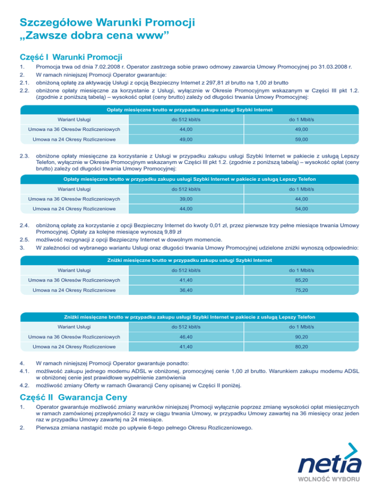 Szczegółowe Warunki Promocji „Zawsze dobra cena www” Część I Warunki Promocji 1. Promocja trwa od dnia 7.02.2008 r. Operator zastrzega sobie prawo odmowy zawarcia Umowy Promocyjnej po 31.03.2008 r. 2. W ramach niniejszej Promocji Operator gwarantuje: 2.1. obniżoną opłatę za aktywację Usługi z opcją Bezpieczny Internet z 297,81 zł brutto na 1,00 zł brutto 2.2. obniżone opłaty miesięczne za korzystanie z Usługi, wyłącznie w Okresie Promocyjnym wskazanym w Części III pkt 1.2. (zgodnie z poniższą tabelą) – wysokość opłat (ceny brutto) zależy od długości trwania Umowy Promocyjnej: Opłaty miesięczne brutto w przypadku zakupu usługi Szybki Internet Wariant Usługi do 512 kbit/s do 1 Mbit/s Umowa na 36 Okresów Rozliczeniowych 44,00 49,00 Umowa na 24 Okresy Rozliczeniowe 49,00 59,00 2.3. obniżone opłaty miesięczne za korzystanie z Usługi w przypadku zakupu usługi Szybki Internet w pakiecie z usługą Lepszy Telefon, wyłącznie w Okresie Promocyjnym wskazanym w Części III pkt 1.2. (zgodnie z poniższą tabelą) – wysokość opłat (ceny brutto) zależy od długości trwania Umowy Promocyjnej: Opłaty miesięczne brutto w przypadku zakupu usługi Szybki Internet w pakiecie z usługą Lepszy Telefon Wariant Usługi do 512 kbit/s do 1 Mbit/s Umowa na 36 Okresów Rozliczeniowych 39,00 44,00 Umowa na 24 Okresy Rozliczeniowe 44,00 54,00 2.4. obniżoną opłatę za korzystanie z opcji Bezpieczny Internet do kwoty 0,01 zł, przez pierwsze trzy pełne miesiące trwania Umowy Promocyjnej. Opłaty za kolejne miesiące wynoszą 9,89 zł 2.5. możliwość rezygnacji z opcji Bezpieczny Internet w dowolnym momencie. 3. W zależności od wybranego wariantu Usługi oraz długości trwania Umowy Promocyjnej udzielone zniżki wynoszą odpowiednio: Zniżki miesięczne brutto w przypadku zakupu usługi Szybki Internet Wariant Usługi do 512 kbit/s do 1 Mbit/s Umowa na 36 Okresów Rozliczeniowych 41,40 85,20 Umowa na 24 Okresy Rozliczeniowe 36,40 75,20 Zniżki miesięczne brutto w przypadku zakupu usługi Szybki Internet w pakiecie z usługą Lepszy Telefon Wariant Usługi do 512 kbit/s do 1 Mbit/s Umowa na 36 Okresów Rozliczeniowych 46,40 90,20 Umowa na 24 Okresy Rozliczeniowe 41,40 80,20 4. W ramach niniejszej Promocji Operator gwarantuje ponadto: 4.1. możliwość zakupu jednego modemu ADSL w obniżonej, promocyjnej cenie 1,00 zł brutto. Warunkiem zakupu modemu ADSL w obniżonej cenie jest prawidłowe wypełnienie zamówienia 4.2. możliwość zmiany Oferty w ramach Gwarancji Ceny opisanej w Części II poniżej. Część II Gwarancja Ceny 1. Operator gwarantuje możliwość zmiany warunków niniejszej Promocji wyłącznie poprzez zmianę wysokości opłat miesięcznych w ramach zamówionej przepływności 2 razy w ciągu trwania Umowy, w przypadku Umowy zawartej na 36 miesięcy oraz jeden raz w przypadku Umowy zawartej na 24 miesiące. 2. Pierwsza zmiana nastąpić może po upływie 6-tego pełnego Okresu Rozliczeniowego. 3. Zmiana wysokości opłaty miesięcznej może nastąpić wyłącznie w oparciu o jedną z promocji, z zastrzeżeniem tej samej przepływności, tej samej długości umowy oraz tej samej technologii, aktualnie dostępnych dla nowych Klientów w momencie dokonywanej zmiany, o której mowa powyżej. 4. W przypadku, gdy w nowej promocji wysokość opłat miesięcznych jest różna dla różnych Okresów Rozliczeniowych, nowa opłata miesięczna zostanie wyliczona, jako średnia z opłat miesięcznych obowiązujących w nowej promocji w czasie trwania umowy. 5. Zmiana oferty nie powoduje przedłużenia Umowy terminowej. 6. Zmiana oferty możliwa jest wyłącznie poprzez www.netia.pl. Część III Warunki skorzystania z Promocji 1. Z Promocji może skorzystać Abonent, który spełni łącznie wszystkie warunki określone poniżej: 1.1. korzysta z Linii telefonicznej w lokalizacji, w której świadczona będzie Usługa 1.2. zawrze z Operatorem Umowę Promocyjną, zamawiając usługę przez www.netia.pl, na czas określony 24 lub 36 pełnych Okresów Rozliczeniowych 1.3. w przypadku aktywacji Usługi na łączu Telekomunikacji Polskiej SA lub innego operatora korzystającego z infrastruktury technicznej Telekomunikacji Polskiej SA, wraz z zawartą Umową Promocyjną przekaże Operatorowi, zgodny ze wzorem Operatora, prawidłowo wypełniony i podpisany oryginał zgody na świadczenie Usługi w oparciu o wykorzystywane łącze Telekomunikacji Polskiej SA lub innego operatora („Oświadczenie o wyrażeniu zgody na świadczenie Usługi”). 2. Brak spełnienia któregokolwiek z podanych powyżej warunków uniemożliwia zawarcie Umowy Promocyjnej, a jeśli Umowę Promocyjną zawarto, powoduje jej wygaśnięcie. Z powyższego tytułu użytkownikowi nie przysługuje jakiekolwiek roszczenie. 3. Brak możliwości technicznych Operatora do świadczenia Usługi we wskazanej lokalizacji, w wybranym przez Abonenta wariancie również uniemożliwia zawarcie Umowy Promocyjnej, a jeśli Umowę Promocyjną zawarto, powoduje jej wygaśnięcie. Z powyższego tytułu użytkownikowi nie przysługuje jakiekolwiek roszczenie. Część IV Definicje 1. Niniejszy dokument określa warunki i zasady korzystania przez użytkowników z promocji „Zawsze dobra cena www” (zwanej „Promocją”). Operator świadczy usługi objęte Promocją na warunkach określonych w Regulaminie Świadczenia Usług przez Spółki Grupy Netia (zwanym „Regulaminem”), z uwzględnieniem zasad określonych niniejszym dokumentem. 2. Użyte w treści dokumentu terminy oznaczają: 2.1. Operator – Netia SA z siedzibą w Warszawie przy ul. Poleczki 13, 02-822 Warszawa, zarejestrowaną w Sądzie Rejonowym dla m.st. Warszawy, Sąd Gospodarczy, XIII Wydział Krajowego Rejestru Sądowego pod numerem KRS 0000041649, o kapitale zakładowym w wysokości 389.277.294 złotych opłaconym w całości, NIP 526-02-05-575, REGON 011566374 2.2. Usługa – usługa stałego dostępu do internetu realizowana na ł