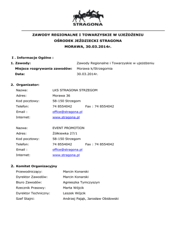 ______________________________________________________________ ZAWODY REGIONALNE I TOWARZYSKIE W UJEŻDŻENIU OŚRODEK JEŹDZIECKI STRAGONA MORAWA, 30.03.2014r. I . Informacje Ogólne : 1. Zawody: Zawody Regionalne i Towarzyskie w ujeżdżeniu Miejsce rozgrywania zawodów: Morawa k/Strzegomia Data: 30.03.2014r. 2. Organizator: Nazwa: LKS STRAGONA STRZEGOM Adres: Morawa 36 Kod pocztowy: 58-150 Strzegom Telefon: 74 8554042 Email : [email protected] Internet: www.stragona.pl Nazwa: EVENT PROMOTION Adres: Żółkiewka 27/1 Kod pocztowy: 58-150 Strzegom Telefon: 74 8554042 Email : [email protected] Internet: www.stragona.pl Fax : 74 8554042 Fax : 74 8554042 2. Komitet Organizacyjny Przewodniczący: Marcin Konarski Dyrektor Zawodów: Marcin Konarski Biuro Zawodów: Agnieszka Tymczyszyn Rzecznik Prasowy: Marta Wójcik Dyrektor Techniczny: Leszek Wójcik Szef Stajni: Andrzej Pająk, Jarosław Obidowski 3. Dane kontaktowe na miejscu zawodów Adres: 58-150 Strzegom, Morawa 36 Tel.: 74 8554042 II. Osoby Oficjalne (zgodnie z Przepisami o Sędziach wyd. 5, art.14 p.3): 2.1. Komisja Sędziowska: Janusz Lawin, Marek Pawłowicz 2.2. Komisarz: Katarzyna Konarska 2.3. Lekarz weterynarii zawodów: Michał Kornaszewski 609 283 888 III. Przepisy Ogólne - dokumentacja zawodników i koni –zgodna z wymogami regulaminowymi PZJ IV. Warunki techniczne 4.1. Plac konkursowy - piaskowy kwarcowy 4.2. Rozprężalnia - piaskowa kwarcowa V. Oferowane świadczenia: 5.1 Wyżywienie – na terenie zawodów 5.2 Stajnie boksowe: - organizator oferuje boksy Rezerwacja boksów tylko wraz ze zgłoszeniem do środy (26.03.2014r.) godz.20.00 Po tym terminie organizator zapewnia boksy w miarę możliwości. VI. Zgłoszenia i Opłaty: 6.1. Zgłoszenia: Termin zgłoszeń ostatecznych: 26.03.2014r. Zgłoszenia prosimy wysyłać na adres: Morawa 36, 58-150 Strzegom Fax : 74 8554042 Email: [email protected] W zgłoszeniach prosimy podać: imię i nazwisko zawodnika, nazwa konia, nazwa klubu, konkursy, ewentualne rezerwacje boksu i inne prośby oraz numer telefonu kontaktowego. Wraz ze zgłoszeniami należy również przesłać potwierdzenie dokonania przelewu opłaty organizacyjnej. 6.2. Opłaty: Opłata organizacyjna: 100zł / 25EUR wpisowe od konia za jeden dzień zawodów /max. 2 starty/ Opłaty należy dokonać w biurze zawodów najpóźniej na 2 godziny przed rozpoczęciem konkursów. Bez dokonanej wpłaty zawodnicy oraz konie będą skreślani z list startowych. Wszelkie zmiany w zgłoszeniach po ogłoszeniu list startowych tylko za zgodą organizatora i po wpłacie 50 zł/15EUR. Za konie zgłoszone po terminie pobierana będzie dodatkowa opłata wpisowa w wysokości 50zł/15EUR. Stajnie boksowe: 100zł/25EUR za jeden dzień. Podłączenie samochodu do prądu:100zł/25EUR. Opłaty organizacyjne proszę dokonywać na konto : Nazwa Banku: WBK BZ Strzegom Adres odbiorcy: LKS STRAGONA STRZEGOM Kod pocz.odbiorcy: 58-150 Adres Odbiorcy: Morawa 36, Strzegom Numer konta: 57 1090 2343 0000 0001 0499 1177 W przypadku wycofania ze startu w zawodach organizator nie zwraca wpłat dokonanych przed zawodami. VII. Informacje różne: Organizator nie ponosi żadnej odpowiedzialności w razie wypadków i zachorowań zawodników, luzaków i koni jak również w przypadku kradzieży, zniszczeń, pożarów i innych zdarzeń losowych. VIII. Noclegi Pałac Morawa: rezerwacja za pośrednictwem Organizatora /pokój dwuosobowy 140 zł ze śniadaniem, pokój jednoosobowy – 90 zł ze śniadaniem/ Kwatery Prywatne: rezerwacja za pośrednictwem Organizatora /pokój czteroosobowy - 180 zł, pokój trzyoosobowy - 150 zł, pokój dwuosobowy - 120 zł, min. 2 doby/. IX. PROGRAM ZAWODÓW - Niedziela, 30.03.2014r., godz. 9.00 Konkurs 1A Towarzyski - L-4 Konkurs 1B - L-4 otwarty Konkurs 1C – L WKKW 2014 NOWY !!! Konkurs 2A Towarzyski - P-3 Konkurs 2B. - P-3 otwarty Konkurs 2C – P WKKW Konkurs 3A Towarzyski - N-6 Konkurs 3B - N-6 otwarty Konkurs 3C – 1* B WKKW Konkurs 4 - C-4 otwarty Konkurs 5 – C - 5 Konkurs 6 - CC-4 otwarty Uwaga! W przypadku zgłoszenia startu w konkursach otwartych zawodników na kucach, konkursy te będą rozgrywane w 2 seriach: kuce i duże konie. Konkursy Towarzyskie nie są brane pod uwagę do klasyfikacji sportowej, a zawodnicy mają prawo startu bez aktualnych licencji i rejestracji. Dokładne godziny rozpoczęcia konkursów zostaną ogłoszone na stronie internetowej www.stragona.pl w dniu 28.03.2014 do godz. 20.00. X. Nagrody Nagrody finansowe i rzeczowe. Floot’s dla 25% najlepszych koni w każdym konkursie i wszystkich koni startujących w konkursach dowolnych. Planowana minimalna wysokość nagród pieniężnych w poszczególnych konkursach w pln: Nagrody łącznie w konkursach: Konkurs 1 – nagrody rzeczowe Konkurs 2– nagrody rzeczowe Konkurs 3 – nagrody rzeczowe Konkurs 4– nagrody rzeczowe Konkurs 5– nagrody rzeczowe Konkurs 6– nagrody rzeczowe Kuce będą klasyfikowane osobno. Dla zawodników startujących na kucach, organizator przewiduje nagrody rzeczowe. I. KODEKS POSTĘPOWANIA Z KONIEM I. Polski Związek Jeździecki w ślad za Międzynarodową Federacją Jeździecką FEI oczekuje, że wszystkie osoby zaangażowane w jakikolwiek sposób w sporty konne, będą przestrzegać zasad niniejszego Kodeksu Postępowania z Koniem oraz przyjmą do wiadomości, że w każdym przypadku dobro konia musi być sprawą nadrzędną i nigdy nie może być podporządkowane współzawodnictwu sportowemu ani celom komercyjnym. II. Na wszystkich etapach treningu i przygotowań konia do startu w zawodach, dobro konia musi stać ponad wszelkimi innymi wymaganiami. Dotyczy to stałej opieki, metod treningu, starannego obrządku, kucia i transportu. III. Konie i jeźdźcy muszą być wytrenowani, kompetentni i zdrowi zanim wezmą udział w zawodach. Odnosi się to także do podawania leków i środków medycznych, zabiegów chirurgicznych zagrażających dobru konia lub ciąży klaczy, oraz do przypadków nadużywania pomocy medycz