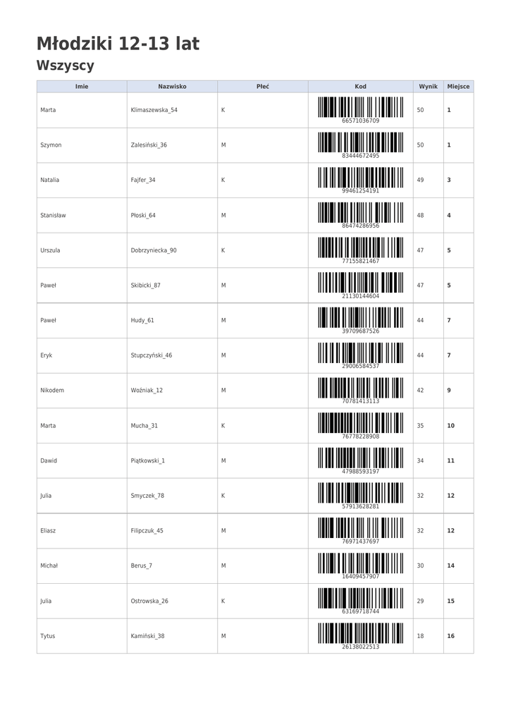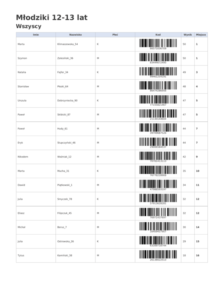 Młodziki 12-13 lat Wszyscy Imie Marta Nazwisko Klimaszewska_54 Płeć Kod K Wynik Miejsce 50 1 50 1 49 3 48 4 47 5 47 5 44 7 44 7 42 9 35 10 34 11 32 12 32 12 30 14 29 15 18 16 66571036709 Szymon Zalesiński_36 M 83444672495 Natalia Fajfer_34 K 99461254191 Stanisław Płoski_64 M 86474286956 Urszula Dobrzyniecka_90 K 77155821467 Paweł Skibicki_87 M 21130144604 Paweł Hudy_61 M 39709687526 Eryk Stupczyński_46 M 29006584537 Nikodem Woźniak_12 M 70781413113 Marta Mucha_31 K 76778228908 Dawid Piątkowski_1 M 47988593197 Julia Smyczek_78 K 57913628281 Eliasz Filipczuk_45 M 76971437697 Michał Berus_7 M 16409457907 Julia Ostrowska_26 K 63169718744 Tytus Kamiński_38 M 26138022513 Szymon Tórz_65 M 18 16 11 18 51460616399 Monika Olejniczak_10 K 58920380912 Dziewczynki Imie Marta Nazwisko Klimaszewska_54 Płeć Kod K Wynik Miejsce 50 1 49 2 47 3 35 4 32 5 29 6 11 7 66571036709 Natalia Fajfer_34 K 99461254191 Urszula Dobrzyniecka_90 K 77155821467 Marta Mucha_31 K 76778228908 Julia Smyczek_78 K 57913628281 Julia Ostrowska_26 K 63169718744 Monika Olejniczak_10 K 58920380912 Chłopcy Imie Szymon Nazwisko Zalesiński_36 Płeć Kod M Wynik Miejsce 50 1 48 2 47 3 44 4 44 4 42 6 83444672495 Stanisław Płoski_64 M 86474286956 Paweł Skibicki_87 M 21130144604 Paweł Hudy_61 M 39709687526 Eryk Stupczyński_46 M 29006584537 Nikodem Woźniak_12 M 70781413113 Dawid Piątkowski_1 M 34 7 32 8 30 9 18 10 18 10 47988593197 Eliasz Filipczuk_45 M 76971437697 Michał Berus_7 M 16409457907 Tytus Kamiński_38 M 26138022513 Szymon Tórz_65 M 51460616399