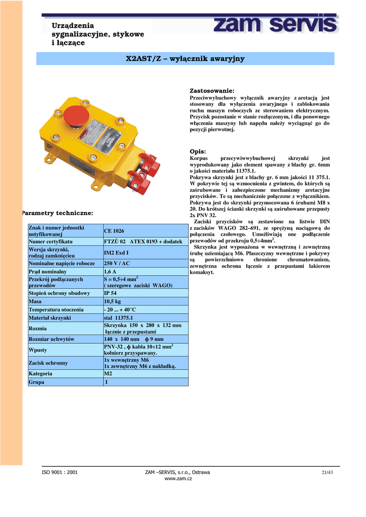 Urządzenia sygnalizacyjne, stykowe i łączące X2AST/Z – wyłącznik awaryjny Zastosowanie: Przeciwwybuchowy wyłącznik awaryjny z aretacją jest stosowany dla wyłączenia awaryjnego i zablokowania ruchu maszyn roboczych ze sterowaniem elektrycznym. Przycisk pozostanie w stanie rozłączonym, i dla ponownego włączenia maszyny lub napędu należy wyciągnąć go do pozycji pierwotnej. Opis: Parametry techniczne: Znak i numer jednostki notyfikowanej Numer certyfikatu Wersja skrzynki, rodzaj zamknięcieu Nominalne napięcie robocze Prąd nominalny Przekrój podlączanych przewodów Stopień ochrony obudowy Masa Temperatura otoczenia Materiał skrzynki CE 1026 FTZÙ 02 ATEX 0193 + dodatek IM2 Exd I 250 V / AC 1,6 A S = 0,5÷4 mm2 ( szeregowe zaciski WAGO) IP 54 10,5 kg Kategoria - 20 ... + 40°C stal 11375.1 Skrzynka 150 x 280 x 132 mm łącznie z przepustami 140 x 140 mm ɸ 9 mm PNV-32 , ɸ kabla 10÷12 mm2 kołnierz przyspawany. 1x wewnętrzny M6 1x zewnętrzny M6 z nakładką. M2 Grupa I Rozmia Rozmiar uchwytów Wpusty Zacisk ochronny ISO 9001 : 2001 Korpus przecywiwwybuchowej skrzynki jest wyprodukowany jako element spawany z blachy gr. 6mm o jakości materiału 11375.1. Pokrywa skrzynki jest z blachy gr. 6 mm jakości 11 375.1. W pokrywie tej są wzmocnienia z gwintem, do których są zaśrubowane i zabezpieczone mechanizmy aretacyjne przycisków. Te są mechanicznie połączone z wyłącznikiem. Pokrywa jest do skrzynki przymocowana 6 śrubami M8 x 20. Do krótszej ścianki skrzynki są zaśrubowane przepusty 2x PNV 32. Zaciski przycisków są zestawione na listwie DIN z zacisków WAGO 282–691, ze sprężyną naciągową do połączenia czołowego. Umożliwiają one podłączenie przewodów od przekroju 0,5÷4mm2. Skrzynka jest wyposażona w wewnętrzną i zewnętrzną śrubę uziemiającą M6. Płaszczyzny wewnętrzne i pokrywy są powierzchniowo chronione chromatowaniem, zewnętrzna ochrona łącznie z przepustami lakierem komaksyt. ZAM –SERVIS, s.r.o., Ostrawa www.zam.cz 21/43