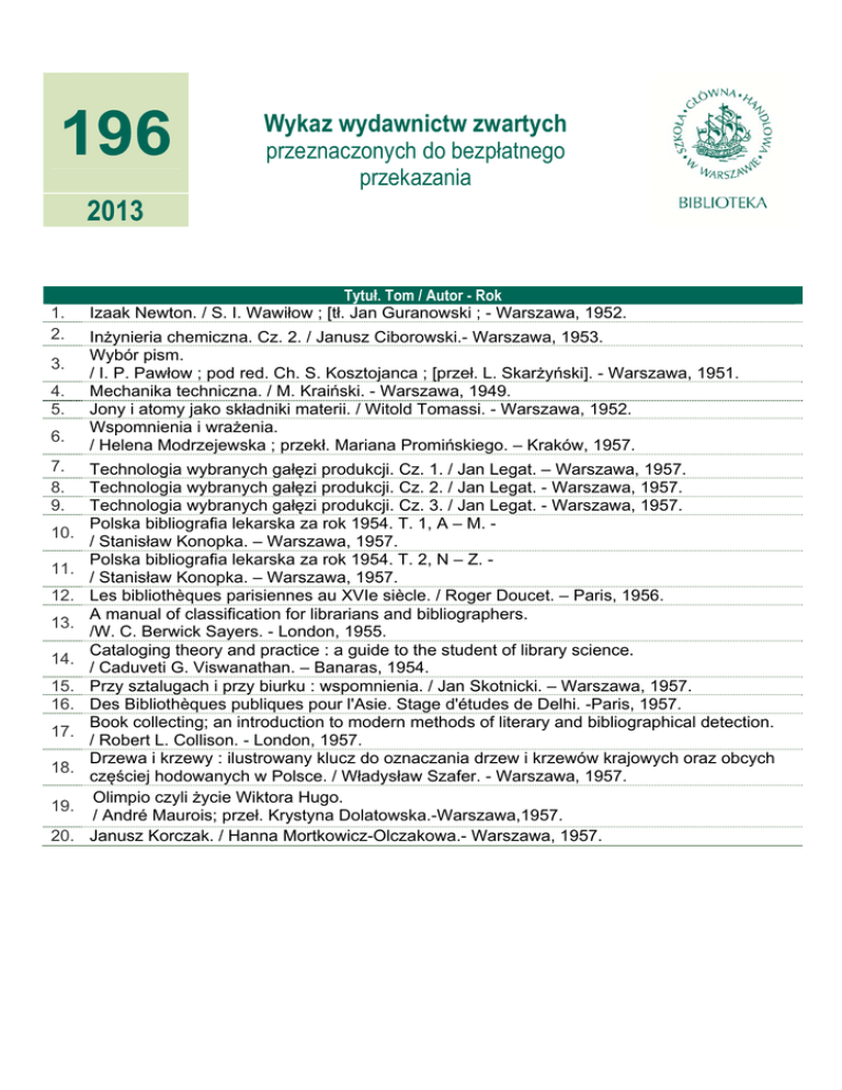 196 Wykaz wydawnictw zwartych przeznaczonych do bezpłatnego przekazania 2013 1. 2. 3. 4. 5. 6. 7. 8. 9. 10. 11. 12. 13. 14. 15. 16. 17. 18. 19. 20. Tytuł. Tom / Autor - Rok Izaak Newton. / S. I. Wawiłow ; [tł. Jan Guranowski ; - Warszawa, 1952. Inżynieria chemiczna. Cz. 2. / Janusz Ciborowski.- Warszawa, 1953. Wybór pism. / I. P. Pawłow ; pod red. Ch. S. Kosztojanca ; [przeł. L. Skarżyński]. - Warszawa, 1951. Mechanika techniczna. / M. Kraiński. - Warszawa, 1949. Jony i atomy jako składniki materii. / Witold Tomassi. - Warszawa, 1952. Wspomnienia i wrażenia. / Helena Modrzejewska ; przekł. Mariana Promińskiego. – Kraków, 1957. Technologia wybranych gałęzi produkcji. Cz. 1. / Jan Legat. – Warszawa, 1957. Technologia wybranych gałęzi produkcji. Cz. 2. / Jan Legat. - Warszawa, 1957. Technologia wybranych gałęzi produkcji. Cz. 3. / Jan Legat. - Warszawa, 1957. Polska bibliografia lekarska za rok 1954. T. 1, A – M. / Stanisław Konopka. – Warszawa, 1957. Polska bibliografia lekarska za rok 1954. T. 2, N – Z. / Stanisław Konopka. – Warszawa, 1957. Les bibliothèques parisiennes au XVIe siècle. / Roger Doucet. – Paris, 1956. A manual of classification for librarians and bibliographers. /W. C. Berwick Sayers. - London, 1955. Cataloging theory and practice : a guide to the student of library science. / Caduveti G. Viswanathan. – Banaras, 1954. Przy sztalugach i przy biurku : wspomnienia. / Jan Skotnicki. – Warszawa, 1957. Des Bibliothèques publiques pour l'Asie. Stage d'études de Delhi. -Paris, 1957. Book collecting; an introduction to modern methods of literary and bibliographical detection. / Robert L. Collison. - London, 1957. Drzewa i krzewy : ilustrowany klucz do oznaczania drzew i krzewów krajowych oraz obcych częściej hodowanych w Polsce. / Władysław Szafer. - Warszawa, 1957. Olimpio czyli życie Wiktora Hugo. / André Maurois; przeł. Krystyna Dolatowska.-Warszawa,1957. Janusz Korczak. / Hanna Mortkowicz-Olczakowa.- Warszawa, 1957.