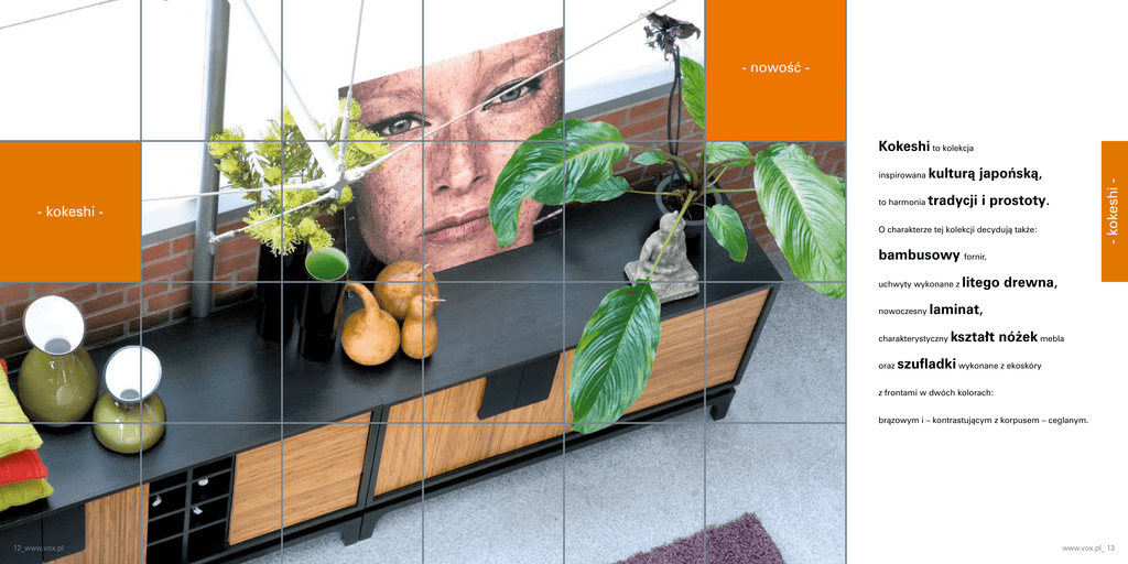 - nowość - - kokeshi - inspirowana kulturą japońską, to harmonia tradycji i prostoty. - kokeshi - Kokeshi to kolekcja O charakterze tej kolekcji decydują także: bambusowy fornir, uchwyty wykonane z nowoczesny laminat, charakterystyczny oraz litego drewna, kształt nóżek mebla szufladki wykonane z ekoskóry z frontami w dwóch kolorach: brązowym i – kontrastującym z korpusem – ceglanym. 12_www.vox.pl www.vox.pl_ 13 Proste bryły stanowią o nowoczesnym, wielkomiejskim klimacie, - pokój dzienny - a jednocześnie nawiązują do tradycji i prostoty kultywowanej w Japonii. Meble tapicerowane dają możliwość zestawiania ze sobą różnych modułów, dzięki czemu można swobodnie komponować dowolne zestawy i tworzyć kombinacje w zależności od indywidualnych potrzeb. Stolik kawowy pozwala na przechowywanie różnych przedmiotów: pilotów, gazet, książek – ma pod blatem pojemne półki na narożnikach oraz opcjonalnie 4 szufladki z ekoskóry. Szufladki, dzięki swojej prostej formie, z powodzeniem znajdują zastosowanie także jako samodzielny element dekoracyjny oraz mogą pełnić funkcję pojemnika. Stolik RTV posiada dwie półki na sprzęt RTV i płyty DVD, dwie funkcjonalne szuflady i opcjonalnie dwie małe szufladki z ekoskóry na drobiazgi. Kolor szufladek można dowolnie zmieniać – z ceglanego na brązowy i odwrotnie. 14_www.vox.pl Lampa stołowa ARIGATO Cena: 199 zł wys. 62,5 cm www.vox.pl_ 15 Nowoczesny i wielofunkcyjny regał na TV - pokój dzienny - idealnie aranżuje przestrzeń pokoju dziennego. Regał RTV charakteryzuje stabilność, indywidualny charakter oraz pojemność. To bardzo nowoczesny wielofunkcyjny panel do sprzętu rtv. Istnieje możliwość zamontowania półek na dowolnej wysokości, co pozwala na wstawienie sprzętu o różnych wymiarach oraz zagospodarowanie przestrzeni półek na płyty, dodatki, artykuły dekoracyjne etc. BONO Cena: od 119 zł wys. 28 cm 16_www.vox.pl www.vox.pl_ 17 Elegancki, a zarazem bardzo praktyczny – dzięki podwójnemu blatowi i szufladkom. - jadalnia - Stół z kolekcji Kokeshi nadaje nowy wymiar jadalni. Rozsuwany stół z funkcją przechowywania. Konstrukcja „podwójnego” blatu tworzy dodatkową przestrzeń, w której umieszczone mogą być 4 szufladki z ekoskóry. Szufladki umieszczone pod blatem stołu: • wykonane z ekoskóry z frontami w dwóch różnych kolorach: – brązowym – fronty szuflad w kolorze korpusu mebli – ceglanym – fronty w charakterystycznym, odcinającym się od korpusu mebli, kolorze • umożliwiają zmianę charakteru mebla poprzez prosty zabieg przełożenia szuflady • można w nich przechowywać serwetki i inne drobne elementy potrzebne do nakrycia stołu. Po wyciągnięciu mogą także funkcjonować samodzielnie • dla podkreślenia charakteru mebla fronty szuflad przeszyte są nicią w kontrastowym kolorze 18_www.vox.pl www.vox.pl_ 19 Pojemne, chowane szuflady komody i funkcjonalne regały - jadalnia - pozwalają urządzić jadalnię pięknie i zarazem wygodnie. Komoda z drzwiami posiada wewnątrz pojemną szeroką szufladę. W zależności od tego, w którym pokoju zostanie ustawiona, można w niej przechowywać sztućce, bieliznę stołową czy biżuterię. Regał ze szklanymi drzwiami idealnie nadaje się do przechowywania książek, pamiątek itp. W dolnej części posiada drzwi z płyty, w górnej – drzwi szklane oraz dwie szklane półki. Wnętrze regału jest oświetlone. Bufet to pojemna komoda z przeznaczeniem do jadalni, z dodatkową funkcją półki na wino. Serwis YOKO 20_www.vox.pl Cena: 399 zł kompl. 17 szt. www.vox.pl_ 21 Klasycznie proste w formie łóżko nadaje klimat całej sypialni, - sypialnia - a pojemne i funkcjonalne szafy mogą pełnić funkcję garderoby. Szafa 3-drzwiowa jest w części środkowej rozbudowana o 3 szuflady na bieliznę, a w górnej o drążek garderobiany. Suwane drzwi zapewniają komfort użytkowania nawet w małym pomieszczeniu. Środkowe drzwi szafy otwierają się po naciśnięciu dłonią. Nadstawki szaf stanowią dodatkową powierzchnię do zagospodarowania, jednocześnie nie zajmując powierzchni pokoju. Łóżko z szerokim szczytem, który posiada wewnątrz wbudowaną wnękę do przechowywania drobiazgów, np. książek. Wnęka w szczycie łóżka jest podświetlana i stanowi dodatkowe źródło światła w sypialni. Pościel Tokio, polecana do kolekcji, idealnie pasuje do charakteru mebli Kokeshi. Więcej na stronie 196. Rzeźba GŁOWA BUDDY Cena: 119 zł wys. 30 cm 22_www.vox.pl www.vox.pl_ 23 Przyjemnie jest spędzać czas w sypialni, gdy dzięki ławce można zjeść śniadanie w łóżku, - sypialnia - opierając się o wygodne poduchy ze ekoskóry. Łóżko posiada podświetlany zagłówek wykonany z płyty. Dodatkowo można dokupić tapicerowane poduchy z ekoskóry, które są zawieszane na zagłówku pod kątem i stanowią wygodne oparcie, np. podczas czytania. Skrzynia stanowi świetne uzupełnienie wyposażenia sypialni. Jako dostawka do łóżka spełni rolę miejsca do przechowywania pościeli, koców, dodatkowych poduszek itp. Zamknięta stanowi ławeczkę, na której można usiąść. Ławka (stolik do łóżka) stanowi uzupełnienie oferty do sypialni oraz pokoju młodzieżowego. Na dwóch wygodnych blatach można postawić śniadanie albo oprzeć książkę. Ławka przesuwa się na stelażu łóżka. Na czas snu można zdjąć ławkę ze stelaża i postawić obok łóżka – pełni wówczas funkcję ławki. 24_www.vox.pl www.vox.pl_ 25 W sypialni można również zagospodarować przestrzeń dla dziecka, gdyż w kolekcji Kokeshi znajduje się także - sypialnia - łóżeczko. Pagoda, oryginalna nadstawka, może być używana jako uzupełnienie komody szerokiej, bufetu, komody wąskiej, szafy – czyli być ustawiana praktycznie na każdy mebel skrzyniowy. Pagoda umożliwia przechowywanie różnych przedmiotów, jeśli zastosujemy szufladki wykonane z ekoskóry. Ustawiona na stole będzie tac