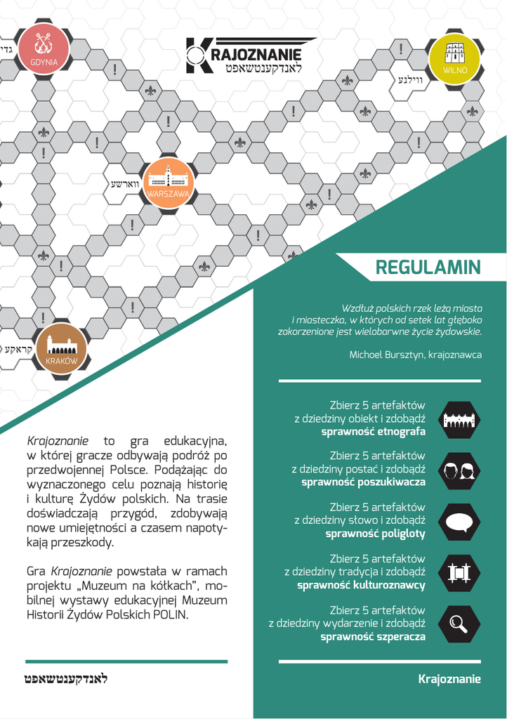 REGULAMIN Wzdłuż polskich rzek leżą miasta i miasteczka, w których od setek lat głęboko zakorzenione jest wielobarwne życie żydowskie. Michoel Bursztyn, krajoznawca Krajoznanie to gra edukacyjna, w której gracze odbywają podróż po przedwojennej Polsce. Podążając do wyznaczonego celu poznają historię i kulturę Żydów polskich. Na trasie doświadczają przygód, zdobywają nowe umiejętności a czasem napotykają przeszkody. Gra Krajoznanie powstała w ramach projektu „Muzeum na kółkach”, mobilnej wystawy edukacyjnej Muzeum Historii Żydów Polskich POLIN. לאנדקענטשאפט Krajoznanie Zbierz 5 artefaktów z dziedziny obiekt i zdobądź sprawność etnografa Zbierz 5 artefaktów z dziedziny postać i zdobądź sprawność poszukiwacza ? Zbierz 5 artefaktów z dziedziny słowo i zdobądź sprawność poligloty Zbierz 5 artefaktów z dziedziny tradycja i zdobądź sprawność kulturoznawcy Zbierz 5 artefaktów z dziedziny wydarzenie i zdobądź sprawność szperacza Krajoznanie 1 Edukacyjna gra planszowa Krajoznanie O GRZE Liczba graczy: od 2 do 5 osób Sugerowany wiek graczy: 14 + Polska przez stulecia była krajem wielokulturowym i wielowyznanio- Czas gry: ok. 45 min. wym, wspólną ojczyzną Polaków, Białorusinów, Litwinów, Niemców, Ormian, Rosjan, Tatarów, Ukraińców i Żydów. Obok kościołów, budowa- ZAWARTOŚĆ PUDEŁKA ne były cerkwie, meczety i synagogi. Na początku XX w. jedną z największych mniejszości narodowych stanowili Żydzi. Dzięki grze Krajoznanie • plansza poznacie bogatą kulturę i historię Żydów polskich. Przekonacie się, że • 7 pionków głównych, którymi poruszacie się po planszy jest ona integralną częścią historii Polski, która bez dziejów polskich • 49 pionków markujących, które zostawiacie na medalionie odwiedzonego Żydów jest niekompletna. miasta • 1 kostka do gry Nazwa gry nawiązuje do popularnego przed wojną ruchu promujące- • 7 zestawów kart miast, na które składają się: karta miasta (po 1 na miasto) go turystykę, obcowanie z przyrodą, zwiedzanie historycznych miejsc. oraz karty artefaktów (2 komplety po 5 kart do każdego miasta) Landkentenisz oznacza w jidysz – języku używanym przez wschodnio- • 10 legitymacji, które definiują Wasze cele podczas gry europejskich Żydów – krajoznawstwo, czyli właśnie poznawanie kraju. • 20 biletów, które uprawniają Was do pobrania kart artefaktów Historyk żydowski Emanuel Ringelblum pisał, że landkentenisz to nie • 10 kart sprawności, które otrzymacie po zdobyciu 5 odpowiednich kart tylko uczenie się przeszłości miasta ale przede wszystkim poznawanie ludzi. Podczas gry każdy z Was wcieli się w postać młodego podróż- artefaktów • 28 kart szczęście nika. Staniecie się grupą dziewcząt i chłopców, w wieku 15-17 lat, któ- • 28 kart pech rzy reprezentują pierwsze pokolenie ludzi urodzonych i wykształconych • regulamin gry w odrodzonej Polsce. Pochodzą oni z różnych rodzin żydowskich: religijnych lub zasymilowanych, bogatych lub biednych, mieszkają w różnych rejonach Polski. Każdy z nich ma swoje talenty, plany i marzenia. Plansza to wehikuł czasu. Przenosi Was na terytorium II Rzeczpospolitej, kiedy w jej granicach leżały Wilno i Drohobycz, a Gdynia była najmłodszym miastem Polski, symbolem jej witalności i nowoczesności. 2 לאנדקענטשאפט Krajoznanie 3 Etnografka/Etnograf CEL GRY zdobywa 5 artefaktów z dziedziny obiekt Zadaniem graczy jest odwiedzenie wskazanych miast, zdobycie określonej sprawności i powrót do swojego miasta urodzenia. ? Poszukiwaczka/Poszukiwacz zdobywa 5 artefaktów z dziedziny postać Poliglotka/Poliglota REGUŁY GRY zdobywa 5 artefaktów z dziedziny słowo Każda osoba wybiera jedną legitymację. Znajduje się w niej krótka notka o postaci, którą będzie rozgrywać grę oraz obowiązkowe zadania: miasta, które postać ma odwiedzić i sprawność, którą ma uzyskać. Dobierzcie tak postacie, aby każdy startował z innego miasta i zdobywał inną Kulturoznawczyni/Kulturoznawca zdobywa 5 artefaktów z dziedziny tradycja Szperaczka/Szperacz zdobywa 5 artefaktów z dziedziny wydarzenie sprawność. Następnie każdy wybiera kolor pionka głównego, którym W mieście odbieracie karty artefaktów, których treść czytacie na głos. będzie poruszać się po planszy. W każdym mieście jest tylko jedna karta artefaktu z jednej dziedziny. Dlatego, aby zebrać 5 kart artefaktów musicie odwiedzić przynajmniej Kostka determinuje liczbę ruchów, jednak to Wy decydujecie, jaką trasą 5 miast. Aby pobrać kartę artefaktu trzeba mieć bilet. Na początku gry chcecie się poruszać. Ruchy mogą być robione w dowolnym kierunku. każdy dostaje po 2 bilety. Każdy kolejny bilet otrzymacie kiedy zbierzecie Po trasach poruszacie się pionkami głównymi. Wchodząc na medalion 5 punktów. miasta zostawiacie tam jeden ze swoich pionków pomocniczych. Punkty zdobywa się na dwa sposoby: Jeżeli wyrzucisz taką liczbę oczek, że przechodzisz przez miasto, zatrzy- 1. Poprzez dotarcie do kolejnych miast mujesz się w nim, pobierasz kartę artefaktu i przesuwasz się o pozosta- • Pierwsze wejście do każdego miasta to 4 punkty łą liczbę oczek, np. do Lublina brakuje Ci 3 pól, ale wyrzucasz 5 oczek; • Drugie wejście do tego samego miasta to 3 punkty przesuwasz się o 3 pola – na medalion miasta Lublina, odbierasz arte- • Trzecie wejście do tego samego miasta to 2 punkty fakt i przesuwasz się o kolejne 2 pola. Jeżeli wchodzicie do tego samego miasta dwa razy z rzędu nie otrzymujecie żadnych punktów np.: jeżeli jesteś w Lublinie nie wystarczy, że Sprawność zdobywa się poprzez zebranie przynajmniej 5 artefaktów wyjdziesz z miasta na odległość liczby wyrzuconych oczek i wrócisz. z odpowiedniej dziedziny: Aby otrzymać punkty za drugie lub trzecie wejście do Lublina musisz udać się najpierw do innego miasta. 4 לאנדקענטש