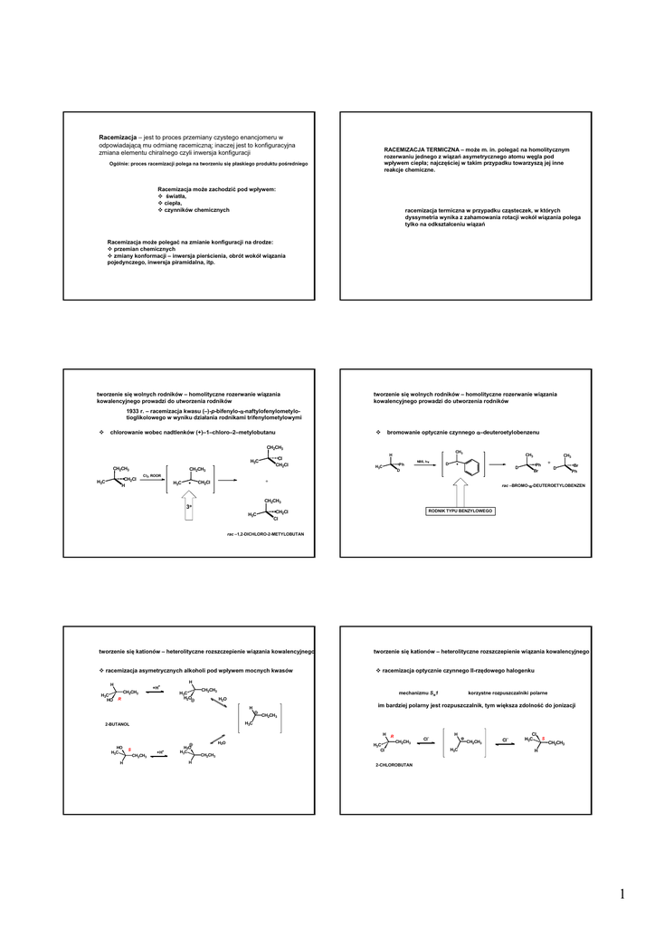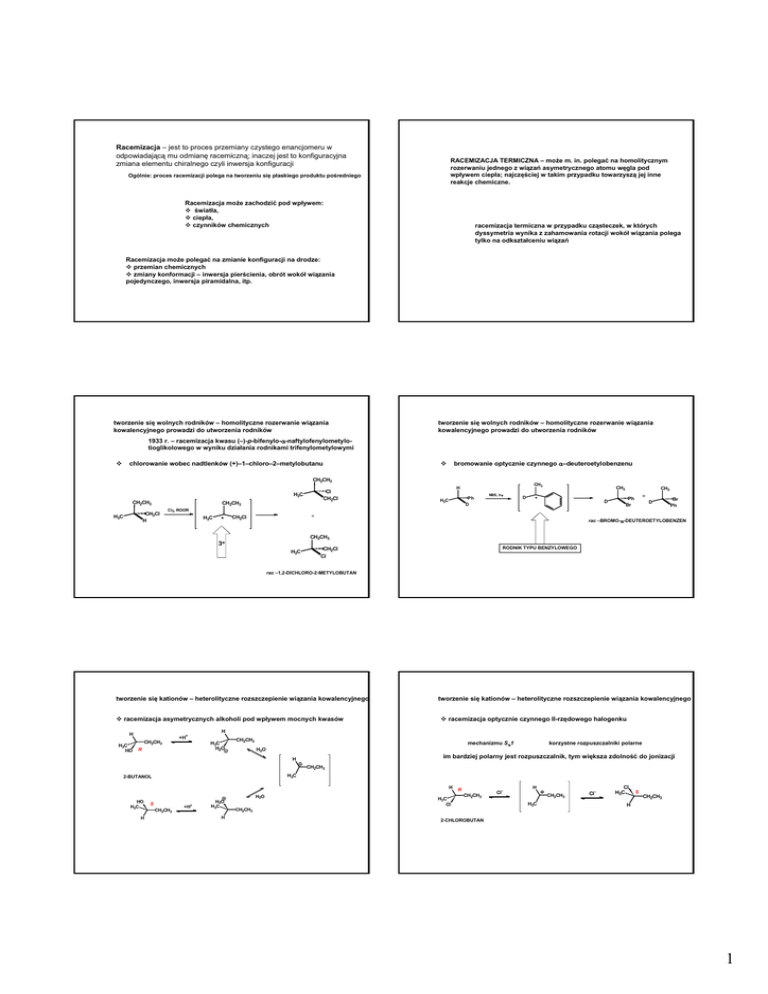 Racemizacja – jest to proces przemiany czystego enancjomeru w odpowiadającą mu odmianę racemiczną; inaczej jest to konfiguracyjna zmiana elementu chiralnego czyli inwersja konfiguracji RACEMIZACJA TERMICZNA – może m. in. polegać na homolitycznym rozerwaniu jednego z wiązań asymetrycznego atomu węgla pod wpływem ciepła; najczęściej w takim przypadku towarzyszą jej inne reakcje chemiczne. Ogólnie: proces racemizacji polega na tworzeniu się płaskiego produktu pośredniego Racemizacja może zachodzić pod wpływem: światła, ciepła, czynników chemicznych racemizacja termiczna w przypadku cząsteczek, w których dyssymetria wynika z zahamowania rotacji wokół wiązania polega tylko na odkształceniu wiązań Racemizacja może polegać na zmianie konfiguracji na drodze: przemian chemicznych zmiany konformacji – inwersja pierścienia, obrót wokół wiązania pojedynczego, inwersja piramidalna, itp. tworzenie się wolnych rodników – homolityczne rozerwanie wiązania kowalencyjnego prowadzi do utworzenia rodników tworzenie się wolnych rodników – homolityczne rozerwanie wiązania kowalencyjnego prowadzi do utworzenia rodników 1933 r. – racemizacja kwasu (–)-p-bifenylo-α-naftylofenylometylotioglikolowego w wyniku działania rodnikami trifenylometylowymi chlorowanie wobec nadtlenków (+)–1–chloro–2–metylobutanu bromowanie optycznie czynnego α–deuteroetylobenzenu CH2CH3 Cl CH2Cl H3C CH2CH3 CH2CH3 CH2Cl H H3C CH3 H Ph D H3C NBS, hν CH3 D D CH3 + Ph Br D Cl2, ROOR H3C Br Ph + CH2Cl rac –BROMO-α-DEUTEROETYLOBENZEN CH2CH3 3° H3C RODNIK TYPU BENZYLOWEGO CH2Cl Cl rac –1,2-DICHLORO-2-METYLOBUTAN tworzenie się kationów – heterolityczne rozszczepienie wiązania kowalencyjnego racemizacja asymetrycznych alkoholi pod wpływem mocnych kwasów H H3C HO CH2CH3 tworzenie się kationów – heterolityczne rozszczepienie wiązania kowalencyjnego racemizacja optycznie czynnego II-rzędowego halogenku H +H+ H3C H2O R CH2CH3 mechanizmu SN1 H2O korzystne rozpuszczalniki polarne im bardziej polarny jest rozpuszczalnik, tym większa zdolność do jonizacji H CH2CH3 H3C 2-BUTANOL H HO H3C H S + CH2CH3 +H H2O H3C H H2O H3C Cl R CH2CH3 CH2CH3 Cl- H CH2CH3 H3C Cl- Cl H3C S CH2CH3 H 2-CHLOROBUTAN 1 tworzenie się anionów – heterolityczne rozszczepienie wiązania kowalencyjnego tworzenie się anionów – heterolityczne rozszczepienie wiązania kowalencyjnego polega na utracie protonu przez związek optycznie czynny proces enolizacji chiralnych ketonów pod działaniem zasady zależy od kwasowości wodoru związanego z asymetrycznym atomem węgla H zależy od stereochemicznej trwałości tworzącego się pośrednio karboanionu O R2 pow oli R2 R1 R - OH R1 HO H - R H Ph OH O- H O- Ph O C C COOH Ph R2 R R1 HOOC S O- OH H R2 H Ph HCl SO2 H C R H3C H H Pyr R +H+ OH (CHOH)3 CH2OH CH2OH KWAS GLIKONOWY W STANIE RÓWNOWAGI NIE MA ODMIANY RACEMICZNEJ – DIASTEREOIZOMERY R1 R2 R R1 H ∆ (CHOH)3 Ph OH R2 -H+ R1 COOH COOH HO Cl H proces enolizacji katalizowany przez kwasy O R C R1 KWAS MANNOWY H R epimeryzacja kwasu mannonowego racemizacja α-chloroetylobenzenu podczas rozpuszczania w ciekłym dwutlenku siarki R2 R1 O Przemiany chemiczne pokrewne do racemizacji Inne przykłady racemizacji H Ph R2 H inwersja karboanionu o hybrydyzacji sp3 PŁASKI KARBOANION, STABILIZOWANY REZONANSEM CH3 R1 H2O R Ph R2 Cl O C PŁASKI KARBOANION, STABILIZOWANY REZONANSEM racemizacja kwasu (–)-migdałowego pod wpływem zasady OC O Epimery – stereoizomery różniące się konfiguracją na jednym z kilku centrów stereogennych. R H Epimeryzacja – selektywna inwersja na jednym z centrów stereogennych zawartych w związku. ATROPOIZOMERIA Cykliczne hemiacetalowe struktury monosacharydów mutarotacja węglowodanów Racemizacja związków o zahamowanej rotacji wokół wiązań pojedynczych ANOMERY R anomeryczny atom węgla 6 6 CH2OH O 4 HO HO 5 3 anomeryczny atom węgla 2 H OH 1 OH CH2OH OH 4 HO HO 5 3 α−D-glukopiranoza 2 R R R 6 4 H OH 1 O CH2OH O HO HO 5 3 OH 2 1 OH R R D-glukoza β−D-glukopiranoza R R R NAPRĘŻENIA TORSYJNE I > Br > CH3 > Cl > NO2 > COOH > OCH3 > F tt 150°C (AcOH) [α] +19 aksjalna grupa OH ekwatorialna grupa OH NO2 HO2C Stan równowagi: 36.4% 63.6% R R H tt 146°C (MeOH) [α] +112 [α] +52 < R α−D-glukopiranoza β−D-glukopiranoza MUTAROTACJA O2N O2N CO2H CO2H < O2N HO2C CO2H NO2 O2N COOH STABILNOŚĆ 2 Racemizacja związków w skutek inwersji konfiguracji Racemizacja poprzez inwersję pierścieni Inwersja piramidalna centrów trójkoordynacyjnych CH2 CH2 (CH2)10 (CH2)10 N BrCH2 N CH2Br CH2 CH2 bariera inwersji amin ∆G# = 71.5 kJmol-1 N N S R N S N R 24 – 35 kJ/mol Aminy o zahamowanej inwersji piramidalnej S N N R N trietylenodiamina chiralna zasada Trögera N R S H T = 52°C N N H ∆G# = 71 kJmol-1 ODMIANY RACEMICZNE Racemizacja związków w skutek inwersji konfiguracji MIESZANINA RACEMICZNA (KONGLOMERAT) Inwersja piramidalna centrów trójkoordynacyjnych cząsteczki jednego enancjomeru mają większe powinowactwo do siebie w porównaniu z cząsteczkami drugiego enancjomeru P Pr mechaniczna mieszanina kryształów (–) i (+) Me Me Ph Ph ∆G# = 134.2 kJmol-1 FOSFINA As As Me Ph w mieszaninie zawsze istnieją dwie fazy – temperatura topnienia konglomeratu jest niższa od temperatur topnienia poszczególnych składników, tzw. eutektyk ∆G# = 98.7kJmol-1 bardzo często kryształy enancjomerów są enancjomorficzne ARSYNA rozpuszczalność mieszaniny racemicznej jest większa niż rozpuszczalności jej składników S S PhCH2 Et Me ∆G# = 111.2 kJmol-1 SÓL SULFONIOWA O C6H4CH3 O S OH CH 3 NH2 O Me KWAS METANOSULFINOWY ∆G# = 180 kJmol-1 SULFOTLENEK ODMIANY RACEMICZNE O Br O Br O OH O OH Br KWAS GLUTAMINOWY α-BROMOKAMFORA trans-2,3-DIBROMO-1,4-DIOKSAN ODMIANY RACEMICZNE ZWIĄZEK RACEMICZNY ZWIĄZEK RACEMICZNY każdy enancjomer ma większe powinowactwo do cząsteczek drugiego enancjomeru niż do molekuł własnego rodzaju różnią się większością w