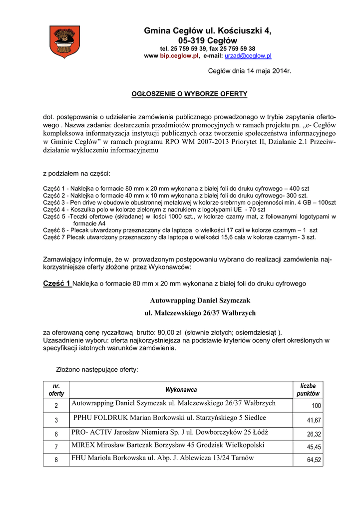 Gmina Cegłów ul. Kościuszki 4, 05-319 Cegłów tel. 25 759 59 39, fax 25 759 59 38 www bip.ceglow.pl, e-mail: [email protected] Cegłów dnia 14 maja 2014r. OGŁOSZENIE O WYBORZE OFERTY dot. postępowania o udzielenie zamówienia publicznego prowadzonego w trybie zapytania ofertowego . Nazwa zadania: dostarczenia przedmiotów promocyjnych w ramach projektu pn. „e- Cegłów kompleksowa informatyzacja instytucji publicznych oraz tworzenie społeczeństwa informacyjnego w Gminie Cegłów” w ramach programu RPO WM 2007-2013 Priorytet II, Działanie 2.1 Przeciwdziałanie wykluczeniu informacyjnemu z podziałem na części: Część 1 - Naklejka o formacie 80 mm x 20 mm wykonana z białej foli do druku cyfrowego – 400 szt Część 2 - Naklejka o formacie 40 mm x 10 mm wykonana z białej foli do druku cyfrowego- 300 szt. Część 3 - Pen drive w obudowie obustronnej metalowej w kolorze srebrnym o pojemności min. 4 GB – 100szt Część 4 - Koszulka polo w kolorze zielonym z nadrukiem z logotypami UE - 70 szt Część 5 -Teczki ofertowe (składane) w ilości 1000 szt., w kolorze czarny mat, z foliowanymi logotypami w formacie A4 Część 6 - Plecak utwardzony przeznaczony dla laptopa o wielkości 17 cali w kolorze czarnym – 1 szt Część 7 Plecak utwardzony przeznaczony dla laptopa o wielkości 15,6 cala w kolorze czarnym- 3 szt. Zamawiający informuje, że w prowadzonym postępowaniu wybrano do realizacji zamówienia najkorzystniejsze oferty złożone przez Wykonawców: Część 1 Naklejka o formacie 80 mm x 20 mm wykonana z białej foli do druku cyfrowego Autowrapping Daniel Szymczak ul. Malczewskiego 26/37 Wałbrzych za oferowaną cenę ryczałtową brutto: 80,00 zł (słownie złotych; osiemdziesiąt ). Uzasadnienie wyboru: oferta najkorzystniejsza na podstawie kryteriów oceny ofert określonych w specyfikacji istotnych warunków zamówienia. Złożono następujące oferty: nr. oferty Wykonawca liczba punktów 2 Autowrapping Daniel Szymczak ul. Malczewskiego 26/37 Wałbrzych 3 PPHU FOLDRUK Marian Borkowski ul. Starzyńskiego 5 Siedlce 41,67 6 PRO- ACTIV Jarosław Niemiera Sp. J ul. Dowborczyków 25 Łódź 26,32 7 MIREX Mirosław Bartczak Borzysław 45 Grodzisk Wielkopolski 45,45 8 FHU Mariola Borkowska ul. Abp. J. Ablewicza 13/24 Tarnów 64,52 100 Część 2 – Naklejka o formacie 40 mm x 10 mm wykonana z białej foli do druku cyfrowego Autowrapping Daniel Szymczak ul. Malczewskiego 26/37 Wałbrzych za oferowaną cenę ryczałtową brutto: 45,00 zł (słownie złotych: czterdzieści pięć złotych). Uzasadnienie wyboru: oferta najkorzystniejsza na podstawie kryteriów oceny ofert określonych w specyfikacji istotnych warunków zamówienia. Złożono następujące oferty: nr. oferty Wykonawca liczba punktów 2 Autowrapping Daniel Szymczak ul. Malczewskiego 26/37 Wałbrzych 3 PPHU FOLDRUK Marian Borkowski ul. Starzyńskiego 5 Siedlce 42,86 6 PRO- ACTIV Jarosław Niemiera Sp. J ul. Dowborczyków 25 Łódź 31,25 7 MIREX Mirosław Bartczak Borzysław 45 Grodzisk Wielkopolski 31,25 8 FHU Mariola Borkowska ul. Abp. J. Ablewicza 13/24 Tarnów 60,00 100 Część 3 – Pen drive w obudowie obustronnej metalowej w kolorze srebrnym – w tej części postępowanie zostaje unieważnione ze względu na nieprecyzyjny opis zamówienia, w związku z tym nie można było dokonać porównania ofert. Część 4 – Koszulka polo w kolorze zielonym z nadrukiem z logotypami UE – w tej części postępowanie zostaje unieważnione ze względu na nieprecyzyjny opis zamówienia, w związku z tym nie można było dokonać porównania ofert. Część 5 – Teczki ofertowe (składane) w ilości 1000 szt., w kolorze czarny mat, z foliowanymi logotypami w formacie A4, Autowrapping Daniel Szymczak ul. Malczewskiego 26/37 Wałbrzych za oferowaną cenę ryczałtową brutto: 1 160,00 zł (słownie złotych: jeden tysiąc sto sześćdziesiąt). Uzasadnienie wyboru: oferta najkorzystniejsza na podstawie kryteriów oceny ofert określonych w specyfikacji istotnych warunków zamówienia. nr. oferty Wykonawca liczba punktów 2 Autowrapping Daniel Szymczak ul. Malczewskiego 26/37 Wałbrzych 3 PPHU FOLDRUK Marian Borkowski ul. Starzyńskiego 5 Siedlce 52,73 5 TEXAR Bartosz Kościółek ul. Wesoła 3, Krzeszowice 81,75 100 6 PRO- ACTIV Jarosław Niemiera Sp. J ul. Dowborczyków 25 Łódź 36,94 7 MIREX Mirosław Bartczak Borzysław 45 Grodzisk Wielkopolski 42,18 8 FHU Mariola Borkowska ul. Abp. J. Ablewicza 13/24 Tarnów 62,37 Część 6 – Plecak utwardzony przeznaczony dla laptopa o wielkości 17 cali w kolorze czarnym Autowrapping Daniel Szymczak ul. Malczewskiego 26/37 Wałbrzych za oferowaną cenę ryczałtową brutto: 90,00 zł (słownie złotych; dziewięćdziesiąt ). Uzasadnienie wyboru: oferta najkorzystniejsza na podstawie kryteriów oceny ofert określonych w specyfikacji istotnych warunków zamówienia. nr. oferty Wykonawca liczba punktów 2 Autowrapping Daniel Szymczak ul. Malczewskiego 26/37 Wałbrzych 3 PPHU FOLDRUK Marian Borkowski ul. Starzyńskiego 5 Siedlce 46,17 6 PRO- ACTIV Jarosław Niemiera Sp. J ul. Dowborczyków 25 Łódź 52,95 7 MIREX Mirosław Bartczak Borzysław 45 Grodzisk Wielkopolski 61,71 8 FHU Mariola Borkowska ul. Abp. J. Ablewicza 13/24 Tarnów 60,98 100 Część 7 – Plecak utwardzony przeznaczony dla laptopa o wielkości 15,6 cala w kolorze czarnym PRO- ACTIV Jarosław Niemiera Sp. J ul. Dowborczyków 25 Łódź za oferowaną cenę ryczałtową brutto: 200,22 zł (słownie złotych: dwieście i 22/100.) Uzasadnienie wyboru: oferta najkorzystniejsza na podstawie kryteriów oceny ofert określonych w specyfikacji istotnych warunków zamówienia. Złożono następujące oferty: nr. oferty Wykonawca liczba punktów 2 Autowrapping Daniel Szymczak ul. Malczewskiego 26/37 Wałbrzych 74,16 3 PPHU FOLDRUK Marian Borkowski ul. Starzyńskiego 5 Siedlce 55,66 6 PRO- ACTIV Jarosław Niemiera Sp. J ul. Dowborczyków 25 Łódź 100 7 MIREX Mirosław Bartczak Borzysław 45 Grodzisk Wielko
