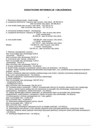 '2'$7.2:(,1)250$&-(,2%-$ĝ1,(1,$ I 15]HF]RZHDNW\ZDWUZDáHĞURGNLWUZDáH DXU]ąG]HQLDWHFKQLF]QHLPDV]\Q\VWDQQDSRF]URNXREURW26 354,40]á stan na koniec roku obrot.- 26 354,40]á ELQQHĞURGNLWUZDáHVWDQQDSRF]URNXREURW107.707,01]á stan na koniec roku obrot. - 107 707,01]á 28PRU]HQLHĞURGNyZWUZDá\FKDPRUW\]DFMD DXU]ąG]HQLDWHFKQLF]QHLPDV]\Q\26.354,40 - stan na pocz roku obrot 0,00- amortyzacja, 26.354,40 - stan na koniec roku obrot, ELQQHĞURGNLWUZDáH106.590,36 - stan na pocz. roku obrot., 1.116,65 - amortyzacja 107.707,01 - stan na koniec roku obrot. Razem 132.944,76 - stan na pocz. roku obrot 1.116,65 - amortyzacja 134.061,41 - stan na koniec roku obrot. 3:DUWRĞFLQLHPDWHULDOQHLSUDZQH VWDQQDSRF]ąWHNURNXREURWRZHJR0,00]á przychody 752,87]á stan na koniec roku obrotowego 752,87]á 4. Umorzenie wart. niemat. i prawnych 6WDQQDSRF]ąWHNURNXREURWRZHJR0,00]á amortyzacja 752,87]á Stan na koniec roku obrotowego 752,87]á 5*UXQW\XĪ\WNRZDQHZLHF]\ĞFLHQLHGRW\F]\ 6ĝURGNLWUZDáHXĪ\ZDQHQDSRGVWDZLHXPRZ\QDMPXOXEG]LHUĪDZ\QLHGRW\F]\ 7=RERZZREHFEXGĪHWXSDĔVWZDOXEMHGQRVWHNVDPRU]ąGXWHU\W]W\WX]\VNDQLDSUDZDZáDVQRĞFLEXG\QNyZL budowli - nie ma 8'DQHRVWUXNWXU]HZáDVQRĞFLNDSLWDáXSRGVWDZRZHJRRUD]OLF]ELHLZDUWRĞFLQRPLQDOQHMVXEVNU\ERZDQ\FK akcji, w tym uprzywilejowanych - nie dotyczy 9ħUyGáD]ZLĊNV]HQLDLZ\NRU]\VWDQLHIXQGXV]XVWDWXWRZHJR Fundusz statutowy 6WDQQDSRF]ąWHNURNXREURWRZHJR148.307,43]á ]ZLĊNV]HQLD0,00]á - zmniejszenia 0,00]á Stan na koniec roku obrotowego 148.307,43]á 10)XQGDFMDVWUDWĊZZ\VRNRĞFL7.990,91]áSRVWDQRZLáD]DOLF]\üGRNRV]WyZVWDWXWRZ\FKURNXQDVWĊSQHJR 11'DQHRVWDQLHUH]HUZZHGáXJFHOXLFKXWZRU]HQLDQDSRF]ąWHNURNXREURWRZHJR]ZLĊNV]HQLDFK Z\NRU]\VWDQLXUR]ZLą]DQLXLVWDQLHNRĔFRZ\PQLHGRW\F]\ 122GSLV\DNWXDOL]XMąFHZDUWRĞüQDOHĪQRĞFL]HZVND]DQLHPVWDQXQDSRF]ąWHNURNXREURWRZHJR ]ZLĊNV]HQLDFKZ\NRU]\VWDQLXUR]ZLą]DQLXLVWDQLHQDNRQLHFURNXREURWRZHJRQLHGRW\F]\ 13=RERZLą]DQLDRRNUHVLHZ\PDJDOQRĞFLGR1URNXRJyáHP 6WDQQDSRF]ąWHNURNX3.342,76]á Stan na koniec roku - 6.524,80]á 145R]OLF]HQLDPLĊG]\RNUHVRZHF]\QQHLELHUQH 6WDQQDSRF]ąWHNURNX108,61]á Stan na koniec roku - 0,00]á 15:\ND]JUXS]RERZLą]DĔ]DEH]SLHF]RQ\FKQDPDMąWNXMHGQRVWNLQLHGRW\F]\ 16=RERZLą]DQLDZDUXQNRZHZW\PUyZQLHĪXG]LHORQHSU]H]MHGQRVWNĊJZDUDQFMHLSRUĊF]HQLDWDNĪH ZHNVORZHRGUĊEQLHQDOHĪ\Z\ND]DüLQIRUPDFMHGRW\F]ąFHJZDUDQFMLLSRUĊF]HĔZREHFMHGQRVWHNSRZLą]DQ\FK - nie dotyczy 17,QZHVW\FMHGáXJRWHUPLQRZHQLHGRW\F]\ II Druk: MPiPS 1VWUXNWXUDU]HF]RZDURG]DMHG]LDáDOQRĞFLLWHU\WRULDOQDNUDMHNVSRUWSU]\FKRGyZQHWWR]HVSU]HGDĪ\ SURGXNWyZWRZDUyZLPDWHULDáyZ 6SU]HGDĪQHWWRRJyáHPFDá\NUDM =DSRSU]HGQLURNREURWRZ\=DELHĪąF\URNREURWRZ\ SU]\FKRG\]G]LDáDOQRĞFLVWDWXWRZHMRGSáDWQHM25.007,00]á32.285,00]á SU]\FKRG\]G]LDáDOQRĞFLVWDWXWRZHMQLHRGSáDWQHM154.610,05]á174.932,04]á LQQHSU]\FKRG\]G]LDáDOQRĞFLVWDWXWRZHM3.090,77]á23.639,84]á 2Z\VRNRĞüLZ\MDĞQLHQLHSU]\F]\QRGSLVyZDNWXDOL]XMąF\FKĞURGNLWUZDáHQLHGRW\F]\ 3Z\VRNRĞüRGSLVyZDNWXDOL]XMąF\FKZDUWRĞü]DSDVyZQLHGRW\F]\ 4LQIRUPDFMDRSU]\FKRGDFKNRV]WDFKLZ\QLNDFKG]LDáDOQRĞFL]DQLHFKDQHMZURNXREURWRZ\POXESU]HZLG]LDQHM GR]DQLHFKDQLDZURNXQDVWĊSQ\PQLHGRW\F]\ 5UR]OLF]HQLHJáyZQ\FKSR]\FMLUyĪQLąF\FKSRGVWDZĊRSRGDWNRZDQLDSRGDWNLHPGRFKRGRZ\PRGZ\QLNX finansowego (zysku, straty) brutto: -Przychody bilansowe brutto: 230.875,93]á zmniejszenie przych. podatk. 23.183,83 *Przychody podatkowe: 207.692,10]á - Koszty bilansowe - 238.826,84]á * zmniejszenie kosztów podatkowych - NKUP - 212,32]á * zmniejszenie kosztów podatkowych - amortyzacja - 0,00]á ]ZLĊNV]HQLHNRV]WyZSRGDWNRZ\FKXP]OHFHQLH0,00]á ]ZLĊNV]HQLHNRV]WyZSRGDWNRZ\FKRSRQLHVLRQHZ\GDWNLQDUHDOL]DFMHSURMHNWXSQ6WURMHOXGRZHZ .DUSDWDFKSROVNLFK6WUyMPLHV]F]DQFLHV]\ĔVNLFK0,00]á ]PQLHMV]HQLHNRV]WyZSRGDWNRZ\FKNRV]W\VWDWXWRZHSRNU\WHGRWDFMą0,00]á - Koszty podatkowe- koszty uzyskania przychodów - 238.614,52]á - Dochód/ strata (podatkowo) - 30.922,42]á 2GOLF]HQLHRGSRGVWRSRGDWNRZDQLDGRFKRGyZZROQ\FKRGSRGDWNXSU]H]QQDG]LDáVWDWXWRZąDUW17 ust. 1 pkt 4 ustawy o pdop - 0,00]á - Podstawa opodatkowania 212,00 Podatek 40,00 6'DQHRNRV]WDFKZ\WZRU]HQLDSURGXNWyZQDZáDVQHSRWU]HE\LNRV]W\URG]DMRZHQLHGRW\F]\SRQLHZDĪ MHGQRVWNDVSRU]ąG]DUDFKXQHN]\VNyZLVWUDWZXNáDG]LHURG]DMRZ\P 7.RV]WZ\WZRU]HQLDĞURGNyZWUZDá\FKZEXGRZLHZW\PRGVHWNLRUD]VNDSLWDOL]RZDQHUyĪQLFHNXUVRZHRG ]RERZLą]DĔ]DFLąJQLĊW\FKZFHOXLFKVILQDQVRZDQLDQLHGRW\F]\ 83RQLHVLRQHZRVWDWQLPURNXLSODQRZDQHQDQDVWĊSQ\URNQDNáDG\QDQLHILQDQVRZHDNW\ZDWUZDáHRGUĊEQLH QDOHĪ\Z\ND]DüSRQLHVLRQHLSODQRZDQHQDNáDG\QDRFKURQĊĞURGRZLVNDQLHGRW\F]\ 9LQIRUPDFMHR]\VNDFKLVWUDWDFKQDG]Z\F]DMQ\FK]SRG]LDáHPQDORVRZHLSR]RVWDáHQLHGRW\F]\ 10) podatek dochodowy od wyniku na operacjach nadzwyczajnych - nie dotyczy IIa 'ODSR]\FMLELODQVXRUD]UDFKXQNX]\VNyZLVWUDWZ\UDĪRQ\FKZZDOXWDFKREF\FKNXUV\SU]\MĊWHGRLFKZ\FHQ\ - nie dotyczy III -HGQRVWNDQLHVSRU]ąG]DUDFKXQNXSU]HSá\ZyZĞURGNyZSLHQLĊĪQ\FK IV Druk: MPiPS Informacje o: 1FKDUDNWHU]HLFHOXJRVSRGDUF]\P]DZDUW\FKSU]H]MHGQRVWNĊXPyZQLHXZ]JOĊGQLRQ\FKZELODQVLHZ]DNUHVLH QLH]EĊGQ\PGRRFHQ\LFKZSá\ZXQDV\WXDFMĊPDMąWNRZąILQDQVRZąLZ\QLNILQDQVRZ\MHGQRVWNLQLHGRW\F]\ 2LVWRWQ\FKWUDQVDNFMDFKZUD]]LFKNZRWDPL]DZDUW\FKSU]H]MHGQRVWNĊQDLQQ\FKZDUXQNDFKQLĪU\QNRZH]H VWURQDPLSRZLą]DQ\PLSU]H]NWyUHUR]XPLHVLĊMHGQRVWNLSRZLą]DQHQLHGRW\F]\ DRVREĊNWyUDMHVWF]áRQNLHPRUJDQX]DU]ąG]DMąFHJRQDG]RUXMąFHJROXEDGPLQLVWUXMąFHJRMHGQRVWNLOXE MHGQRVWNL]QLąSRZLą]DQHMQLHGRW\F]\ ERVREĊNWyUDMHVWPDáĪRQNLHPOXERVREąIDNW\F]QLHSR]RVWDMąFąZHZVSyOQ\PSRĪ\FLXNUHZQ\POXE SRZLQRZDW\PGRGUXJLHJRVWRSQLDSU]\VSRVRELRQ\POXESU]\VSRVDELDMąF\PRVREą]ZLą]DQą]W\WXáXRSLHNL OXENXUDWHOLZVWRVXQNXGRNWyUHMNROZLHN]RVyEEĊGąF\FKF]áRQNDPLRUJDQX]DU]ąG]DMąFHJRQDG]RUXMąFHJROXE DGPLQLVWUXMąFHJRMHGQRVWNLOXEMHGQRVWNL]QLąSRZLą]DQHMQLHGRW\F]\ FMHGQRVWNĊNRQWURORZDQąZVSyáNRQWURORZDQąOXELQQąMHGQRVWNĊQDNWyUą]QDF]ąF\ZSá\ZZ\ZLHUDOXE SRVLDGDZQLHM]QDF]ąFąLORĞüJáRVyZEH]SRĞUHGQLRDOERSRĞUHGQLRRVREDRNWyUHMPRZDZOLWDLEQLH dotyczy GMHGQRVWNĊUHDOL]XMąFąSURJUDPĞZLDGF]HĔSUDFRZQLF]\FKSRRNUHVLH]DWUXGQLHQLDVNLHURZDQ\GR SUDFRZQLNyZMHGQRVWNLOXELQQHMMHG