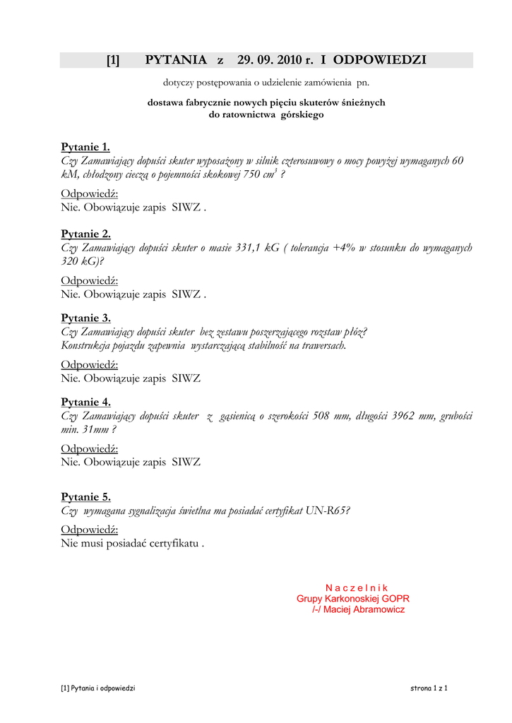 [1] PYTANIA z 29. 09. 2010 r. I ODPOWIEDZI dotyczy postępowania o udzielenie zamówienia pn. dostawa fabrycznie nowych pięciu skuterów śnieżnych do ratownictwa górskiego Pytanie 1. Czy Zamawiający dopuści skuter wyposażony w silnik czterosuwowy o mocy powyżej wymaganych 60 kM, chłodzony cieczą o pojemności skokowej 750 cm3 ? Odpowiedź: Nie. Obowiązuje zapis SIWZ . Pytanie 2. Czy Zamawiający dopuści skuter o masie 331,1 kG ( tolerancja +4% w stosunku do wymaganych 320 kG)? Odpowiedź: Nie. Obowiązuje zapis SIWZ . Pytanie 3. Czy Zamawiający dopuści skuter bez zestawu poszerzającego rozstaw płóz? Konstrukcja pojazdu zapewnia wystarczającą stabilność na trawersach. Odpowiedź: Nie. Obowiązuje zapis SIWZ Pytanie 4. Czy Zamawiający dopuści skuter z gąsienicą o szerokości 508 mm, długości 3962 mm, grubości min. 31mm ? Odpowiedź: Nie. Obowiązuje zapis SIWZ Pytanie 5. Czy wymagana sygnalizacja świetlna ma posiadać certyfikat UN-R65? Odpowiedź: Nie musi posiadać certyfikatu . Naczelnik Grupy Karkonoskiej GOPR /-/ Maciej Abramowicz [1] Pytania i odpowiedzi strona 1 z 1