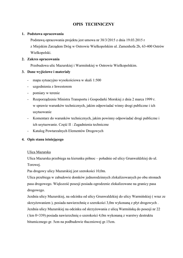 OPIS TECHNICZNY 1. Podstawa opracowania Podstawą opracowania projektu jest umowa nr 38/3/2015 z dnia 19.03.2015 r z Miejskim Zarządem Dróg w Ostrowie Wielkopolskim ul. Zamenhofa 2b, 63-400 Ostrów Wielkopolski. 2. Zakres opracowania Przebudowa ulic Mazurskiej i Warmińskiej w Ostrowie Wielkopolskim. 3. Dane wyjściowe i materiały - mapa sytuacyjno wysokościowa w skali 1:500 - uzgodnienia z Inwestorem - pomiary w terenie - Rozporządzenie Ministra Transportu i Gospodarki Morskiej z dnia 2 marca 1999 r. w sprawie warunków technicznych, jakim odpowiadać winny drogi publiczne i ich usytuowanie - Komentarz do warunków technicznych, jakim powinny odpowiadać drogi publiczne i ich usytuowanie. Część II : Zagadnienia techniczne - Katalog Powtarzalnych Elementów Drogowych 4. Opis stanu istniejącego Ulica Mazurska Ulica Mazurska przebiega na kierunku północ – południe od ulicy Grunwaldzkiej do ul. Torowej. Pas drogowy ulicy Mazurskiej jest szerokości 10,0m. Ulica przebiega w zabudowie domków jednorodzinnych zlokalizowanych po obu stronach pasa drogowego. Większość posesji posiada ogrodzenie zlokalizowane na granicy pasa drogowego. Jezdnia ulicy Mazurskiej, na odcinku od ulicy Grunwaldzkiej do ulicy Warmińskiej ( wraz ze skrzyŜowaniem ), posiada nawierzchnię o szerokości 3,0m wykonaną z płyt drogowych . Jezdnia ulicy Mazurskiej na odcinku od skrzyŜowania z ulicą Warmińską do posesji nr 22 ( km 0+339) posiada nawierzchnię o szerokości 4,0m wykonaną z warstwy destruktu bitumicznego gr. 5cm na podbudowie tłuczniowej gr.15cm. Na projektowanym odcinku zlokalizowane są skrzyŜowania: 1. km 0+000.00 – z ul. Grunwaldzką – droga gminna – nawierzchnia bitumiczna 2. km 0+190.14 – z ul. Łęczycką– droga gminna - nawierzchnia z kostki betonowej 3. km 0+271.61 – z ul. Warmińską – droga gminna - nawierzchnia z kostki betonowej wg projektu 4. km 0+355.96 – z ul. Torową – droga gminna - nawierzchnia gruntowa W pasie drogowym projektowanego odcinka występuje następujące uzbrojenie: − kablowa linia telekomunikacyjna przebiegająca na odcinku od ul. Grunwaldzkiej do ul. Warmińskiej po obu stronach pasa drogowego, przy jego granicach − napowietrzna linia energetyczna NN zlokalizowana na odcinku Grunwaldzka – Warmińska przy wschodniej granicy pasa drogowego. Na słupach w/w linii zamontowane oprawy oświetleniowe. − kablowa linia energetyczna NN odc. Warmińska – Torowa po wschodniej stronie pasa drogowego − wodociąg w150 – odc. Grunwaldzka – Warmińska po stronie wschodniej pasa drogowego − wodociąg w80 – odc. Warmińska – Torowa po stronie wschodniej pasa drogowego − gazociąg g150 odc. Grunwaldzka – Warmińska po stronie wschodniej pasa drogowego − gazociąg g63 odc. Warmińska – Torowa po stronie wschodniej pasa drogowego − kanalizacja sanitarna ks200 od km 0+030.27 do km 0+326.62 po zachodniej stronie pasa drogowego − kabel energetyczny NN –zlokalizowany na odcinku od ul. Grunwaldzkiej do Warmińskiej po zachodniej stronie pasa drogowego − kabel energetyczny SN na odc. Grunwaldzka – Łęczycka przebiegający po zachodniej stronie pasa drogowego – własność WODKAN − oświetlenie uliczne ( 3 lampy ) zasilane kablem energetycznym NN , zlokalizowane na odc. Warmińska – Torowa przy zachodniej granicy pasa drogowego. W pasie drogowym ulicy Mazurskiej nie występuje zadrzewienie. Do jezdni ulicy Mazurskiej doprowadzone są dojazdy do bram i dojścia do furtek wykonane przez mieszkańców. Dojazdy i dojścia posiadają róŜną konstrukcję i wykonane są z róŜnych materiałów. Ulica Warmińska Ulica Warmińska na projektowanym odcinku przebiega na kierunku wschód – zachód od km 0+000.00 do ul. Pomorskiej. Początek projektowanego odcinka zlokalizowany został na granicy pasa drogowego będącego we władaniu Inwestora. Pas drogowy ulicy Warmińskiej na odcinku od km 0+000.00 do ulicy Toruńskiej jest szerokości 10,0m. Na pozostałym odcinku pas drogowy posiada szerokość od 7,85 – 7,90m. Ulica przebiega w zabudowie domków jednorodzinnych zlokalizowanych po obu stronach pasa drogowego. Większość posesji posiada ogrodzenie zlokalizowane na granicy pasa drogowego. Na projektowanym odcinku zlokalizowane są skrzyŜowania: 1. km 0+039.67 – z ul. Mazurską – droga gminna – nawierzchnia z kostki betonowej wg projektu 2. km 0+146.85 – z ul. Toruńską– droga gminna - nawierzchnia bitumiczna 3. km 0+253.86 – z ul. Pomorską – droga gminna - nawierzchnia z kostki betonowej W pasie drogowym projektowanego odcinka występuje następujące uzbrojenie: − kablowa linia telekomunikacyjna zlokalizowana przy południowej granicy pasa drogowego − kablowa linia energetyczna zlokalizowana na odcinku od km 0+000.00 do ul. Mazurskiej po południowej stronie pasa drogowego − napowietrzna linia energetyczna zlokalizowana na odcinku od ul. Mazurskiej do ul. Toruńskiej po południowej stronie pasa drogowego oraz na odcinku od ul. Toruńskiej do ul. Pomorskiej po północnej stronie pasa drogowego. Na słupach w/w linii zamontowane są oprawy oświetleniowe. − kanalizacja sanitarna ks200 na odcinku od ul. Mazurskiej do Pomorskiej po południowej stronie pasa drogowego − gazociąg g63 przechodzący przy ul. Mazurskiej z południowej na północną stronę pasa drogowego i biegnący do ul. Toruńskiej. − wodociąg w125 od km 0+000.00 do ul. Mazurskiej oraz wodociąg w100 od ul. Mazurskiej do ul. Pomorskiej po północnej stronie pasa drogowego. W pasie drogowym ulicy Mazurskiej nie występuje zadrzewienie. Do jezdni ulicy Mazurskiej doprowadzone są dojazdy do bram i dojścia do furtek wykonane przez mieszkańców. Dojazdy i dojścia posiadają róŜną konstrukcję i wykonane są z róŜnych materiałów. 5. Opis projektu Przebudowa jest zgodna z Decyzją o ustaleniu lokalizacji inwestycji celu publicznego wydaną przez Prezydenta Miasta Ostrowa Wielkopolskiego – pismo nr WAP.RAU.6733.39.201