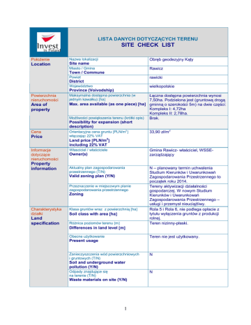LISTA DANYCH DOTYCZĄCYCH TERENU SITE CHECK LIST Położenie Nazwa lokalizacji Location Site name Obręb geodezyjny Kąty Miasto / Gmina Rawicz Town / Commune Powiat rawicki District Województwo wielkopolskie Province (Voivodship) Powierzchnia nieruchomości Maksymalna dostępna powierzchnia (w jednym kawałku) ha Cena Łączna dostępna powierzchnia wynosi 7,50ha. Podzielona jest (gruntową drogą Max. area available (as one piece) ha gminną o szerokości 5m) na dwie części: Kompleks I: 4,72ha Kompleks II: 2,78ha. Możliwości powiększenia terenu (krótki opis) Brak. Possibility for expansion (short description) 2 Orientacyjna cena gruntu PLN/m 33,90 zł/m2 Price włączając 22% VAT Informacje dotyczące nieruchomości Własciciel / właściciele Area of property Property information Land price PLN/m2 including 22% VAT Gmina Rawicz- właściciel, WSSEzarządzający Owner(s) Aktualny plan zagospodarowania przestrzennego (T/N) Valid zoning plan (Y/N) Przeznaczenie w miejscowym planie zagospodarowania przestrzennego Zoning Charakterystyka działki Land specification Klasa gruntów wraz z powierzchnią ha Soil class with area ha Różnica poziomów terenu m N – planowany termin uchwalenia Studium Kierunków i Uwarunkowań Zagospodarowania Przestrzennego to początek roku 2014. Tereny aktywizacji działalności gospodarczej. W nowym Studium Kierunków i Uwarunkowań Zagospodarowania Przestrzennego – usługi i przemysł nieuciążliwy. Rola 5 i Rola 6, nie podlega opłacie z tytułu wyłączenia gruntów z produkcji rolnej. Teren nizinny-płaski. Differences in land level m Obecne użytkowanie Teren nie jest użytkowany. Present usage Zanieczyszczenia wód powierzchniowych i gruntowych (T/N) N Soil and underground water pollution (Y/N) Odpady znajdujące się na terenie (T/N) N Waste materials on site (Y/N) 1 0,9 - 1,50m Poziom wód gruntowych m Underground water level m Ryzyko wystąpienia zalań lub obsunięć terenu (T/N) N Risk of flooding or land slide (Y/N) Przeszkody podziemne (T/N) N Underground obstacles (Y/N) Przeszkody występujące na powierzchni terenu (T/N) Ground and overhead obstacles (Y/N) Istniejące ograniczenia ekologiczne (T/N) W pn.-wsch. części linia energetyczna średniego napięcia. N Ecological restrictions (Y/N) Budynki i zabudowania na terenie (T/N) Teren niezabudowany. Buildings / other constructions on site (Y/N) Ograniczenia budowlane Procent dopuszczalnej zabudowy Building coverage % Building restrictions Ograniczenia wysokości budynków m Building height limit m Strefa buforowa m Informacja w odpowiedzi na konkretny wniosek sporządzona przez urbanistę w projekcie decyzji o warunkach zabudowy. Informacja w odpowiedzi na konkretny wniosek sporządzona przez urbanistę w projekcie decyzji o warunkach zabudowy. brak Buffer zone m Inne, jeśli występują brak Others if any Połączenia transportowe Transport links Droga dojazdowa do terenu (rodzaj drogi i jej szerokość) Access road to the plot (type and width of access road) Autostrada / droga krajowa km Nearest motorway / national road km Kolej km Railway line km Dostęp do DK nr 5 o szerokości ok. 7m z gminnej drogi gruntowej o szerokości ok. 5m. DK nr 5 oddzielona jedynie pasem zieleni od strefy, S5 w budowie w odległości ok. 4km od strefy, A8 w odległości ok. 50km, do A2 ok.90km (przez Komorniki) Dworzec kolejowy i towarowy – Rawicz, ul. Dworcowa – 3,5 km od strefy Railway siding km Rawicz Wschód – Rawicz, ul. Kamińskiego – 2,5 km od strefy Najbliższe lotnisko międzynarodowe km Wrocław- 75 km Bocznica kolejowa km Nearest international airport km 2 Najbliższe miasto wojewódzkie km Wrocław ok. 65 km Nearest province capital km Istniejąca infrastruktura Existing infrastructure Elektryczność na terenie (T/N) Podmiot odpowiedzialny- ENEA SA Electricity (Y/N) Odległość przyłącza od granicy terenu Przyłącze do 300kW z linii 15kV przebiegającej przy strefie. Connection point (distance from boundary) m Napięcie Voltage kV 15/04kV Dostępna moc W przypadku mocy 2-4MW z przyłącza kablowego z GPZ w odległości 3km. Available capacity MW Gaz na terenie (T/N) Podmiot odpowiedzialny- Wielkopolska Spółka Gazownictwa o. Poznań Gas (Y/N) Odległość przyłącza od granicy działki Punkt poboru 1700m Connection point (distance from boundary) m Wartość kaloryczna Calorific value MJ/Nm3 180mm Średnica rury Pipe diameter mm Dostępna objętość Available capacity Nm3/h Woda na terenie (T/N) Water supply (Y/N) Odległość przyłącza od granicy terenu Connection point (distance from boundary) m Dostępna objętość Podmiot odpowiedzialny – Zakład Wodociągów i Kanalizacji w Rawiczu. Nie ma podziału na wodę do celów socjalnych i przemysłowych. Obowiązuje jedna taryfa za wodę, różnica zawiera się w cenie ścieków. Ok. 200m do sieci, dodatkowo możliwość zasilania z innego miejsca sieci miejskiej dostarczającej wodę ze stacji uzdatniania wody w Załęczu (k. Rawicza) Wynika z potrzeb zamawiającego. Available capacity m3/24h Kanalizacja na terenie (T/N) N Sewage discharge (Y/N) Odległość przyłącza od granicy terenu Kompleks I: ok. 10 m Kompleks II: ok. 3 m Connection point (distance from boundary) m 3 432m /24h Dostępna objętość 3 Available capacity m /24h 3 Ograniczenie zrzutu ścieków Limitation of discharge Odprowadzenie wód deszczowych na terenie (T/N) Rain water discharge (Y/N) Oczyszczalnia ścieków na terenie bądź w bezpośrednim sąsiedztwie Treatment plant (Y/N) Telefony (T/N) Odległość przyłącza od granicy terenu Connection point (distance from boundary) m Liczba dostępnych linii analogowych Number of available analog lines Kanalizacja deszczowa w odległości: Kompleks I: ok. 6 m Kompleks II: ok. 1 m Rawicz-ul. Półwiejska, w odległości ok. 2 km. Konieczność negocjacji indywidualnie z operatorami. Telephone (Y/N) Konkretne pierwiastki określone w załączniku. Liczba dostępnych linii ISDN Number of available ISDN line