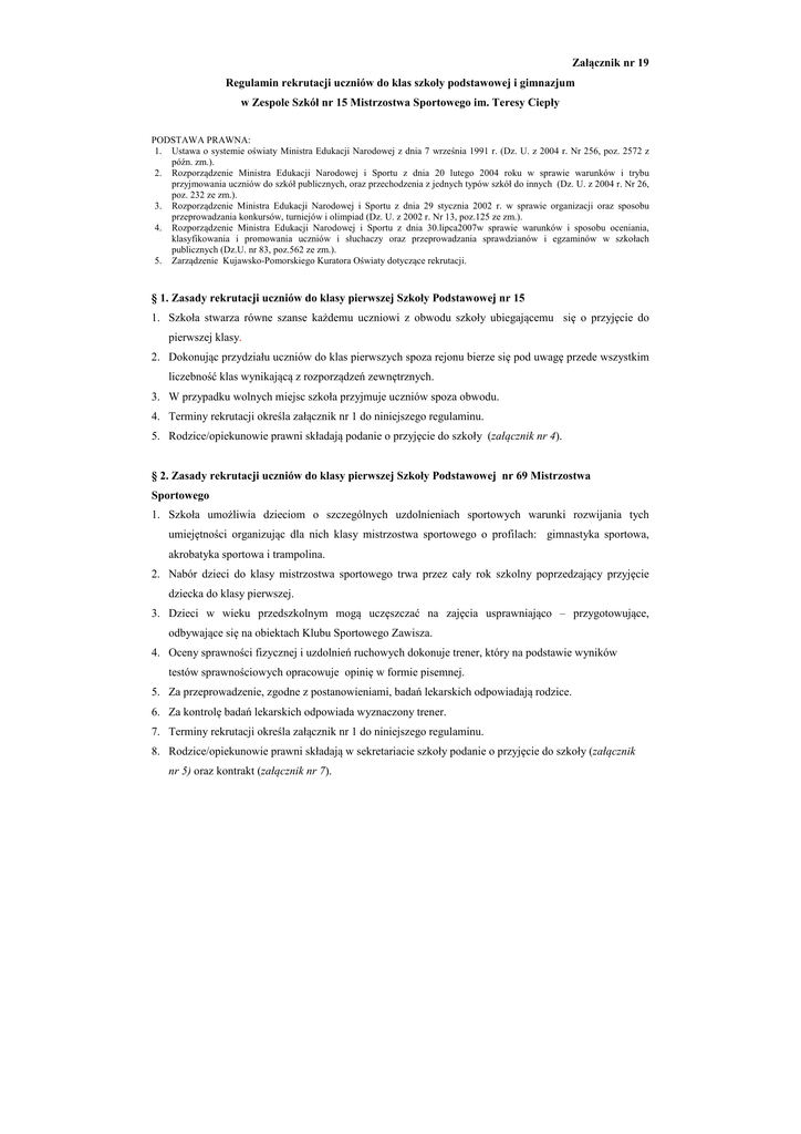 Załącznik nr 19 Regulamin rekrutacji uczniów do klas szkoły podstawowej i gimnazjum w Zespole Szkół nr 15 Mistrzostwa Sportowego im. Teresy Ciepły PODSTAWA PRAWNA: 1. Ustawa o systemie oświaty Ministra Edukacji Narodowej z dnia 7 września 1991 r. (Dz. U. z 2004 r. Nr 256, poz. 2572 z późn. zm.). 2. Rozporządzenie Ministra Edukacji Narodowej i Sportu z dnia 20 lutego 2004 roku w sprawie warunków i trybu przyjmowania uczniów do szkół publicznych, oraz przechodzenia z jednych typów szkół do innych (Dz. U. z 2004 r. Nr 26, poz. 232 ze zm.). 3. Rozporządzenie Ministra Edukacji Narodowej i Sportu z dnia 29 stycznia 2002 r. w sprawie organizacji oraz sposobu przeprowadzania konkursów, turniejów i olimpiad (Dz. U. z 2002 r. Nr 13, poz.125 ze zm.). 4. Rozporządzenie Ministra Edukacji Narodowej i Sportu z dnia 30.lipca2007w sprawie warunków i sposobu oceniania, klasyfikowania i promowania uczniów i słuchaczy oraz przeprowadzania sprawdzianów i egzaminów w szkołach publicznych (Dz.U. nr 83, poz.562 ze zm.). 5. Zarządzenie Kujawsko-Pomorskiego Kuratora Oświaty dotyczące rekrutacji. § 1. Zasady rekrutacji uczniów do klasy pierwszej Szkoły Podstawowej nr 15 1. Szkoła stwarza równe szanse każdemu uczniowi z obwodu szkoły ubiegającemu się o przyjęcie do pierwszej klasy. 2. Dokonując przydziału uczniów do klas pierwszych spoza rejonu bierze się pod uwagę przede wszystkim liczebność klas wynikającą z rozporządzeń zewnętrznych. 3. W przypadku wolnych miejsc szkoła przyjmuje uczniów spoza obwodu. 4. Terminy rekrutacji określa załącznik nr 1 do niniejszego regulaminu. 5. Rodzice/opiekunowie prawni składają podanie o przyjęcie do szkoły (załącznik nr 4). § 2. Zasady rekrutacji uczniów do klasy pierwszej Szkoły Podstawowej nr 69 Mistrzostwa Sportowego 1. Szkoła umożliwia dzieciom o szczególnych uzdolnieniach sportowych warunki rozwijania tych umiejętności organizując dla nich klasy mistrzostwa sportowego o profilach: gimnastyka sportowa, akrobatyka sportowa i trampolina. 2. Nabór dzieci do klasy mistrzostwa sportowego trwa przez cały rok szkolny poprzedzający przyjęcie dziecka do klasy pierwszej. 3. Dzieci w wieku przedszkolnym mogą uczęszczać na zajęcia usprawniająco – przygotowujące, odbywające się na obiektach Klubu Sportowego Zawisza. 4. Oceny sprawności fizycznej i uzdolnień ruchowych dokonuje trener, który na podstawie wyników testów sprawnościowych opracowuje opinię w formie pisemnej. 5. Za przeprowadzenie, zgodne z postanowieniami, badań lekarskich odpowiadają rodzice. 6. Za kontrolę badań lekarskich odpowiada wyznaczony trener. 7. Terminy rekrutacji określa załącznik nr 1 do niniejszego regulaminu. 8. Rodzice/opiekunowie prawni składają w sekretariacie szkoły podanie o przyjęcie do szkoły (załącznik nr 5) oraz kontrakt (załącznik nr 7). § 3. Zasady rekrutacji do klasy czwartej Szkoły Podstawowej nr 69 Mistrzostwa Sportowego 1. Szkoła umożliwia dzieciom o szczególnych uzdolnieniach sportowych warunki rozwijania tych umiejętności organizując dla nich klasy mistrzostwa sportowego o profilach: gimnastyka/akrobatyka/trampolina, piłka nożna, lekka atletyka. 2. Nabór dzieci do klasy mistrzostwa sportowego trwa przez cały rok. 3. Dzieci mogą uczęszczać na zajęcia usprawniająco – przygotowujące, odbywające się na obiektach Klubu Sportowego Zawisza. 4. Nabór do czwartej klasy o profilu lekka atletyka i piłka nożna kończy się testem sprawności fizycznej: 1) kandydaci przynoszą własny strój sportowy oraz obuwie typu halowego; 2) konieczne jest też dostarczenie aktualnego badania od lekarza sportowego, potwierdzającego brak przeciwwskazań do realizacji zajęć treningowych w/w dyscyplin; 3) oceny sprawności fizycznej i uzdolnień ruchowych dokonuje trener, który na podstawie wyników testów sprawnościowych opracowuje opinię w formie pisemnej. 5. Klasę czwartą o profilu akrobatyczno – gimnastycznym tworzy się: 1) z uczniów trzecich klas o profilach gimnastyka/akrobatyka/trampolina realizujących obowiązek szkolny w Zespole Szkół nr 15 Mistrzostwa Sportowego im. Teresy Ciepły; 2) z uczniów, których oceny sprawności fizycznej i uzdolnień ruchowych dokonuje trener gimnastyki, akrobatyki lub trampoliny, który na podstawie wyników testów sprawnościowych opracowuje opinię w formie pisemnej. 6. Za przeprowadzenie, zgodne z postanowieniami, badań lekarskich odpowiadają rodzice/ prawni opiekunowie. 7. Za kontrolę badań lekarskich odpowiada wyznaczony trener. 8. Kandydatów ubiegających się o przyjęcie do czwartych klas mistrzostwa sportowego obowiązują: dobre wyniki w nauce, pozytywna ocena zachowania oraz pisemna opinia trenera. 9. Oryginał świadectwa ukończenia trzeciej klasy szkoły podstawowej należy złożyć w dniu zakończenia roku szkolnego. 10. Terminy rekrutacji określa Załącznik nr 2 do niniejszego regulaminu. 11. Rodzice/opiekunowie prawni składają w sekretariacie szkoły podanie o przyjęcie do szkoły (załącznik nr 5) oraz kontrakt (załącznik nr 7) § 4. Zasady rekrutacji do klasy pierwszej Gimnazjum nr 57 Mistrzostwa Sportowego 1. Szkoła umożliwia dzieciom o szczególnych uzdolnieniach sportowych warunki rozwijania tych umiejętności organizując dla nich klasy mistrzostwa sportowego o specjalnościach: 1) lekkoatletyka; 2) piłka nożna; 3) koszykówka; 4) gimnastyka /akrobatyka /trampolina – dla uczniów, którzy trenowali te dyscypliny wcześniej. 2. Przyjęcie do klasy pierwszej mistrzostwa sportowego mogą ubiegać się absolwenci szkół podstawowych, którzy: 1) wykazują bardzo dobry stan zdrowia oraz potwierdzony przez lekarza specjalistę brak przeciwwskazań do realizacji zajęć treningowych w konkretnej dyscyplinie sportowej; 2) uzyskali dobre wyniki z testów sprawności fizycznej; 3) posiadają pisemną zgodę rodziców/prawnych opiekunów na obowiązkowe wyjazdy, finansowane przez rodziców/prawnych o
