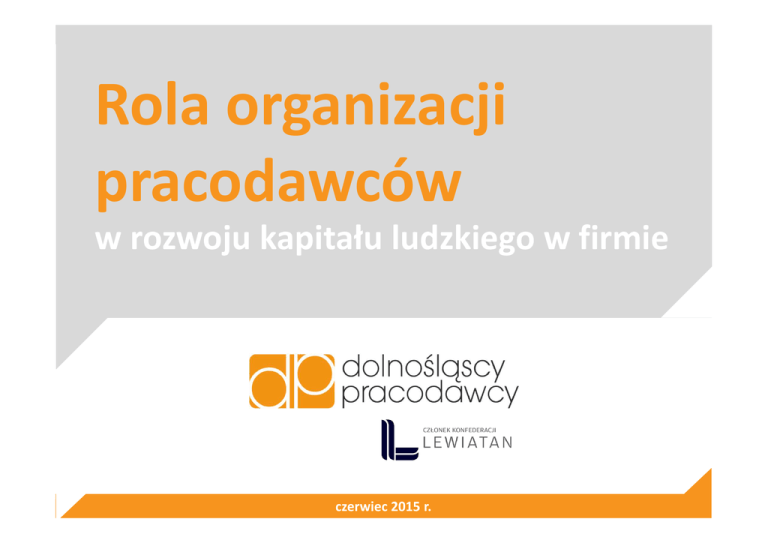 Rola organizacji pracodawców w rozwoju kapitału ludzkiego w firmie czerwiec 2015 r. kim jesteśmy? www.dp.org.pl Kim jesteśmy 1992 r. 2002 r. 2014 r. 2015 r. 145 członków www.dp.org.pl Kim jesteśmy 3900 835 000 Liczba zrzeszonych firm w Lewiatanie Łącznie zatrudnionych osób Liczba opiniowanych projektów legislacyjnych rocznie 200 Liczba przedstawicieli Lewiatana w gremiach międzynarodowych, krajowych, regionalnych 450 Liczba branżowych i regionalnych związków pracodawców oraz 22 członków indywidualnych 57 www.dp.org.pl Kim jesteśmy Liczba zrzeszonych w związku firm 145 Łącznie zatrudnionych osób 5625 www.dp.org.pl Członkowie Związku www.dp.org.pl Członkowie Związku www.dp.org.pl Nasza misja zabiegamy o konkurencyjność dolnośląskiej gospodarki oraz aktywnie reprezentujemy interesy pracodawców www.dp.org.pl Kim jesteśmy Jesteśmy najbardziej wpływową polską organizacją biznesową reprezentującą interesy pracodawców w Polsce i Unii Europejskiej Jesteśmy głosem biznesu! www.dp.org.pl nasze najważniejsze postulaty www.dp.org.pl Najważniejsze postulaty niższe i proste podatki przyjazny klimat dla przedsiębiorczości liberalizacja prawa pracy lepsze prawo gospodarcze niższe koszty pracy tańsze i sprawniejsze państwo rozwój dialogu społecznego www.dp.org.pl Problemy pracodawców przepisy prawne (jakość, stabilność, częste zmiany) stawki ubezpieczenia społecznego jakość współpracy z urzędnikami biurokracja czas na wizyty w urzędach klienci banki pracownicy zrzeszanie się? dostawcy w grupie siła? www.dp.org.pl Co robimy? Kluczowe sfery działania networking, integracja rzecznictwo interesów interwencje usługi wspierające www.dp.org.pl rzecznictwo interesów, interwencje www.dp.org.pl Najważniejsze postulaty SUKCESY LEGISLACYJNE LEWIATANA Doprowadzenie do zmian w Kodeksie Pracy dopuszczających pracę w niedziele i święta Przyjęcie zmian w prawie zamówień publicznych Biała Księga BIS – rekomendacje działań w obszarze gospodarki na ostatni rok działania rządu Wydłużenie vacatio legis dla oskładkowania umów zleceń do 2016 Zmiany w ustawie o partnerstwie oraz programach operacyjnych regulujących ramy wydawania Funduszy UE do 2020 – poprawa dostępności dla firm www.dp.org.pl Rzecznictwo interesów PRZEDSTAWICIELE: Wojewódzka Komisja Dialogu Społecznego Komitet Monitorujący RPO 2014-2020 Województwa Dolnośląskiego Wojewódzka Rada Zatrudnienia Powiatowe Rady Zatrudnienia w 7 powiatach Rady Lewiatana: Dyrektorów Personalnych, Zamówień Publicznych Rada ZIT Wrocławskiego Obszaru Funkcjonalnego Rada Gospodarcza Aglomeracji Wałbrzyskiej www.dp.org.pl Rzecznictwo interesów KONSULTACJE/STANOWISKA/INTERWENCJE: konsultacje RPO i SZOOP RPO – prawie 50 uwag Strategia Rozwoju Polski Zachodniej Program Współpracy Transgranicznej Nowa ustawa o kształcie dialogu społecznego NIE dla klauzuli obejścia prawa – stanowisko odnośnie nowelizacji ordynacji podatkowej Nowelizacja ustawy o instytucjach rynku pracy i promocji zatrudnienia www.dp.org.pl Rzecznictwo interesów KONSULTACJE/STANOWISKA/INTERWENCJE: Co to dało? Zwrócenie uwagi decydentom na problemy dolnośląskiego biznesu. Realny wpływ na zmianę krajowego prawa (nabór wniosków w ramach RPO WD 2007-2013 przez 57 sekund i zmiany w tzw. ustawie wdrożeniowej). Wzmocnienie merytoryczne Dolnośląskich Pracodawców, zbudowanie kompetencji artykułowania interesów pracodawców. Stała i merytoryczna współpraca z Konfederacją Lewiatan www.dp.org.pl Spotkania z decydentami Gala Lewiatana Spotkanie członków - Ossa Debata – konkurencyjność dolnośląskich MSP Wojewoda i Marszałek z partnerami społecznymi www.dp.org.pl Spotkania z decydentami Debata Unijne Środki dla biznesu Debata przedsiębiorcy na Dolnym Śląsku – szanse i wyzwania Wojewoda na spotkaniu noworocznym DP Porozumienie Związków Pracodawców www.dp.org.pl networking, integracja www.dp.org.pl Networking, integracja KLUB DOLNOŚLĄSKICH PRACODAWCÓW 8 spotkań KDP 300 osób Toyota Motor Manufacturing WSSE Invest-Park www.dp.org.pl Spływ pontonowy Hotel Maria Networking, integracja WYDARZENIA DOLNOŚLĄSKICH PRACODAWCÓW Spotkanie noworoczne DP Majówka DP Zimowe szaleństwo z DP Spotkanie noworoczne WYDARZENIA KONFEDERACJI LEWIATAN Gala nagród Lewiatana Piknik letni Lewiatana Zimowe spotkanie członków www.dp.org.pl Networking, integracja Możliwość dystrybucji oferty dla członków DP za pośrednictwem newslettera www.dp.org.pl usługi wspierające www.dp.org.pl Usługi wspierające Fundusze Unijne Szkolenia, warszaty Dyżury, konsultacje prawnicze, alerty prawne www.dp.org.pl Zbiorczy tygodniowy newsletter Sekcje branżowe Sekcja Pracodawców Medycznych Sekcja Kobiet Biznesu www.dp.org.pl rozwój kapitału ludzkiego www.dp.org.pl Akademia Dolnośląskich Pracodawców Akademia DP to inicjatywa, w której członkowie Dolnośląskich Pracodawców oraz najlepsi eksperci z branży dzielą się swą specjalistyczną wiedzą. Projekt skierowany jest do wszystkich firm członkowskich zrzeszonych w Związku. Firmy mogą zostać współorganizatorem lub mogą bezpłatnie delegować swych pracowników na szkolenia. Tematy Akademii: zagadnienia prawne, finansowo-podatkowe, rozwój zasobów ludzkich, fundusze UE 8 edycji Akademii DP w 2015 r. www.dp.org.pl Krajowy Fundusz Szkoleniowy Dolnośląscy Pracodawcy, jako organizacja reprezentująca interesy pracodawców: informuje Państwa o szczegółach dotyczących moŜliwości sfinansowania kształcenia pracowników w Państwa firmach jest gotowa słuŜyć nie tylko informacją, ale takŜe praktycznym wsparciem w wypełnianiu i składaniu niezbędnej dokumentacji przeprowadzi analizę potrzeb szkoleniowych pomoŜe w wyborze firmy szkoleniowej www.dp.org.pl Krajowy Fundusz Szkoleniowy Opinia i Rekomendacje DP i Konfederacji Lewiatan na 2016 r.: Szum komunikacyjny dotyczący zbierania potrzeb szkoleniowych wśród pracodawców, a samym proce
