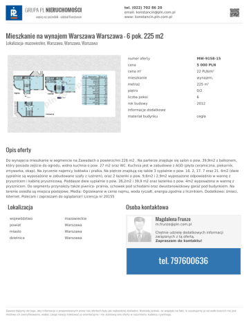 tel. (022) 702 86 20 email: [email protected] www: konstancin.pln.com.pl Mieszkanie na wynajem Warszawa Warszawa - 6 pok. 225 m2 Lokalizacja: mazowieckie, Warszawa, Warszawa, Warszawa numer oferty MW-9158-15 cena 5 000 PLN cena m 22 PLN/m2 mieszkanie wynajem, metraż 225 m2 piętro 0/2 liczba pokoi 6 rok budowy 2012 2 informacje dodatkowe materiał budynku cegła Opis oferty Do wynajęcia mieszkanie w segmencie na Zawadach o powierzchni 226 m2 . Na parterze znajduje się salon o pow. 39,9m2 z balkonem, który posiada zejście do ogrodu, widna kuchnia o pow. 27 m2 oraz WC. Kuchnia jest w zabudowie z AGD (płyta ceramiczna, piekarnik, zmywarka, okap). Na życzenie najemcy lodówka i pralka. Na piętrze znajdują się także 3 sypialnie o pow. 16. 2, 17. 7 oraz 21. 6m2 (dwie sypialnie są wyposażone w zabudowane szafy z lustrem), oraz 2 łazienki o pow. 9,6m2 i 2,9m2 wyposażone odpowiednio w wannę z prysznicem i kabinę prysznicową. Poddasze dwie sypialnie o pow. 26,2m2 i 39,9 m2 oraz łazienka o pow. 4m2 wyposażona w wannę z prysznicem. Do segmentu przynależy także piwnica- pralnia, schowek pod schodami oraz dwustanowiskowy garaż pod budynkiem. Na terenie osiedla są miejsca postojowe. Media: Ogrzewanie w cenie najmu, woda ryczałt, energia zgodnie z licznikiem. Dodatkowo: śmieci, Internet. Polecam i zapraszam do oglądania!! Licencja nr 20155 Lokalizacja Osoba kontaktowa Magdalena Frunze województwo mazowieckie powiat Warszawa [email protected] miasto Warszawa dzielnica Warszawa Chętnie udzielę dodatkowych informacji związanych z tą ofertą. Zapraszam do kontaktu! tel. 797600636 Zawsze dążymy do tego, aby informacje o proponowanych przez nas ofertach były jak najbardziej dokładne. Niekiedy jednak, ze względu na fakt, iż uzyskujemy je od osób trzecich nie jest możliwe ich zweryfikowanie, wobec czego należy traktować je orientacyjnie i nie stanowią one oferty w rozumieniu kodeksu cywilnego.
