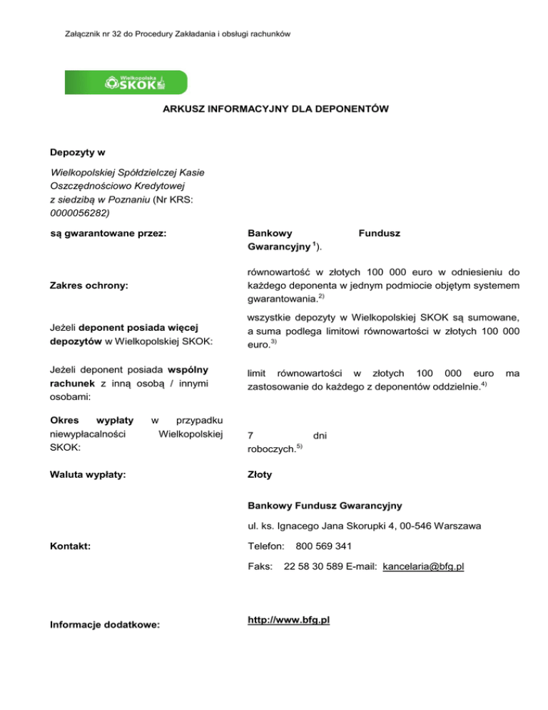 Załącznik nr 32 do Procedury Zakładania i obsługi rachunków ARKUSZ INFORMACYJNY DLA DEPONENTÓW Depozyty w Wielkopolskiej Spółdzielczej Kasie Oszczędnościowo Kredytowej z siedzibą w Poznaniu (Nr KRS: 0000056282) są gwarantowane przez: Bankowy Gwarancyjny 1). Fundusz Zakres ochrony: równowartość w złotych 100 000 euro w odniesieniu do każdego deponenta w jednym podmiocie objętym systemem gwarantowania.2) Jeżeli deponent posiada więcej depozytów w Wielkopolskiej SKOK: wszystkie depozyty w Wielkopolskiej SKOK są sumowane, a suma podlega limitowi równowartości w złotych 100 000 euro.3) Jeżeli deponent posiada wspólny rachunek z inną osobą / innymi osobami: limit równowartości w złotych 100 000 euro zastosowanie do każdego z deponentów oddzielnie.4) Okres wypłaty niewypłacalności SKOK: w przypadku Wielkopolskiej Waluta wypłaty: 7 roboczych.5) dni Złoty Bankowy Fundusz Gwarancyjny ul. ks. Ignacego Jana Skorupki 4, 00-546 Warszawa Kontakt: Telefon: Faks: Informacje dodatkowe: 800 569 341 22 58 30 589 E-mail: [email protected] http://www.bfg.pl ma Załącznik nr 32 do Procedury Zakładania i obsługi rachunków Informacje dodatkowe: 1} System odpowiedzialny za ochronę depozytu Bankowy Fundusz Gwarancyjny jest odpowiedzialny za ochronę depozytów. 2) 3) Ogólny zakres ochrony Jeżeli depozyt nie jest dostępny, gdyż podmiot objęty systemem gwarantowania nie jest w stanie wypełnić swoich zobowiązań finansowych, wypłaty na rzecz deponentów dokonuje Bankowy Fundusz Gwarancyjny. Kwota wypłaty wynosi maksymalnie równowartość w złotych 100 000 euro w odniesieniu do każdego deponenta w jednym podmiocie objętym systemem gwarantowania. Oznacza to, że w celu określenia kwoty objętej gwarancją sumowane są wszystkie depozyty ulokowane w tym samym podmiocie objętym systemem gwarantowania. Przykładowo, jeżeli deponent posiada równowartość w złotych 90 000 euro na rachunku oszczędnościowym i równowartość w złotych 20 000 euro na rachunku bieżącym w tym samym podmiocie objętym systemem gwarantowania, wypłacona zostanie jedynie kwota równowartości w złotych 100 000 euro. Do obliczenia równowartości euro w złotych przyjmuje się kurs średni ogłaszany przez Narodowy Bank Polski w dniu spełnienia warunku gwarancji, w rozumieniu art. 2 pkt 10 ustawy z dnia 10 czerwca 2016 r. o Bankowym Funduszu Gwarancyjnym, systemie gwarantowania depozytów oraz przymusowej restrukturyzacji (Dz. U. poz. 996), wobec danego podmiotu objętego systemem gwarantowania depozytów. 4) Limit ochrony wspólnych rachunków W przypadku wspólnych rachunków limit równowartości w złotych 100 000 euro stosuje się do każdego z deponentów. Jednakże depozyty na rachunku, do którego dwie lub więcej osób jest uprawnionych jako członkowie spółki osobowej, stowarzyszenia lub jednostki organizacyjnej nieposiadającej osobowości prawnej, której odrębna ustawa przyznaje zdolność prawną, są do celów obliczenia górnego limitu równowartości w złotych 100 000 euro sumowane i traktowane jako depozyt jednego deponenta. W przypadku gdy środki lub należności deponenta będącego osobą fizyczną pochodzą z: 1) odpłatnego zbycia: a) nieruchomości zabudowanej budynkiem mieszkalnym jednorodzinnym w rozumieniu przepisów ustawy z dnia 7 lipca 1994 r. - Prawo budowlane (Dz. U. z 2016 r. poz. 290, z późn. zm.), jej części lub udziału w takiej nieruchomości, b) prawa użytkowania wieczystego gruntu zabudowanego budynkiem mieszkalnym jednorodzinnym w rozumieniu przepisów ustawy z dnia 7 lipca 1994 r. - Prawo budowlane lub udziału w takim prawie, c) samodzielnego lokalu mieszkalnego w rozumieniu przepisów ustawy z dnia 24 czerwca 1994 r. o własności lokali (Dz. U. z 2015 r. poz. 1892) stanowiącego odrębną nieruchomość lub udziału w takim lokalu, gruntu lub udziału w gruncie albo prawa użytkowania wieczystego gruntu lub udziału w takim prawie, związanych z tym lokalem, d) spółdzielczego własnościowego prawa do lokalu o przeznaczeniu mieszkalnym lub udziału w takim prawie - jeżeli zbycie to nie nastąpiło w ramach wykonywanej działalności gospodarczej, 2) wykonania na rzecz deponenta umownego lub sądowego podziału majątku po ustaniu małżeńskiej wspólności majątkowej, 3) nabycia przez deponenta spadku, wykonania na jego rzecz zapisu lub otrzymania przez niego zachowku, 4) wypłaty sumy ubezpieczenia z tytułu umowy ubezpieczenia na życie w związku ze śmiercią osoby ubezpieczonej lub dożyciem przez nią oznaczonego wieku, Załącznik nr 32 do Procedury Zakładania i obsługi rachunków 5) wypłaty sumy ubezpieczenia z tytułu umowy ubezpieczenia następstw nieszczęśliwych wypadków w związku z uszkodzeniem ciała, rozstrojem zdrowia lub śmiercią osoby ubezpieczonej wskutek nieszczęśliwego wypadku, 6) wypłaty odprawy pieniężnej na warunkach i w wysokości określonych w przepisach odrębnych, 7) wypłaty odprawy emerytalnej lub rentowej, o której mowa w art. 921 § 1 ustawy z dnia 26 czerwca 1974 r. - Kodeks pracy (Dz. U. z 2014 r. poz. 1502, z późn. zm.) lub odrębnych przepisach, na warunkach i w wysokości określonych w tych przepisach - są one objęte ochroną gwarancyjną, w terminie 3 miesięcy od dnia wpływu środków na rachunek lub powstania należności, do wysokości stanowiącej różnicę pomiędzy dwukrotnością limitu równowartości w złotych 100 000 euro a sumą pozostałych środków i należności deponenta, nie wyższą jednak niż limit równowartości w złotych 100 000 euro. Po tym terminie środki i należności deponenta są objęte obowiązkowym systemem gwarantowania depozytów na zasadach ogólnych, tj. do wysokości równowartości w złotych 100 000 euro. W przypadku gdy środki pochodzą z wypłaty odszkodowania za szkodę wyrządzoną przestępstwem lub zadośćuczynienia za doznaną krzywdę, odszkodowania lub zadośćuczynienia, o którym mowa w art. 552 ustawy z dnia