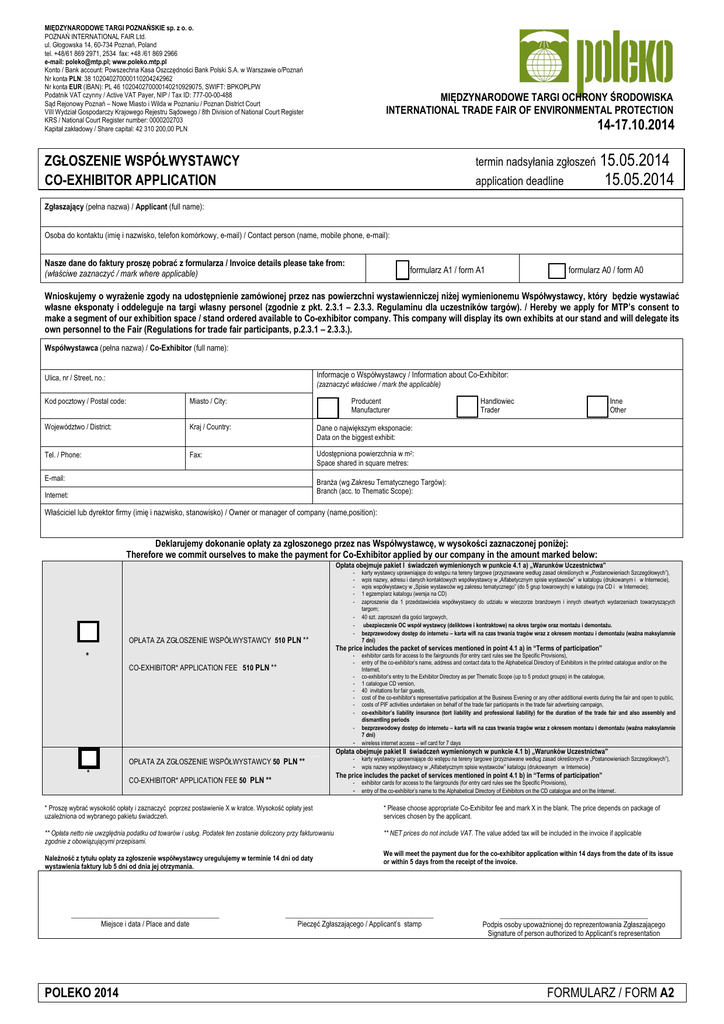 MIĘDZYNARODOWE TARGI POZNAŃSKIE sp. z o. o. POZNAŃ INTERNATIONAL FAIR Ltd. ul. Głogowska 14, 60-734 Poznań, Poland tel. +48/61 869 2971, 2534 fax: +48 /61 869 2966 e-mail: [email protected]; www.poleko.mtp.pl Konto / Bank account: Powszechna Kasa Oszczędności Bank Polski S.A. w Warszawie o/Poznań Nr konta PLN: 38 102040270000110204242962 Nr konta EUR (IBAN): PL 46 102040270000140210929075, SWIFT: BPKOPLPW Podatnik VAT czynny / Active VAT Payer, NIP / Tax ID: 777-00-00-488 Sąd Rejonowy Poznań – Nowe Miasto i Wilda w Poznaniu / Poznan District Court VIII Wydział Gospodarczy Krajowego Rejestru Sądowego / 8th Division of National Court Register KRS / National Court Register number: 0000202703 Kapitał zakładowy / Share capital: 42 310 200,00 PLN MIĘDZYNARODOWE TARGI OCHRONY ŚRODOWISKA INTERNATIONAL TRADE FAIR OF ENVIRONMENTAL PROTECTION 14-17.10.2014 ZGŁOSZENIE WSPÓŁWYSTAWCY CO-EXHIBITOR APPLICATION termin nadsyłania zgłoszeń application deadline 15.05.2014 15.05.2014 Zgłaszający (pełna nazwa) / Applicant (full name): Osoba do kontaktu (imię i nazwisko, telefon komórkowy, e-mail) / Contact person (name, mobile phone, e-mail): Nasze dane do faktury proszę pobrać z formularza / Invoice details please take from: (właściwe zaznaczyć / mark where applicable) formularz A1 / form A1 formularz A0 / form A0 Wnioskujemy o wyraŜenie zgody na udostępnienie zamówionej przez nas powierzchni wystawienniczej niŜej wymienionemu Współwystawcy, który będzie wystawiać własne eksponaty i oddeleguje na targi własny personel (zgodnie z pkt. 2.3.1 – 2.3.3. Regulaminu dla uczestników targów). / Hereby we apply for MTP’s consent to make a segment of our exhibition space / stand ordered available to Co-exhibitor company. This company will display its own exhibits at our stand and will delegate its own personnel to the Fair (Regulations for trade fair participants, p.2.3.1 – 2.3.3.). Współwystawca (pełna nazwa) / Co-Exhibitor (full name): Informacje o Współwystawcy / Information about Co-Exhibitor: Ulica, nr / Street, no.: (zaznaczyć właściwe / mark the applicable) Producent Manufacturer Kod pocztowy / Postal code: Miasto / City: Województwo / District: Kraj / Country: Dane o największym eksponacie: Data on the biggest exhibit: Tel. / Phone: Fax: Udostępniona powierzchnia w m2: Space shared in square metres: E-mail: Handlowiec Trader Inne Other BranŜa (wg Zakresu Tematycznego Targów): Branch (acc. to Thematic Scope): Internet: Właściciel lub dyrektor firmy (imię i nazwisko, stanowisko) / Owner or manager of company (name,position): Deklarujemy dokonanie opłaty za zgłoszonego przez nas Współwystawcę, w wysokości zaznaczonej poniŜej: Therefore we commit ourselves to make the payment for Co-Exhibitor applied by our company in the amount marked below: Opłata obejmuje pakiet I świadczeń wymienionych w punkcie 4.1 a) „Warunków Uczestnictwa” - OPŁATA ZA ZGŁOSZENIE WSPÓŁWYSTAWCY 510 PLN ** - karty wystawcy uprawniające do wstępu na tereny targowe (przyznawane według zasad określonych w „Postanowieniach Szczegółowych”), wpis nazwy, adresu i danych kontaktowych współwystawcy w „Alfabetycznym spisie wystawców” w katalogu (drukowanym i w Internecie), wpis współwystawcy w „Spisie wystawców wg zakresu tematycznego” (do 5 grup towarowych) w katalogu (na CD i w Internecie); 1 egzemplarz katalogu (wersja na CD) zaproszenie dla 1 przedstawiciela współwystawcy do udziału w wieczorze branŜowym i innych otwartych wydarzeniach towarzyszących targom; 40 szt. zaproszeń dla gości targowych, ubezpieczenie OC współ wystawcy (deliktowe i kontraktowe) na okres targów oraz montaŜu i demontaŜu. bezprzewodowy dostęp do internetu – karta wifi na czas trwania tragów wraz z okresem montazu i demontaŜu (waŜna maksylamnie 7 dni) The price includes the packet of services mentioned in point 4.1 a) in “Terms of participation” * - CO-EXHIBITOR* APPLICATION FEE 510 PLN ** - exhibitor cards for access to the fairgrounds (for entry card rules see the Specific Provisions), entry of the co-exhibitor’s name, address and contact data to the Alphabetical Directory of Exhibitors in the printed catalogue and/or on the Internet, co-exhibitor’s entry to the Exhibitor Directory as per Thematic Scope (up to 5 product groups) in the catalogue, 1 catalogue CD version, 40 invitations for fair guests, cost of the co-exhibitor’s representative participation at the Business Evening or any other additional events during the fair and open to public, costs of PIF activities undertaken on behalf of the trade fair participants in the trade fair advertising campaign, co-exhibitor’s liability insurance (tort liability and professional liability) for the duration of the trade fair and also assembly and dismantling periods bezprzewodowy dostęp do internetu – karta wifi na czas trwania tragów wraz z okresem montazu i demontaŜu (waŜna maksylamnie 7 dni) wireless internet access – wif card for 7 days Opłata obejmuje pakiet II świadczeń wymienionych w punkcie 4.1 b) „Warunków Uczestnictwa” OPŁATA ZA ZGŁOSZENIE WSPÓŁWYSTAWCY 50 PLN ** * CO-EXHIBITOR* APPLICATION FEE 50 PLN ** - karty wystawcy uprawniające do wstępu na tereny targowe (przyznawane według zasad określonych w „Postanowieniach Szczegółowych”), - wpis nazwy współwystawcy w „Alfabetycznym spisie wystawców” katalogu (drukowanym w Internecie) The price includes the packet of services mentioned in point 4.1 b) in “Terms of participation” - exhibitor cards for access to the fairgrounds (for entry card rules see the Specific Provisions), - entry of the co-exhibitor’s name to the Alphabetical Directory of Exhibitors on the CD catalogue and on the Internet. * Proszę wybrać wysokość opłaty i zaznaczyć poprzez postawienie X w kratce. Wysokość opłaty jest uzaleŜniona od wybranego pakietu świadczeń. * Please choose appropriate Co-Exhibitor fee and mar