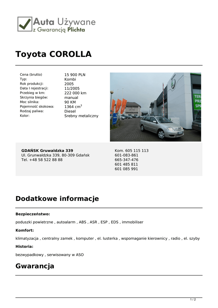Toyota COROLLA Cena (brutto) Typ: Rok produkcji: Data I rejestracji: Przebieg w km: Skrzynia biegów: Moc silnika: Pojemność skokowa: Rodzaj paliwa: Kolor: 15 900 PLN Kombi 2005 11/2005 222 000 km manual 90 KM 1364 cm3 Diesel Srebny metaliczny GDAŃSK Gruwaldzka 339 Ul. Grunwaldzka 339, 80-309 Gdańsk Tel. +48 58 522 88 88 Kom. 605 115 113 601-083-861 665-347-476 601 485 811 601 085 991 Dodatkowe informacje Bezpieczeństwo: poduszki powietrzne , autoalarm , ABS , ASR , ESP , EDS , immobiliser Komfort: klimatyzacja , centralny zamek , komputer , el. lusterka , wspomaganie kierownicy , radio , el. szyby Historia: bezwypadkowy , serwisowany w ASO Gwarancja 1/2 Szanowni Państwo, Pragniemy Państwa poinformować, iż firma Plichta – Autoryzowany Dealer Škoda Auto prowadzi skup oraz sprzedaż samochodów używanych wszystkich marek, oferując także samochody używane z gwarancją objęte programem „Auta używane z Gwarancją Plichta”. W ramach programu „Auta Używane z Gwarancją Plichta ” każdy Klient otrzymuje atrakcyjny pakiet zniżek pozwalający zoptymalizować koszty eksploatacji samochodu: -50% na serwis klimatyzacji -50% na ustawienie zbieżności -50% na kosmetykę auta -50% na ścieżkę diagnostyczną -25% na wymiany oleju -25% na zakup opon + 5zł na sezon za hotelowanie opon -15% na części i akcesoria Oferujemy również kompleksową obsługę w zakresie finansowania i ubezpieczenia: - kredyty już od 4,99% - leasingi i kredyty bez zaświadczeń - uproszczone procedury – decyzja już od 30 min. - atrakcyjne pakiety AC/OC/NW/ASS wiodących firm ubezpieczeniowych Możliwość pozostawienia dotychczas użytkowanego auta w rozliczeniu – BEZPŁATNA WYCENA!!! Zapraszamy wszystkich Klientów na jazdę próbną wybranym autem. Numer oferty: C266 Informacja nie stanowi oferty w rozumieniu art. 66 KC. Podane dane mają charakter wyłącznie informacyjny. 2/2 Powered by TCPDF (www.tcpdf.org)