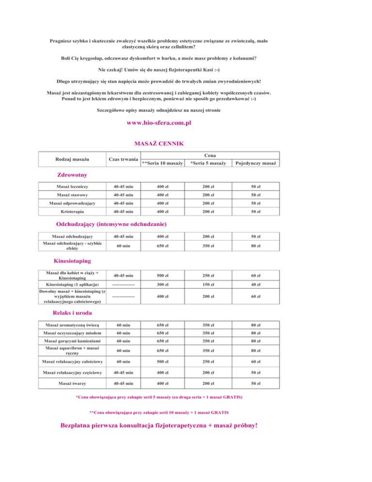 Pragniesz szybko i skutecznie zwalczyć wszelkie problemy estetyczne związane ze zwiotczałą, mało elastyczną skórą oraz cellulitem? Boli Cię kręgosłup, odczuwasz dyskomfort w barku, a mo e masz problemy z kolanami? Nie czekaj! Umów się do naszej fizjoterapeutki Kasi :-) Długo utrzymujący się stan napięcia mo e prowadzić do trwałych zmian zwyrodnieniowych! Masa jest niezastąpionym lekarstwem dla zestresowanej i zabieganej kobiety współczesnych czasów. Ponad to jest lekiem zdrowym i bezpiecznym, poniewa nie sposób go przedawkować :-) Szczegółowe opisy masa y odnajdziesz na naszej stronie www.bio-sfera.com.pl MASA CENNIK Rodzaj masa u Czas trwania Cena **Seria 10 masa y *Seria 5 masa y Pojedynczy masa Zdrowotny Masa leczniczy 40-45 min 400 zł 200 zł 50 zł Masa stawowy 40-45 min 400 zł 200 zł 50 zł Masa odprowadzający 40-45 min 400 zł 200 zł 50 zł Krioterapia 40-45 min 400 zł 200 zł 50 zł Odchudzający (intensywne odchudzanie) Masa odchudzający 40-45 min 400 zł 200 zł 50 zł Masa odchudzający - szybkie efekty 60 min 650 zł 350 zł 80 zł Masa dla kobiet w cią y + Kinesiotaping 40-45 min 500 zł 250 zł 60 zł Kinesiotaping (1 aplikacja) --------------- 300 zł 150 zł 40 zł Dowolny masa + kinesiotaping (z wyjątkiem masa u relaksacyjnego całościowego) --------------- 400 zł 200 zł 60 zł Masa aromatyczną świecą 60 min 650 zł 350 zł 80 zł Masa oczyszczający miodem 60 min 650 zł 350 zł 80 zł Masa gorącymi kamieniami 60 min 650 zł 350 zł 80 zł Masa aquavibron + masa ręczny 60 min 650 zł 350 zł 80 zł Masa relaksacyjny całościowy 60 min 500 zł 250 zł 60 zł Masa relaksacyjny częściowy 40-45 min 400 zł 200 zł 50 zł Masa twarzy 40-45 min 400 zł 200 zł 50 zł Kinesiotaping Relaks i uroda *Cena obowiązująca przy zakupie serii 5 masa y (co druga seria + 1 masa żRATIS) **Cena obowiązująca przy zakupie serii 10 masa y + 1 masa żRATIS Bezpłatna pierwsza konsultacja fizjoterapetyczna + masa próbny!