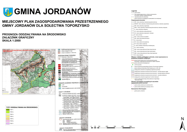 GMINA JORDANÓW Legenda granice planu linie rozgraniczajace tereny o różnym przeznaczeniu lub różnych zasadach zagospodarowania ) MIEJSCOWY PLAN ZAGOSPODAROWANIA PRZESTRZENNEGO GMINY JORDANÓW DLA SOŁECTWA TOPORZYSKO nieprzekraczalne linie zabudowy ) " ) " ) granice obszarów wymagających przekształceń lub rekultywacji Przeznaczenie terenów: MN - tereny zabudowy mieszkaniowej jednorodzinnej MN,RM - tereny zabudowy mieszkaniowej jednorodzinnej i zabudowy zagrodowej RM - tereny zabudowy zagrodowej MN,U - tereny zabudowy mieszkaniowej jednorodzinnej i zabudowy usługowej U - tereny zabudowy usługowej UP - tereny zabudowy usług publicznych PROGNOZA ODDZIAŁYWANIA NA ŚRODOWISKO ZAŁĄCZNIK GRAFICZNY SKALA 1:2000 US - tereny zabudowy usług sportu i rekreacji R - tereny rolnicze R,ZL - tereny rolnicze do zalesień WS - tereny wód powierzchniowych ZL - tereny lasów ZN - tereny zielenie nieurządzonej ZP - tereny zieleni urządzonej K - tereny obiektów infrastruktury kanalizacyjnej ZC - tereny cmentarzy KDZ - tereny dróg publicznych klasy drogi zbiorczej WYRYS ZE STUDIUM UWARUNKOWAŃ I KIERUNKÓW ZAGOSPODAROWANIA PRZESTRZENNEGO GMINY JORDANÓW KDL - tereny dróg publicznych klasy drogi lokalnej KDD - tereny dróg publicznych klasy drogi dojazdowej KK - tereny kolejowe Obszary i obiekty podlegające ochronie, w tym wyznaczone na podstawie przepisów odrębnych: 44444 granice strefy ścisłej ochrony konserwatorskiej ogrodu dworskiego z aleją grabową wpisanego do rejestru zabytków 4545454545 granice stanowisk archeologicznych pomnik przyrody " ) granice Południowomałopolskiego Obszaru Chronionego Krajobrazu ) " granice Głównych Zbiorników Wód Podziemnych nr 444 i 445 / " " " " " " " " " " " zasięg granicy obszarów szczególnego zagrożenia powodzią zasięg granicy obszarów osuwania się mas ziemnych - osuwiska aktywne ciągle zasięg granicy obszarów osuwania się mas ziemnych - osuwiska aktywne okresowo zasięg granicy obszarów osuwania się mas ziemnych - osuwiska nieaktywne zasięg granicy obszarów zagrożonych ruchami masowymi ( ! ( ! granice udokumentowanego złoża piaskowca magurskiego Toporzysko Działy Obszary wymagające szczególnych warunków zagospodarowania terenów: " ) " ) " ) " ) granice strefy sanitarnej od cmentarza 50 m granice strefy sanitarnej od cmentarza 150 m Oznaczenia informacyjne: granice gminy Jordanów GRANICA PLANU TYPY ODDZIAŁYWANIA NA ŚRODOWISKO: TYP 1 TYP 2 TYP 3 TYP 4 TYP 5 TYP 6 TYP 7 0 50 100 200 300 400 500 Meters ±