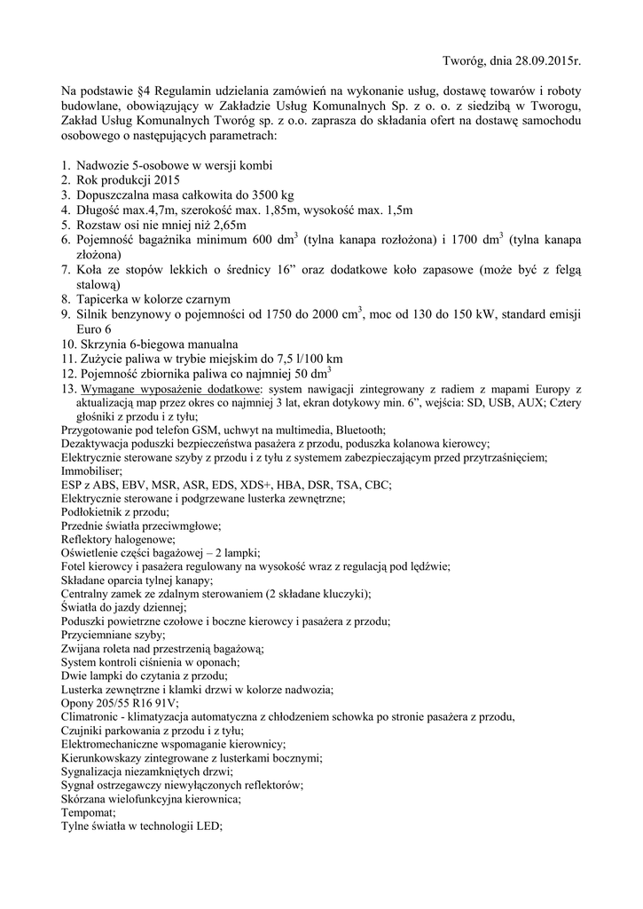 Tworóg, dnia 28.09.2015r. Na podstawie §4 Regulamin udzielania zamówień na wykonanie usług, dostawę towarów i roboty budowlane, obowiązujący w Zakładzie Usług Komunalnych Sp. z o. o. z siedzibą w Tworogu, Zakład Usług Komunalnych Tworóg sp. z o.o. zaprasza do składania ofert na dostawę samochodu osobowego o następujących parametrach: 1. 2. 3. 4. 5. 6. Nadwozie 5-osobowe w wersji kombi Rok produkcji 2015 Dopuszczalna masa całkowita do 3500 kg Długość max.4,7m, szerokość max. 1,85m, wysokość max. 1,5m Rozstaw osi nie mniej niż 2,65m Pojemność bagażnika minimum 600 dm3 (tylna kanapa rozłożona) i 1700 dm3 (tylna kanapa złożona) 7. Koła ze stopów lekkich o średnicy 16” oraz dodatkowe koło zapasowe (może być z felgą stalową) 8. Tapicerka w kolorze czarnym 9. Silnik benzynowy o pojemności od 1750 do 2000 cm3, moc od 130 do 150 kW, standard emisji Euro 6 10. Skrzynia 6-biegowa manualna 11. Zużycie paliwa w trybie miejskim do 7,5 l/100 km 12. Pojemność zbiornika paliwa co najmniej 50 dm3 13. Wymagane wyposażenie dodatkowe: system nawigacji zintegrowany z radiem z mapami Europy z aktualizacją map przez okres co najmniej 3 lat, ekran dotykowy min. 6”, wejścia: SD, USB, AUX; Cztery głośniki z przodu i z tyłu; Przygotowanie pod telefon GSM, uchwyt na multimedia, Bluetooth; Dezaktywacja poduszki bezpieczeństwa pasażera z przodu, poduszka kolanowa kierowcy; Elektrycznie sterowane szyby z przodu i z tyłu z systemem zabezpieczającym przed przytrzaśnięciem; Immobiliser; ESP z ABS, EBV, MSR, ASR, EDS, XDS+, HBA, DSR, TSA, CBC; Elektrycznie sterowane i podgrzewane lusterka zewnętrzne; Podłokietnik z przodu; Przednie światła przeciwmgłowe; Reflektory halogenowe; Oświetlenie części bagażowej – 2 lampki; Fotel kierowcy i pasażera regulowany na wysokość wraz z regulacją pod lędźwie; Składane oparcia tylnej kanapy; Centralny zamek ze zdalnym sterowaniem (2 składane kluczyki); Światła do jazdy dziennej; Poduszki powietrzne czołowe i boczne kierowcy i pasażera z przodu; Przyciemniane szyby; Zwijana roleta nad przestrzenią bagażową; System kontroli ciśnienia w oponach; Dwie lampki do czytania z przodu; Lusterka zewnętrzne i klamki drzwi w kolorze nadwozia; Opony 205/55 R16 91V; Climatronic - klimatyzacja automatyczna z chłodzeniem schowka po stronie pasażera z przodu, Czujniki parkowania z przodu i z tyłu; Elektromechaniczne wspomaganie kierownicy; Kierunkowskazy zintegrowane z lusterkami bocznymi; Sygnalizacja niezamkniętych drzwi; Sygnał ostrzegawczy niewyłączonych reflektorów; Skórzana wielofunkcyjna kierownica; Tempomat; Tylne światła w technologii LED; 14. Pojazd musi być gotowy do odbioru z terenu RP w terminie 3 dni od poinformowania o wyborze oferty. 15. Gwarancja co najmniej 2 lata na cały samochód, 3 lata na powłokę lakierniczą, 12 lat na perforację nadwozia. 16. Ocenie będzie podlegała cena bez podatku VAT. 17. Zamawiający może scedować prawa wynikające z niniejszego zamówienia na osobę trzecią, a w szczególności na bank lub inną instytucję finansową. 18. Zamawiający zastrzega sobie prawo do przeprowadzenia oględzin przedmiotu oferty. 19. Płatność zostanie dokonana po otrzymaniu faktury pro-forma lub faktury VAT. 20. Oferty należy składać do dnia 05.10.2015r. do godz. 07:30 w siedzibie ZUK Tworóg sp. z o.o., ul. Zamkowa 16, 42 - 690 Tworóg, lub na adres elektroniczny [email protected].