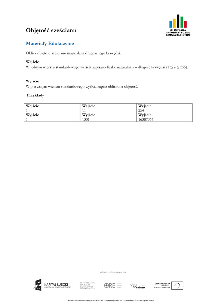 Objętość sześcianu Materiały Edukacyjne Oblicz objętość sześcianu mając daną długość jego krawędzi. Wejście W jednym wierszu standardowego wejścia zapisano liczbę naturalną a – długość krawędzi (1 ≤ a ≤ 255). Wyjście W pierwszym wierszu standardowego wyjścia zapisz obliczoną objętość. Przykłady Wejście 1 Wyjście 1 Wejście 11 Wyjście 1331 Wejście 254 Wyjście 16387064