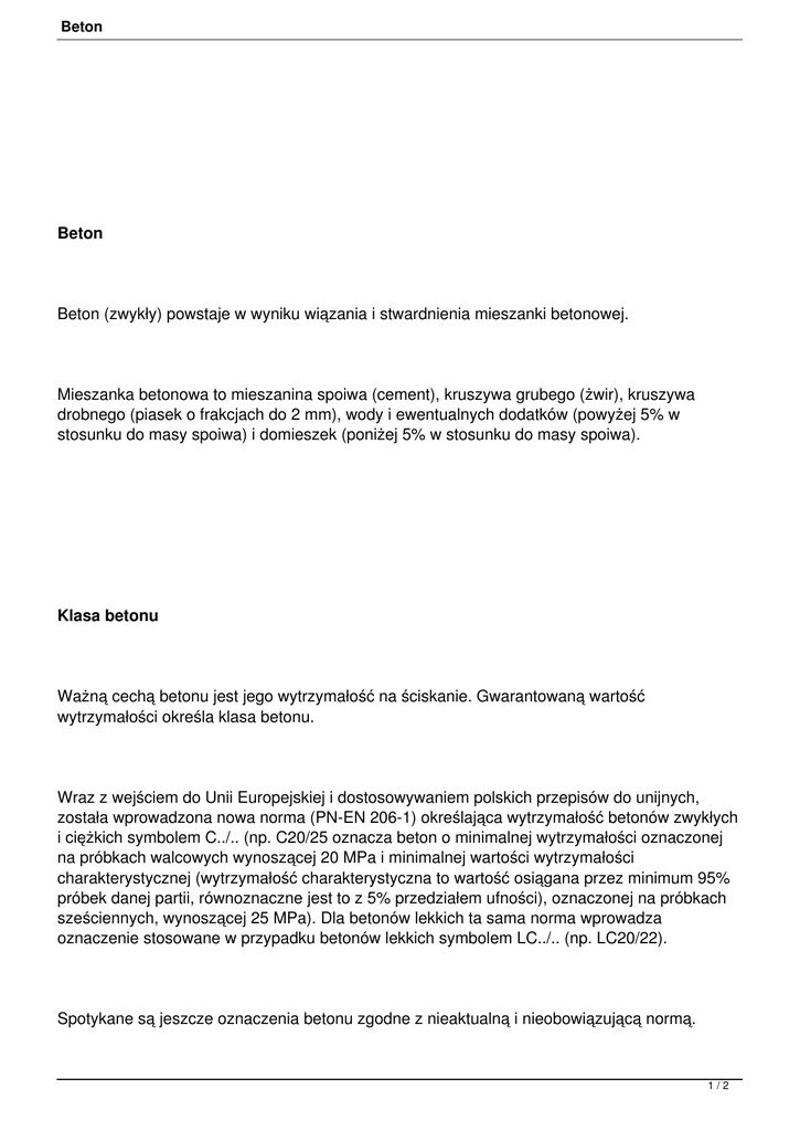 Beton Beton Beton (zwykły) powstaje w wyniku wiązania i stwardnienia mieszanki betonowej. Mieszanka betonowa to mieszanina spoiwa (cement), kruszywa grubego (żwir), kruszywa drobnego (piasek o frakcjach do 2 mm), wody i ewentualnych dodatków (powyżej 5% w stosunku do masy spoiwa) i domieszek (poniżej 5% w stosunku do masy spoiwa). Klasa betonu Ważną cechą betonu jest jego wytrzymałość na ściskanie. Gwarantowaną wartość wytrzymałości określa klasa betonu. Wraz z wejściem do Unii Europejskiej i dostosowywaniem polskich przepisów do unijnych, została wprowadzona nowa norma (PN-EN 206-1) określająca wytrzymałość betonów zwykłych i ciężkich symbolem C../.. (np. C20/25 oznacza beton o minimalnej wytrzymałości oznaczonej na próbkach walcowych wynoszącej 20 MPa i minimalnej wartości wytrzymałości charakterystycznej (wytrzymałość charakterystyczna to wartość osiągana przez minimum 95% próbek danej partii, równoznaczne jest to z 5% przedziałem ufności), oznaczonej na próbkach sześciennych, wynoszącej 25 MPa). Dla betonów lekkich ta sama norma wprowadza oznaczenie stosowane w przypadku betonów lekkich symbolem LC../.. (np. LC20/22). Spotykane są jeszcze oznaczenia betonu zgodne z nieaktualną i nieobowiązującą normą. 1/2 Beton Według już nieaktualnej normy, stosowano oznaczenia - np. beton B 20 - to beton o gwarantowanej wytrzymałości 20 MPa. Norma PN-B-03264:2002 została w 2004r. uzupełniona poprawką, zgodnie z którą np. beton oznaczony jako B-20 jest odpowiednikiem betonu klasy C16/20. 2/2