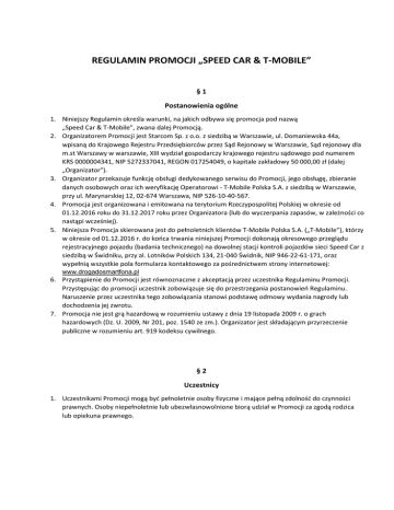 REGULAMIN PROMOCJI „SPEED CAR & T-MOBILE” §1 Postanowienia ogólne 1. Niniejszy Regulamin określa warunki, na jakich odbywa się promocja pod nazwą „Speed Car & T-Mobile", zwana dalej Promocją. 2. Organizatorem Promocji jest Starcom Sp. z o.o. z siedzibą w Warszawie, ul. Domaniewska 44a, wpisaną do Krajowego Rejestru Przedsiębiorców przez Sąd Rejonowy w Warszawie, Sąd rejonowy dla m.st Warszawy w warszawie, XIII wydział gospodarczy krajowego rejestru sądowego pod numerem KRS 0000004341, NIP 5272337041, REGON 017254049, o kapitale zakładowy 50 000,00 zł (dalej „Organizator”). 3. Organizator przekazuje funkcję obsługi dedykowanego serwisu do Promocji, jego obsługę, zbieranie danych osobowych oraz ich weryfikację Operatorowi - T-Mobile Polska S.A. z siedzibą w Warszawie, przy ul. Marynarskiej 12, 02-674 Warszawa, NIP 526-10-40-567. 4. Promocja jest organizowana i emitowana na terytorium Rzeczypospolitej Polskiej w okresie od 01.12.2016 roku do 31.12.2017 roku przez Organizatora (lub do wyczerpania zapasów, w zależności co nastąpi wcześniej). 5. Niniejsza Promocja skierowana jest do pełnoletnich klientów T-Mobile Polska S.A. („T-Mobile”), którzy w okresie od 01.12.2016 r. do końca trwania niniejszej Promocji dokonają okresowego przeglądu rejestracyjnego pojazdu (badania technicznego) na dowolnej stacji kontroli pojazdów sieci Speed Car z siedzibą w Świdniku, przy al. Lotników Polskich 134, 21-040 Świdnik, NIP 946-22-61-171, oraz wypełnią wszystkie pola formularza kontaktowego za pośrednictwem strony internetowej: www.drogadosmartfona.pl 6. Przystąpienie do Promocji jest równoznaczne z akceptacją przez uczestnika Regulaminu Promocji. Przystępując do promocji uczestnik zobowiązuje się do przestrzegania postanowień Regulaminu. Naruszenie przez uczestnika tego zobowiązania stanowi podstawę odmowy wydania nagrody lub dochodzenia jej zwrotu. 7. Promocja nie jest grą hazardową w rozumieniu ustawy z dnia 19 listopada 2009 r. o grach hazardowych (Dz. U. 2009, Nr 201, poz. 1540 ze zm.). Organizator jest składającym przyrzeczenie publiczne w rozumieniu art. 919 kodeksu cywilnego. §2 Uczestnicy 1. Uczestnikami Promocji mogą być pełnoletnie osoby fizyczne i mające pełną zdolność do czynności prawnych. Osoby niepełnoletnie lub ubezwłasnowolnione biorą udział w Promocji za zgodą rodzica lub opiekuna prawnego. §3 Zasady i przebieg 1. Promocji trwa w dniach od dnia 01.12.2016 roku do dnia 31.12.2017 roku do godziny 24:00 we wszystkie dni tygodnia. 2. Warunkami udziału w Promocji jest dokonanie okresowego przeglądu rejestracyjnego pojazdu (badania technicznego) na dowolnej stacji kontroli pojazdów sieci Speed Car (lista stacji znajduje się na www.speedcar.pl/stacje). Po przeprowadzonym przeglądzie uczestnik otrzyma kartę-zdrapkę z unikalnym kodem, który powinien wprowadzić wraz z innymi danymi do formularza kontaktowego za pośrednictwem strony internetowej: www.drogadosmartfona.pl 3. Warunkiem uzyskania Nagrody w postaci bonu podarunkowego Sodexo w ramach niniejszej Promocji jest łącznie, dokonanie okresowego przeglądu rejestracyjnego pojazdu (badania technicznego) na stacji kontroli pojazdów sieci Speed Car, wypełnienie formularza kontaktowego za pośrednictwem strony internetowej: www.drogadosmartfona.pl, poprawne przepisanie kodu promocyjnego do formularza, zakup abonamentu w T-Mobile (promocja dotyczy zarówno nowej umowy, przedłużenia umowy oraz przeniesienia numeru - przeznaczonych dla osób prywatnych), brak odstąpienia od Umowy z T-Mobile. W przypadku podania nieprawdziwych danych Organizator zastrzega sobie prawo do odmowy wydania nagrody lub też, jeśli została ona już wydana prawo do jej zwrotu w terminie nie przekraczającym 7 dni od daty wezwania takiego uczestnika konkursu przez Organizatora. 4. Każdy uczestnik Promocji w trakcie jej trwania może wygrać daną nagrodę tylko raz. 5. Organizatorowi przysługuje prawo weryfikacji danych przedstawionych przez uczestnika. §4 Tryb przyznawania Nagród 1. Nad prawidłowością przeprowadzenia Promocji czuwa Komisja powołana przez Organizatora i składająca się z jego przedstawicieli oraz przedstawicieli T-Mobile. 2. Komisja Promocji będzie sprawować pieczę nad procesem wyłaniania laureatów poszczególnych nagród zgodnie z zasadami określonymi w niniejszym Regulaminie. 3. Do kompetencji Komisji należeć będzie również rozpatrywanie wpływających od Uczestników Promocji reklamacji. 4. Komisja działa kolegialnie. Z posiedzeń Komisji sporządzany jest protokół (może być w wersji elektronicznej). 5. Wyniki Promocji, imiona i nazwiska laureatów nie są publikowane. Uczestnik Promocji zostaje poinformowany o przyznaniu nagrody za pośrednictwem poczty elektronicznej na adres e-mail wskazany w danych osobowych zawartych w formularzu. §5 Nagrody 1. Nagrodą w ramach niniejszej Promocji jest bon podarunkowy Sodexo o wartości 50zł, 100zł, 150zł, 200 zł, (zwany dalej „Nagrodą”) w zależności od wartości zakupionej oferty abonamentu dla osób prywatnych w sieci T-Mobile. 2. Pulę nagród strony określiły na 1000 sztuk. W przypadku, gdy data trwania Promocji nie będzie określona, Operator Promocji jest zobowiązany do umieszczania w serwisie www.t-mobile.pl niniejszej Promocji bieżącej informacji n/t wykorzystania puli nagród. 3. Nagrody nie będą podlegały wymianie na gotówkę ani na inne nagrody. Niedopuszczalne jest również odstąpienie prawa do nagrody na rzecz osób trzecich. 4. Wysyłka nagrody, o której mowa nastąpi na podany w formularzu adres zweryfikowanego uczestnika Promocji w terminie do 14 dni roboczych od momentu potwierdzenia przez operatora zawarcia umowy świadczenia usług telekomunikacyjnych przez danego uczestnika. §6 Naruszenie Regulaminu 1. W przypadku naruszenia Regulaminu Organizator może wykluczyć uczestnika z Promocji. 2. W przypadkach wykrycia działań niezgodnych z Regulaminem, 