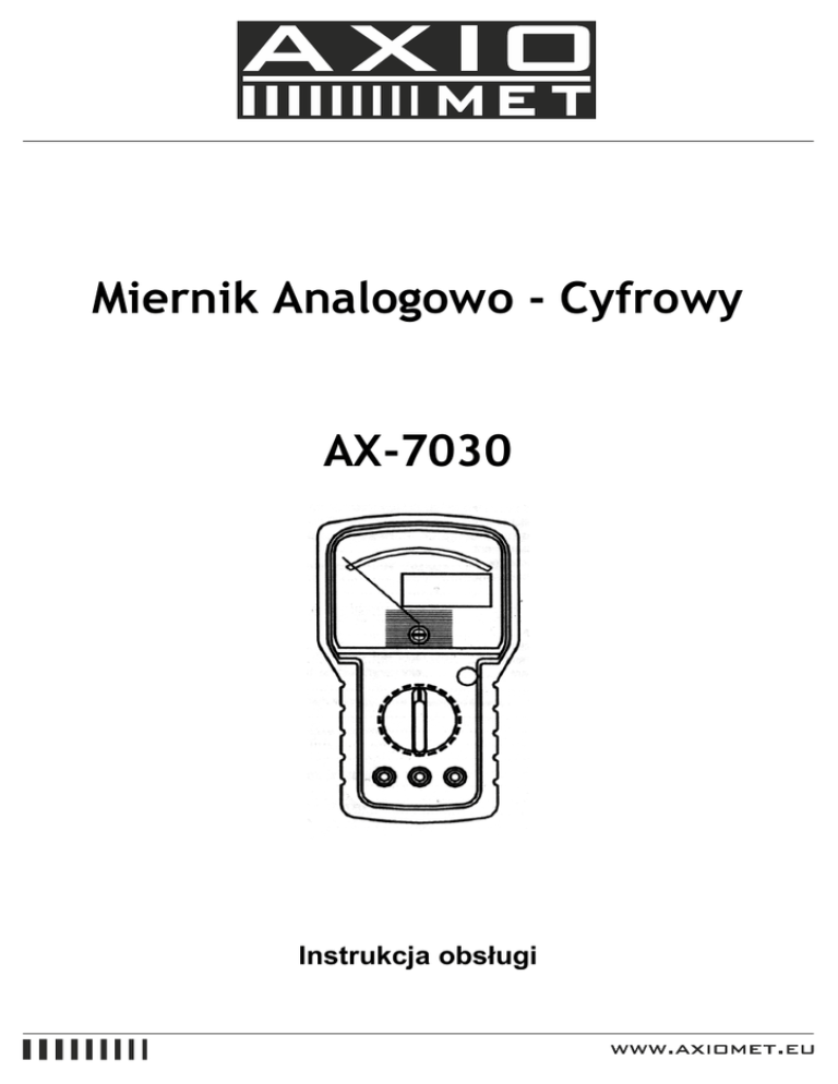 Miernik Analogowo - Cyfrowy AX-7030 Instrukcja obsługi Spis treści 1. Informacje dotyczące bezpieczeństwa ...................................................................... 4 1.1. Wstęp .......................................................................................................... 5 1.2. Podczas wykonywania pomiarów .......................................................................... 5 1.3. Po zakończeniu pomiarów .................................................................................. 5 2. Opis miernika .................................................................................................... 6 3. Przygotowanie do pracy ....................................................................................... 6 3.1. Czynności początkowe ....................................................................................... 6 3.2. Zasilanie ....................................................................................................... 6 3.3. Kalibracja ...................................................................................................... 6 3.4. Przechowywanie .............................................................................................. 7 4. Obsługa miernika ............................................................................................... 7 4.1. Opis miernika ................................................................................................. 7 4.2. Wykonywanie pomiarów ..................................................................................... 7 4.2.1. Pomiary napięcia DC ....................................................................................... 7 4.2.2. Pomiary napięcia AC ....................................................................................... 8 4.2.3. Pomiary prądu DC .......................................................................................... 8 4.2.4. Pomiary prądu AC .......................................................................................... 9 4.2.5. Pomiary rezystancji ....................................................................................... 9 4.2.6. Test ciągłości .............................................................................................. 10 4.2.7. Test diody ................................................................................................. 10 4.2.8. Sprawdzanie baterii ...................................................................................... 10 4.3. Konserwacja ................................................................................................. 11 4.3.1. Ogólne informacje ........................................................................................ 11 4.3.2. Wymiana baterii .......................................................................................... 11 4.3.3. Wymiana bezpieczników ................................................................................ 12 4.3.4. Czyszczenie ................................................................................................ 12 5. Specyfikacje techniczne ..................................................................................... 12 2 5.1. Charakterystyki .............................................................................................. 12 5.1.1. Napięcie DC ............................................................................................... 12 5.1.2. Napięcie AC ................................................................................................ 12 5.1.3. Prąd DC .................................................................................................... 13 5.1.4. Prąd AC ..................................................................................................... 13 5.1.5. Rezystancja ................................................................................................ 13 5.1.6. Test diody ................................................................................................. 13 5.1.7. Test ciągłości .............................................................................................. 14 5.1.8. Sprawdzanie baterii ...................................................................................... 14 5.1.9. Standardy bezpieczeństwa .............................................................................. 14 5.1.10. Informacje ogólne ....................................................................................... 14 5.2. Warunki otoczenia .......................................................................................... 14 5.2.1. Temperatura i wilgotność ............................................................................... 14 5.2.2. Pola elektromagnetyczne ............................................................................... 15 5.3. Akcesoria ..................................................................................................... 15 6. Serwis ........................................................................................................... 15 6.1. Warunki gwarancji .......................................................................................... 15 6.2. Naprawy ...................................................................................................... 16 3 1. INFORMACJE DOTYCZĄCE BEZPIECZEŃSTWA Miernik ten spełnia normę EN 61010-1 dotyczącą elektronicznych urządzeń pomiarowych. Dla własnego bezpieczeństwa i bezpieczeństwa miernika należy przestrzegać zaleceń znajdujących się w tej instrukcji, zwracając szczególną uwagę na wskazówki, przy których znajduje się symbol . Podczas wykonywania pomiarów, bezwzględnie należy przestrzegać poniższych wskazówek: • Nie należy wykonywać pomiarów napięcia i prądu w wilgotnym otoczeniu. • Nie należy używać miernika w otoczeniu, w którym znajduje się wybuchowy gaz, łatwopalny gaz, 