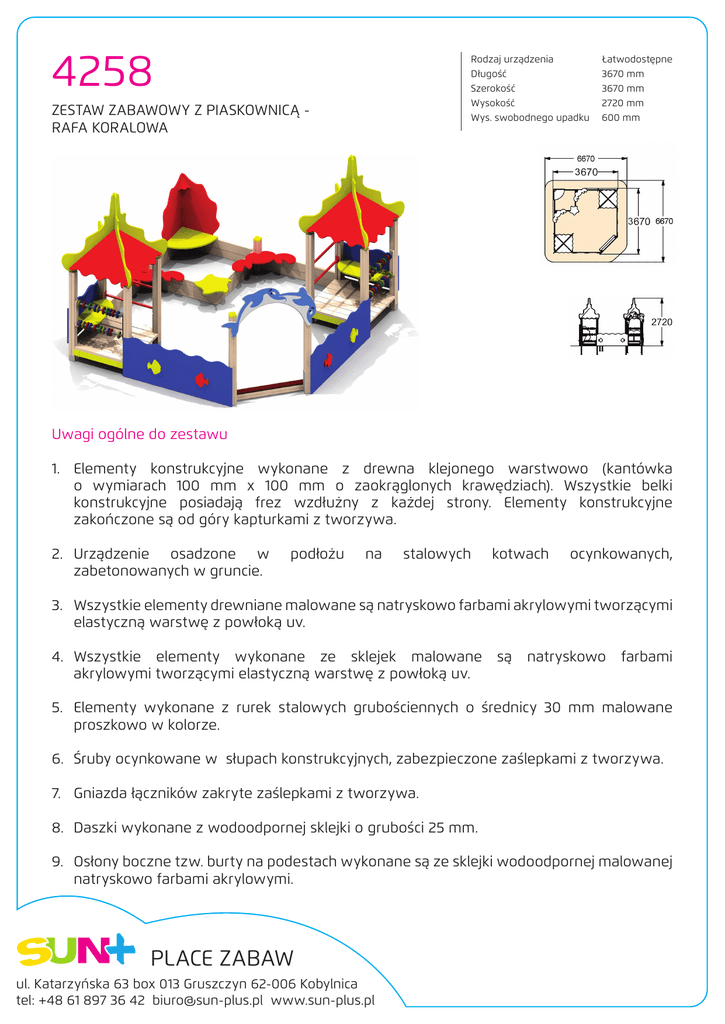4258 Rodzaj urządzenia Długość Szerokość Wysokość Wys. swobodnego upadku ZESTAW ZABAWOWY Z PIASKOWNICĄ RAFA KORALOWA Łatwodostępne 3670 mm 3670 mm 2720 mm 600 mm Uwagi ogólne do zestawu 1. Elementy konstrukcyjne wykonane z drewna klejonego warstwowo (kantówka o wymiarach 100 mm x 100 mm o zaokrąglonych krawędziach). Wszystkie belki konstrukcyjne posiadają frez wzdłużny z każdej strony. Elementy konstrukcyjne zakończone są od góry kapturkami z tworzywa. 2. Urządzenie osadzone w zabetonowanych w gruncie. podłożu na stalowych kotwach ocynkowanych, 3. Wszystkie elementy drewniane malowane są natryskowo farbami akrylowymi tworzącymi elastyczną warstwę z powłoką uv. 4. Wszystkie elementy wykonane ze sklejek malowane akrylowymi tworzącymi elastyczną warstwę z powłoką uv. są natryskowo farbami 5. Elementy wykonane z rurek stalowych grubościennych o średnicy 30 mm malowane proszkowo w kolorze. 6. Śruby ocynkowane w słupach konstrukcyjnych, zabezpieczone zaślepkami z tworzywa. 7. Gniazda łączników zakryte zaślepkami z tworzywa. 8. Daszki wykonane z wodoodpornej sklejki o grubości 25 mm. 9. Osłony boczne tzw. burty na podestach wykonane są ze sklejki wodoodpornej malowanej natryskowo farbami akrylowymi. PLACE ZABAW ul. Katarzyńska 63 box 013 Gruszczyn 62-006 Kobylnica tel: +48 61 897 36 42 [email protected] www.sun-plus.pl 4258 ZESTAW ZABAWOWY Z PIASKOWNICĄ RAFA KORALOWA Opis techniczny wchodzących w skład elementów 1. 2 wieże z dachem czterospadowym i podestem. 2. Podest wykonany jest z drewna malowanego farbami akrylowymi. 3. W wieżach znajdują się siedziska ze sklejki wodoodpornej grubości 25 mm oraz podwójne liczydła. 4. Balkoniki ozdobny wykonany ze sklejki wodoodpornej grubości 25 mm. 5. Wejście do piaskownicy obniżone jest z myślą o dzieciach niepełnosprawnych. Wejście zwieńczone jest elementem dekoracyjnym ze sklejki wodoodpornej grubości 25 mm przedstawiającym dwa delfiny. 6. Piaskownica wyposażona jest w siedziska ze sklejki wodoodpornej grubości 25 mm. 7. Burty boczne ozdobione są elementami dekoracyjnymi ze sklejki wodoodpornej grubości 25 mm: rybki. PLACE ZABAW ul. Katarzyńska 63 box 013 Gruszczyn 62-006 Kobylnica tel: +48 61 897 36 42 [email protected] www.sun-plus.pl