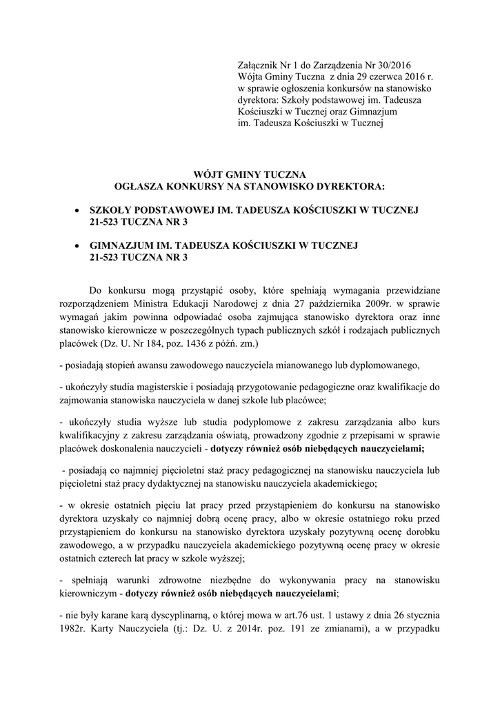 Załącznik Nr 1 do Zarządzenia Nr 30/2016 Wójta Gminy Tuczna z dnia 29 czerwca 2016 r. w sprawie ogłoszenia konkursów na stanowisko dyrektora: Szkoły podstawowej im. Tadeusza Kościuszki w Tucznej oraz Gimnazjum im. Tadeusza Kościuszki w Tucznej WÓJT GMINY TUCZNA OGŁASZA KONKURSY NA STANOWISKO DYREKTORA: SZKOŁY PODSTAWOWEJ IM. TADEUSZA KOŚCIUSZKI W TUCZNEJ 21-523 TUCZNA NR 3 GIMNAZJUM IM. TADEUSZA KOŚCIUSZKI W TUCZNEJ 21-523 TUCZNA NR 3 Do konkursu mogą przystąpić osoby, które spełniają wymagania przewidziane rozporządzeniem Ministra Edukacji Narodowej z dnia 27 października 2009r. w sprawie wymagań jakim powinna odpowiadać osoba zajmująca stanowisko dyrektora oraz inne stanowisko kierownicze w poszczególnych typach publicznych szkół i rodzajach publicznych placówek (Dz. U. Nr 184, poz. 1436 z późń. zm.) - posiadają stopień awansu zawodowego nauczyciela mianowanego lub dyplomowanego, - ukończyły studia magisterskie i posiadają przygotowanie pedagogiczne oraz kwalifikacje do zajmowania stanowiska nauczyciela w danej szkole lub placówce; - ukończyły studia wyższe lub studia podyplomowe z zakresu zarządzania albo kurs kwalifikacyjny z zakresu zarządzania oświatą, prowadzony zgodnie z przepisami w sprawie placówek doskonalenia nauczycieli - dotyczy również osób niebędących nauczycielami; - posiadają co najmniej pięcioletni staż pracy pedagogicznej na stanowisku nauczyciela lub pięcioletni staż pracy dydaktycznej na stanowisku nauczyciela akademickiego; - w okresie ostatnich pięciu lat pracy przed przystąpieniem do konkursu na stanowisko dyrektora uzyskały co najmniej dobrą ocenę pracy, albo w okresie ostatniego roku przed przystąpieniem do konkursu na stanowisko dyrektora uzyskały pozytywną ocenę dorobku zawodowego, a w przypadku nauczyciela akademickiego pozytywną ocenę pracy w okresie ostatnich czterech lat pracy w szkole wyższej; - spełniają warunki zdrowotne niezbędne do wykonywania pracy na stanowisku kierowniczym - dotyczy również osób niebędących nauczycielami; - nie były karane karą dyscyplinarną, o której mowa w art.76 ust. 1 ustawy z dnia 26 stycznia 1982r. Karty Nauczyciela (tj.: Dz. U. z 2014r. poz. 191 ze zmianami), a w przypadku nauczyciela akademickiego - karą dyscyplinarną, o której mowa w art. 140 ust. 1 ustawy z dnia 27 lipca 2005r.- Prawo o szkolnictwie wyższym (tj.: Dz. U. z 2012r. poz. 572 ze zmianami) oraz nie toczy się przeciwko nim postępowanie dyscyplinarne; - nie były skazane prawomocnym wyrokiem za umyślne przestępstwo lub umyślne przestępstwo skarbowe - dotyczy również osób niebędących nauczycielami; - nie toczy się przeciwko nim postępowanie o przestępstwo ścigane z oskarżenia publicznego; - nie były karane zakazem pełnienia funkcji związanych z dysponowaniem środkami publicznymi, o którym mowa w art. 31 ust. 1 pkt 4 ustawy z dnia 17 grudnia 2004r. o odpowiedzialności za naruszenie dyscypliny finansów publicznych (tj.: Dz. U. z 2013r. poz. 168) - dotyczy również osób niebędących nauczycielami; - złożyły oświadczenie lustracyjne bądź informację o uprzednim złożeniu oświadczenia lustracyjnego do Kuratorium Oświaty w Lublinie – zgodnie z ustawą z dnia 18 października 2006 r. o ujawnianiu informacji o dokumentach organów bezpieczeństwa państwa z lat 1944 – 1990 oraz treści tych dokumentów (tj.: Dz. U. z 2013r. poz. 1388 ze zmianami) (dotyczy osób urodzonych przed 1 sierpnia 1972r.) - dotyczy również osób niebędących nauczycielami; - posiadają obywatelstwo polskie, z tym że wymóg ten nie dotyczy obywateli państw członkowskich Unii Europejskiej, państw członkowskich Europejskiego Porozumienia o Wolnym Handlu (EFTA) - stron umowy o Europejskim Obszarze Gospodarczym oraz Konfederacji Szwajcarskiej - w przypadku osób niebędących nauczycielami; - ukończyły studia magisterskie - w przypadku osób niebędących nauczycielami; - posiadają co najmniej pięcioletni staż pracy, w tym co najmniej dwuletni staż pracy na stanowisku kierowniczym - w przypadku osób niebędących nauczycielami; - mają pełną zdolność do czynności prawnych i korzystają z praw publicznych - w przypadku osób niebędących nauczycielami; - ukończyły studia magisterskie – w przypadku osób niebędących nauczycielami; - posiadają co najmniej pięcioletni staż pracy, w tym co najmniej dwuletni staż pracy na stanowisku kierowniczym - w przypadku osób niebędących nauczycielami; - mają pełną zdolność do czynności prawnych i korzystają z praw publicznych - w przypadku osób niebędących nauczycielami; - nie toczy się przeciwko nim postępowanie o przestępstwo ścigane z oskarżenia publicznego lub postępowanie dyscyplinarne - w przypadku osób niebędących nauczycielami; Oferty osób przystępujących do konkursu powinny zawierać: 1) uzasadnienie przystąpienia do konkursu wraz z koncepcją funkcjonowania i rozwoju szkoły, 2) poświadczoną przez kandydata za zgodność z oryginałem kopię dowodu osobistego lub innego dokumentu potwierdzającego tożsamość oraz poświadczającego obywatelstwo kandydata, 3) życiorys z opisem przebiegu pracy zawodowej, zawierający w szczególności informację o: – stażu pracy pedagogicznej - w przypadku nauczyciela albo – stażu pracy dydaktycznej - w przypadku nauczyciela akademickiego, albo – stażu pracy, w tym stażu pracy na stanowisku kierowniczym - w przypadku osoby niebędącej nauczycielem, 4) oryginały lub poświadczone przez kandydata za zgodność z oryginałem kopie dokumentów potwierdzających posiadanie wymaganego stażu pracy, o którym mowa w pkt.3, 5) oryginały lub poświadczone przez kandydata za zgodność z oryginałem kopie dokumentów potwierdzających posiadanie wymaganego wykształcenia, w tym dyplomu ukończenia studiów wyższych lub świadectwa ukończenia studiów podyplomowych z zakresu zarządzania albo świadectwa ukończenia kursu kwalifikacyjnego z