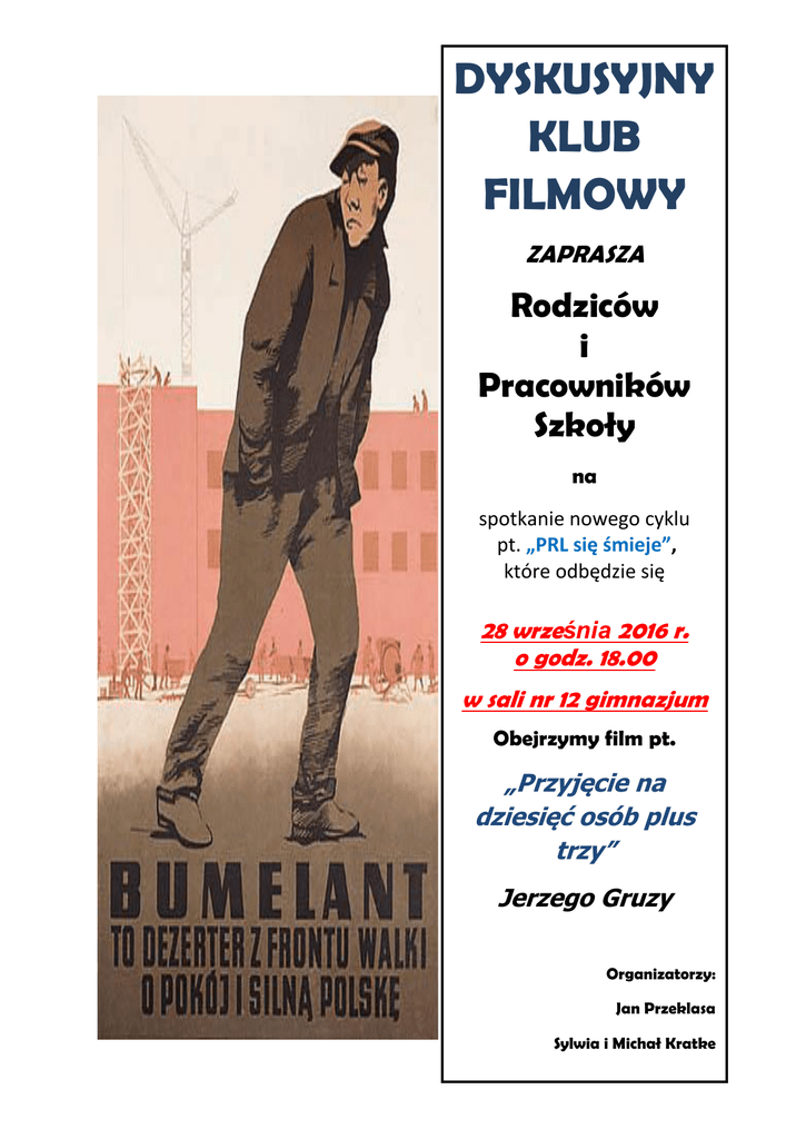 DYSKUSYJNY KLUB FILMOWY ZAPRASZA Rodziców i Pracowników Szkoły na spotkanie nowego cyklu pt. „PRL się śmieje”, które odbędzie się 28 września 2016 r. o godz. 18.00 w sali nr 12 gimnazjum Obejrzymy film pt. „Przyjęcie na dziesięć osób plus trzy” Jerzego Gruzy Organizatorzy: Jan Przeklasa Sylwia i Michał Kratke