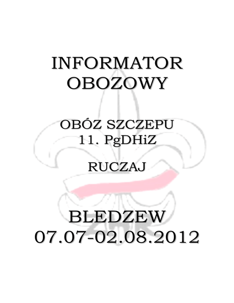 INFORMATOR OBOZOW Y OBÓZ SZCZEPU 1 1 . P g D H iZ RUCZAJ BLED ZEW 0 7 .0 7 -0 2 .0 8 .2 0 1 2 BLEDZEW 2013 Obóz szczepu 11. PgDHiZ „Ruczaj” Terminy: Czas trwania: 7 lipca – 2 sierpnia Planowany wyjazd: 7.07.2013 w godzinach wieczornych Planowany powrót: 2.08.2013 w godzinach porannych Miejsce obozu: Bledzew, przy Zalewie Bledzewskim gm. Bledzew, pow. międzyrzecki woj. lubuskie Adres korespondencyjny: Imię i nazwisko dziecka Obóz harcerski Szczepu Ruczaj nad Zalewem Bledzewskim 66-350 Bledzew Nie należy przesyłać paczek kurierem, ponieważ nie dojeżdżają oni na miejsce obozu, a według regulaminu firm kurierskich nie mogą zostawić przesyłek na poczcie. miejsce obozu Koszt obozu: Pełny koszt obozu wynosi 1100 zł. W przypadku wpłacenia całości we wcześniejszym terminie, czyli 16.05.2013 (pod warunkiem prawidłowego tytułu przelewu) koszt obozu wynosi 1060 zł. Kwota Data Jak 18.04.2013 Płatne gotówką 18.04.2013 w godzinach 19:00-19:30 w harcówce w SP nr 40 (ul. Pszczelna 13) 300 zł. + karta I rata obozowa (z czego 150zł w przypadku rezygnacji jest bezzwrotne) II rata 400 zł. 16.05.2013 III rata 400 zł. 11.06.2013 Płatne przelewem na konto: ZHR Szczep Ruczaj ul. Grzegórzecka 45-47 31-532 Kraków 40 2490 0005 0000 4600 3724 1110 W temacie wpisując: SKŁADKA PROGRAMOWA imię i nazwisko dziecka, Obóz 2013 Przypominamy o obowiązku wpisania słów „Składka programowa” w tytule przelewu. W innym wypadku nie możemy przyjąć wpłaty. Kadra obozu: komendant phm. Dominik Skwierawski HR hufcowy Hufca Harcerzy Kraków Podgórze ukończony kurs kierowników placówek wypoczynku, kurs kwatermistrzowski student II roku polonistyki i III roku prawa na UJ, tel. 511 767 607 kwatermistrzyni obozu pwd. Katarzyna Sęk wędr. szczepowa szczepu „Ruczaj” ukończony kurs kierowników placówek wypoczynku, kurs kwatermistrzowski studentka IV roku zarządzania na AGH, tel. 501 453 247 w skład zgrupowania wejdą także: opieka medyczna dwóch ratowników kucharz Nad programem i przygotowaniem zajęć dla harcerek i harcerzy uczestniczących w obozie czuwają komendy podobozów, w skład których wchodzą drużynowi i przyboczni, oraz w przypadku, kiedy drużynowy nie ma ukończonego 18 roku życia, pełnoletni instruktor. Drużyny wchodzące w skład zgrupowania: ZE SZCZEPU „RUCZAJ”: * 11 PgDH-ek „Ignis” im. Zofii Cierniakowej drużynowa: sam. Katarzyna Rafa ukończony kurs metodyczny drużynowych harcerek 2011 uczennica III klasy VIII Liceum Ogólnokształcącego, tel. 607 154 861 * 11 PgDH-ek „Koniczyny” im. hm. Marii Masłowskiej drużynowa: pwd. Anna Nenko wędr. ukończony kurs metodyczny drużynowych harcerek 2009, wychowawców kolonijnych 2010 studentka II roku zootechniki UR, tel. 666 848 743 * 11 PgDH-rzy „Twierdza Leśna” im. pchor. Tadeusza Starca HR drużynowy: pwd. Sebastian Liszka HO ukończony kurs metodyczny drużynowych harcerzy 2009, wychowawców kolonijnych 2012 student I roku geodezji na AGH, tel. 502 664 701 ZE SZCZEPU „FIOLETOWA 3”: * 3 PgDH „Róża Wiatrów” drużynowa: sam. Anna Bartuzi ukończony kurs metodyczny drużynowych harcerek 2012 uczennica I klasy II LO im. Jana III Sobieskiego w Krakowie, tel. 504-107-791 * 3 PSZ „Gniazdo” drużynowy: pwd. Michał Kruk HO ukończony kurs metodyczny drużynowych harcerzy 2011 uczeń III klasy Technikum Geodezyjnego w Krakowie, tel. 505-726-069 ZE SZCZEPU „CISOWY DWOREK”: * 5 ChDH „Skrzydlate” im. bł. Karoliny Kózkówny drużynowa: pwd. Beata Ramza-Ożóg wędr. ukończony kurs metodyczny drużynowych harcerek 2007, wychowawców kolonijnych 2009 studentka IV roku zarządzania na AGH, tel. 886 215 691 ZE SZCZEPU „KOLIBA”: * 73 PgDH „Granit” im. gen. bryg. Mariusza Zaruskiego drużynowy: ćw. Mateusz Wąsowicz uczeń III klasy XXVIII Liceum Ogólnokształcącego w Krakowie, tel. 516-762-749 Wszystkie kursy organizowane w ramach ZHR-u spełniają wymogi Małopolskiego Kuratora Oświaty. Osoby pełniące na obozie funkcje komendantów podobozów posiadają państwowe uprawnienia wychowawcy kolonijnego. Aby uzyskać zgodę wyjazdu drużyny na obóz drużynowy jest zobowiązany przedstawić do zatwierdzenia plan pracy, więc prowadzone na obozie zajęcia są przygotowane i uzgodnione z hufcową/-ym danej jednostki. Ekwipunek obozowy: 1. Kompletne umundurowanie: Nakrycie głowy (w zależności od drużyny: rogatywka lub beret) Bluza mundurowa (patki z numerem drużyny, plakietka „ZHR”, plakietka szczepu, herb Krakowa, wyszyte sprawności) Chusta Pas harcerski Krótkie spodenki mundurowe Sztuce Gumki do sztuc (+ para zapasowych) Białe wywijki (+ jedna para Obuwie mundurowe (pionierki, drużyny: furażerka, kapelusz, beret) Bluza mundurowa (patki z numerem drużyny, plakietka „ZHR”, plakietka szczepu, herb Krakowa, wyszyte sprawności, dwa białe kołnierzyki) Chusta Pas harcerski Spódnica mundurowa Sztuce Gumki do sztuc (+ para Dwie pary wywijek (w zależności od drużyny: białe lub brązowe) Obuwie mundurowe (pionierki, wojskowe, glany itp.) zapasowych) zapasowych) Nakrycie głowy (w zależności od wojskowe, glany itp.) 2. Menażka + kubek +niezbędnik/ sztućce 3. Ubrania: Ciepła piżama lub dres, koszula flanelowa, sweter /bluza (ciemne!), podkoszulki, bielizna, skarpety, dwie pary długich spodni, dwie pary krótkich spodni, strój kąpielowy 4. Buty: Klapki/sandały, adidasy/tenisówki, ew. kalosze 5. Nakrycie głowy przed słońcem 6. Śpiwór + poduszka + prześcieradło 7. Karimata 8. Mały plecak 9. Kosmetyki: Mydło i szampon z małą ilością detergentów, pasta i szczoteczka do zębów, szczoteczka do rąk, mały ręcznik, ręcznik kąpielowy 10.Finka lub scyzoryk 11.Podbita legitymacja szkolna!!! 12.Latarka + zapasowe baterie 13.Przybory do szycia 14.Śpiewniczek i dzienniczek harcerski 15.Próba na stopień 16.Przybory do pisania 17.„Off” lub inny środek przeciwko komarom, środek na ugryzienia 18.Rękawice robocze 19.Materiały d