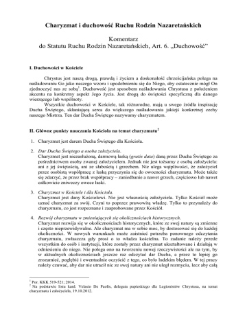 Charyzmat i duchowość Ruchu Rodzin Nazaretańskich Komentarz do Statutu Ruchu Rodzin Nazaretańskich, Art. 6. „Duchowość” I. Duchowości w Kościele Chrystus jest naszą drogą, prawdą i życiem a doskonałość chrześcijańska polega na naśladowaniu Go jako naszego wzoru i upodobnieniu się do Niego, aby ostatecznie mógł On zjednoczyć nas ze sobą1. Duchowość jest sposobem naśladowania Chrystusa z położeniem akcentu na konkretny aspekt Jego życia. Jest drogą do świętości specyficzną dla danego wierzącego lub wspólnoty. Wszystkie duchowości w Kościele, tak różnorodne, mają u swego źródła inspirację Ducha Świętego, skłaniającą serca do większego naśladowania jakiejś konkretnej cechy naszego Mistrza. Ten dar Ducha Świętego nazywamy charyzmatem. II. Główne punkty nauczania Kościoła na temat charyzmatu2 1. Charyzmat jest darem Ducha Świętego dla Kościoła. 2. Dar Ducha Świętego a osoba założyciela. Charyzmat jest niezasłużoną, darmową łaską (gratis data) daną przez Ducha Świętego za pośrednictwem osoby zwanej założycielem. Jednak nie jest tożsamy z osobą założyciela: ani z jej świętością, ani ze słabością i grzechem. Nie ulega wątpliwości, że założyciel przez osobistą współpracę z łaską przyczynia się do owocności charyzmatu. Może także się zdarzyć, że przez brak współpracy – zaniedbanie a nawet grzech, częściowo lub nawet całkowicie zniweczy owoce łaski. 3. Charyzmat w Kościele i dla Kościoła. Charyzmat jest dany Kościołowi. Nie jest własnością założyciela. Tylko Kościół może uznać charyzmat za swój. Czyni to poprzez prawowitą władzę. Tylko to przynależy do charyzmatu, co jest rozpoznane i zaaprobowane przez Kościół. 4. Rozwój charyzmatu w zmieniających się okolicznościach historycznych. Charyzmat rozwija się w okolicznościach historycznych, które ze swej natury są zmienne i często nieprzewidywalne. Ale charyzmat ma w sobie moc, by dostosować się do każdej okoliczności. W nowych warunkach może zaistnieć potrzeba ponownego odczytania charyzmatu, zwłaszcza gdy prosi o to władza kościelna. To zadanie należy przede wszystkim do osób i instytucji, które zostały przez charyzmat ukształtowane i działają w odniesieniu do niego. Nie polega ono na tworzeniu nowej rzeczywistości ale na tym, by w aktualnych okolicznościach jeszcze raz odczytać dar Ducha, a przez to lepiej go zrozumieć, pogłębić i ewentualnie oczyścić z tego, co było ludzkim błędem. W tej pracy należy czuwać, aby dar nie utracił nic ze swej natury ani nie uległ rozmyciu, lecz aby całą 1 Por. KKK 519-521; 2014. Na podstawie listu kard. Velasio De Paolis, delegata papieskiego dla Legionistów Chrystusa, na temat charyzmatu i założyciela, 19.10.2012. 2 swą wewnętrzną mocą pomagał w uświęcaniu serc i przemianie otoczenia. Chodzi o to, by w coraz to nowych okolicznościach w pełni żyć otrzymanym darem. III. Charyzmat Ruchu Rodzin Nazaretańskich Ad. 1. Charyzmat RRN darem Ducha Świętego dla Kościoła Duchowość Ruchu Rodzin Nazaretańskich jest dążeniem do komunii z Chrystusem przez komunię z Maryją. Żywimy przekonanie, że ta duchowość powstała z inspiracji Ducha Świętego i jest Jego darem dla Kościoła. A zatem ma u swoich podstaw Boży charyzmat, z którym należy wiązać powstanie RRN. Ten Boży dar uznajemy za odpowiedź Opatrzności na szczególną sytuację duchową współczesnych czasów, które charakteryzują się m.in.: a) Żywym pragnieniem świętości, czyli zjednoczenia z Bogiem, którego nie jest w stanie osłabić doświadczenie ludzkiej słabości i grzeszności. Towarzyszy mu często poszukiwanie duchowych przewodników na tej drodze. b) Rozpowszechnieniem się duchowości zawierzenia Matce Bożej, którą żył i której nauczał bł. Jan Paweł II (w oparciu o św. Ludwika Grignion de Montfort), a także inni wielcy czciciele Maryi, którzy wywarli istotny wpływ na historię współczesną, zwłaszcza kard. Stefan Wyszyński i św. Maksymilian Kolbe. c) Powszechną w wielu środowiskach utratą poczucia grzechu idącą w parze z kwestionowaniem prawa Bożego i naturalnego, nawet przez niektórych wiernych Kościoła, przy jednoczesnym coraz większym uwikłaniu w grzech całych grup społecznych i ekspansji „cywilizacji śmierci”. d) Wielkim głodem, często nieuświadomionym, Bożego miłosierdzia, zwłaszcza udzielanego w sakramencie pokuty przez posługę kapłana, co wyraża się m.in. w upowszechnieniu się orędzia o Bożym miłosierdziu, przekazanego przez św. Faustynę. e) Poszukiwaniem obecności Boga – zwłaszcza w Eucharystii i na modlitwie, ale także w codziennych, zwykłych wydarzeniach – płynącym z wewnętrznego przekonania o powołaniu człowieka do nadprzyrodzoności i bezpośredniej osobistej więzi z tajemnicą Boga. Wyraża się ono m.in. w otwarciu na piękno liturgii i doświadczenie działania Ducha Świętego we wspólnocie. Nie jest w stanie go stłumić powszechna głęboka laicyzacja, a zwłaszcza utrata poczucia nadprzyrodzonego wymiaru życia małżeńskiego i rodzinnego. f) Odnowioną świadomością świętości małżeństwa, rodziny i życia, zwłaszcza dzięki nauczaniu bł. Jana Pawła II. Towarzyszy jej poszukiwanie głębokich więzi międzyludzkich w braterskiej wspólnocie. g) Odkryciem aktywnej roli świeckich w życiu Kościoła i w dziele ewangelizacji – w duchu nauczania Soboru Watykańskiego II. h) Poszukiwaniem pogłębionej formacji kapłańskiej w braterskiej wspólnocie. Pragniemy, aby dar duchowości RRN rozwijał się w Kościele i dla dobra Kościoła pod opieką jego pasterzy – Ojca Świętego, biskupów i kapłanów. Ad. 2. Założyciele RRN Ruch Rodzin Nazaretańskich zrodził się wokół konfesjonału, jako owoc posługi sakramentu pokuty i kierownictwa duchowego sprawowanej przez ks. Tadeusza Dajczera we współpracy z ks. Andrzejem Buczelem. Tych dwó